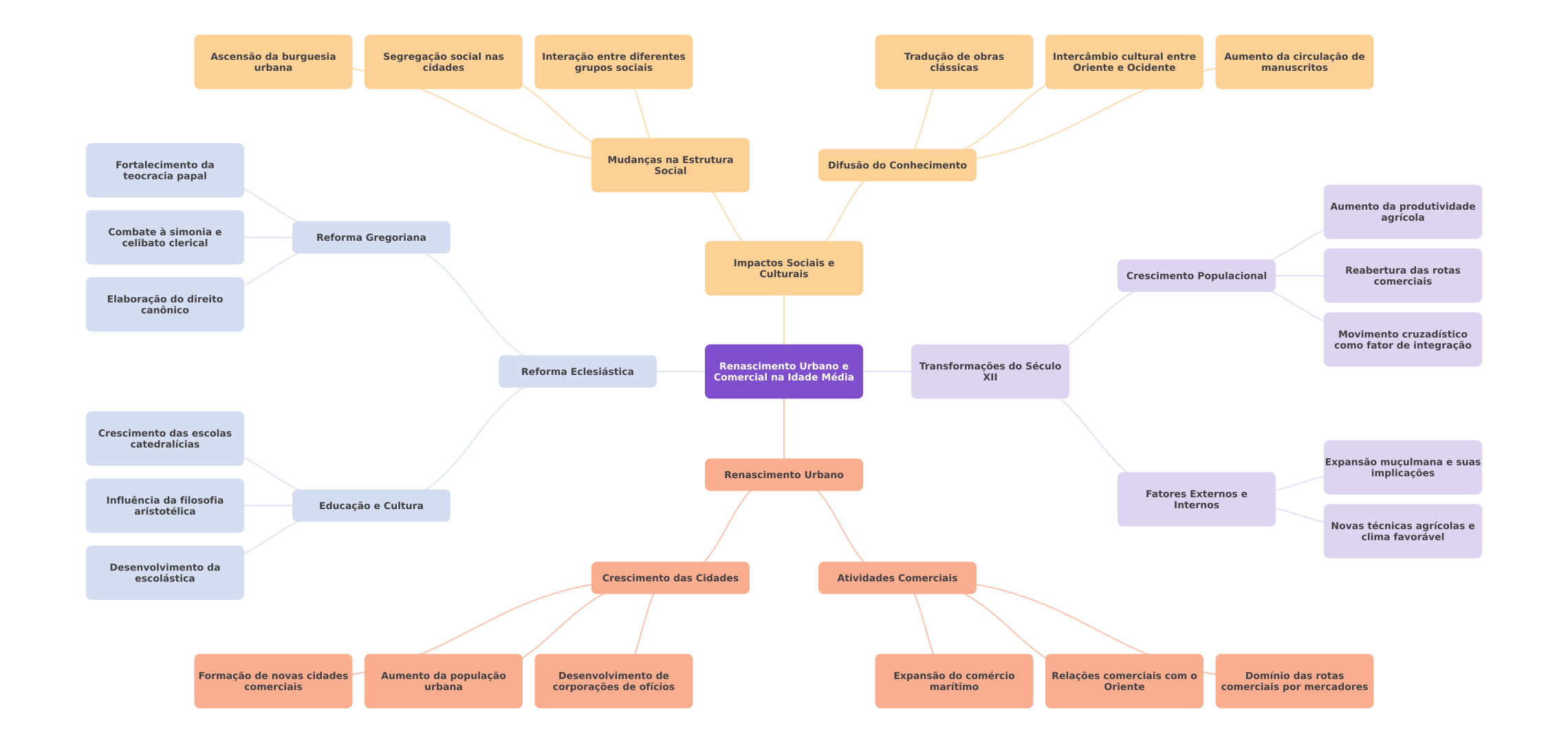 Ascensão da burguesia Segregação social nas Interação entre diferentes Tradução de obras Intercâmbio cultural entre Aumento da circulação de urbana cidades grupos sociais clássicas Oriente e Ocidente manuscritos Fortalecimento da Mudanças na Estrutura Difusão do Conhecimento Social teocracia papal Aumento da produtividade agrícola Combate à simonia e celibato clerical Reforma Gregoriana Impactos Sociais e Culturais Reabertura das rotas Crescimento Populacional comerciais Elaboração do direito canônico Movimento cruzadístico como fator de integração Renascimento Urbano e Reforma Eclesiástica Transformações do Século Comercial na Idade Média XII Crescimento das escolas catedralícias Expansão muçulmana e suas Renascimento Urbano implicações Fatores Externos e Influência da filosofia Educação e Cultura Internos aristotélica Novas técnicas agrícolas e clima favorável Desenvolvimento da escolástica Crescimento das Cidades Atividades Comerciais Formação de novas cidades Aumento da população Desenvolvimento de Expansão do comércio Relações comerciais com Domínio das rotas comerciais urbana corporações de ofícios marítimo Oriente comerciais por mercadores