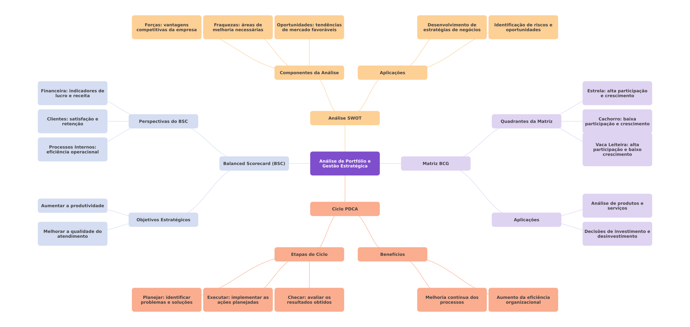 Forças: vantagens Fraquezas: áreas de Oportunidades: tendências Desenvolvimento de Identificação de riscos e competitivas da empresa melhoria necessárias de mercado favoráveis estratégias de negócios oportunidades Componentes da Análise Aplicações Financeira: indicadores de Estrela: alta participação lucro e receita e crescimento Clientes: satisfação e Análise SWOT Cachorro: baixa Perspectivas do BSC Quadrantes da Matriz retenção participação e crescimento Vaca Leiteira: alta Processos Internos: eficiência operacional participação e baixo crescimento Análise de Portfólio e Balanced Scorecard (BSC) Matriz BCG Gestão Estratégica Aumentar a produtividade Análise de produtos e Ciclo PDCA serviços Objetivos Estratégicos Aplicações Melhorar a qualidade do Decisões de investimento e atendimento desinvestimento Etapas do Ciclo Benefícios Planejar: identificar Executar: implementar as Checar: avaliar os Melhoria contínua dos Aumento da eficiência problemas e soluções ações planejadas resultados obtidos processos organizacional