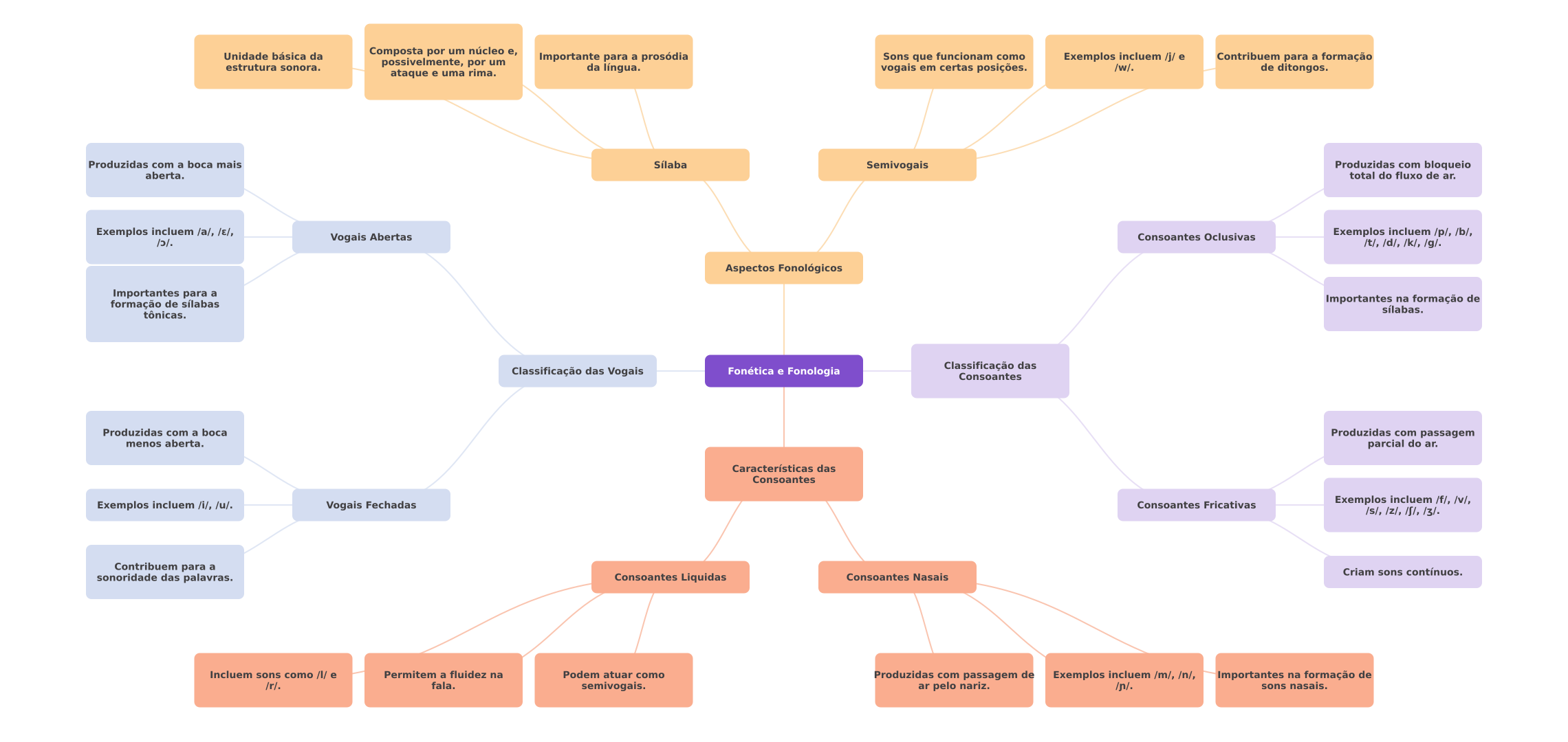 Unidade básica da Composta por um núcleo e, possivelmente, por um Importante para a prosódia Sons que funcionam como Exemplos incluem /j/ e Contribuem para a formação estrutura sonora. ataque e uma rima. da língua. vogais em certas posições. /w/. de ditongos. Produzidas com a boca mais Sílaba Semivogais Produzidas com bloqueio aberta. total do fluxo de ar. Exemplos incluem /a/, /E/, Vogais Abertas Consoantes Oclusivas Exemplos incluem /p/, /b/, /t/, /d/, /k/, /g/. Aspectos Fonológicos Importantes para a formação de sílabas Importantes na formação de sílabas. tônicas. Classificação das Vogais Fonética e Fonologia Classificação das Consoantes Produzidas com a boca Produzidas com passagem menos aberta. parcial do ar. Características das Consoantes Exemplos incluem /i/, /u/. Vogais Fechadas Consoantes Fricativas Exemplos incluem /f/, /v/, /s/, /z/, Contribuem para a Criam sons contínuos. sonoridade das palavras. Consoantes Liquidas Consoantes Nasais Incluem sons como /\/ e Permitem a fluidez na Podem atuar como Produzidas com passagem de Exemplos incluem /m/, /n/, Importantes na formação de /r/. fala. semivogais. ar pelo nariz. sons nasais.