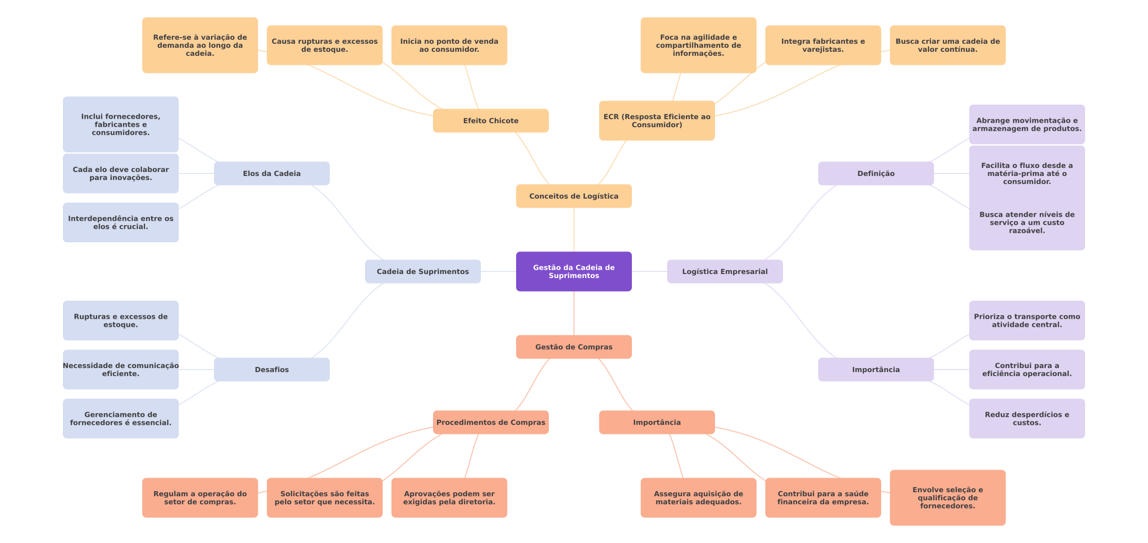 Refere-se à variação de Inicia no ponto de venda Foca na agilidade e demanda ao longo da Causa rupturas e excessos Integra fabricantes e Busca criar uma cadeia de de estoque. ao consumidor. de cadeia. varejistas. valor contínua. informações. Inclui fornecedores, Efeito Chicote ECR (Resposta Eficiente ao fabricantes e Abrange movimentação e Consumidor) consumidores. armazenagem de produtos. Facilita fluxo desde a Cada elo deve colaborar Elos da Cadeia Definição matéria-prima até para inovações. consumidor. Conceitos de Logística Busca atender níveis de Interdependência entre os elos é crucial. serviço a um custo razoável. Gestão da Cadeia de Cadeia de Suprimentos Logística Empresarial Suprimentos Rupturas e excessos de Prioriza transporte como estoque. atividade central. Gestão de Compras Necessidade de comunicação Desafios eficiente. Importância Contribui para a eficiência operacional. Gerenciamento de Reduz desperdícios e fornecedores é essencial. Procedimentos de Compras Importância custos. Regulam a operação do Solicitações são feitas Aprovações podem ser Assegura aquisição de Contribui para a saúde Envolve seleção e setor de compras. pelo setor que necessita. financeira da empresa. qualificação de exigidas pela diretoria. materiais adequados. fornecedores.