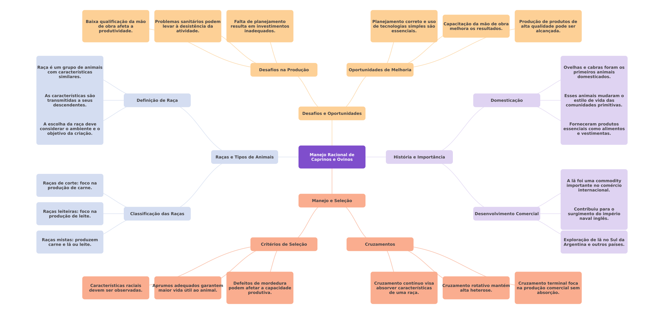 Baixa qualificação da mão Problemas sanitários podem Falta de planejamento Planejamento correto e uso de obra afeta a levar à desistência da Capacitação da mão de obra Produção de produtos de resulta em investimentos de tecnologias simples são melhora os resultados. alta qualidade pode ser produtividade. atividade. inadequados. essenciais. alcançada. Raça é um grupo de animais Ovelhas e cabras foram os com características Desafios na Produção Oportunidades de Melhoria primeiros animais similares. domesticados. As características são Esses animais mudaram transmitidas a seus Definição de Raça Domesticação estilo de vida das descendentes. comunidades primitivas. Desafios e Oportunidades A escolha da raça deve Forneceram produtos considerar ambiente e essenciais como alimentos objetivo da criação. e vestimentas. Raças e Tipos de Animais Manejo Racional de História e Importância Caprinos e Ovinos Raças de corte: foco na A foi uma commodity importante no comércio produção de carne. internacional. Manejo e Seleção Raças leiteiras: foco na Contribuiu para Classificação das Raças Desenvolvimento Comercial produção de leite. surgimento do império naval inglês. Raças mistas: produzem Exploração de lã no Sul da carne e lã ou leite. Critérios de Seleção Cruzamentos Argentina e outros países. Defeitos de mordedura Cruzamento contínuo visa Cruzamento terminal foca Características raciais Aprumos adequados garanten Cruzamento rotativo mantém podem afetar a capacidade absorver características devem ser observadas. maior vida útil ao animal. alta heterose. na produção comercial sem produtiva. de uma raça. absorção.