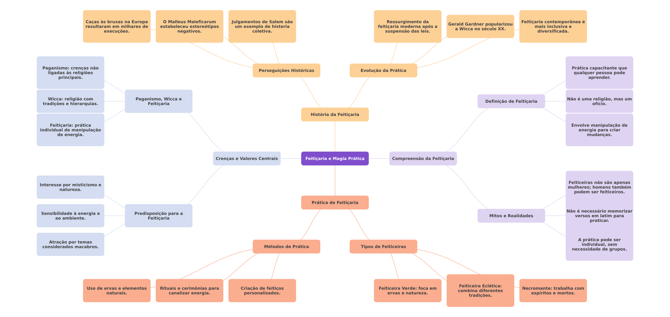 Caças às bruxas na Europa Malleus Maleficarum Julgamentos de Salem são Ressurgimento da resultaram em milhares de estabeleceu estereótipos um exemplo de histeria Gerald Gardner popularizou Feitiçaria contemporânea é feitiçaria moderna após a mais inclusiva e a Wicca no século execuções. negativos. coletiva. suspensão das leis. diversificada. Paganismo: crenças não Perseguições Históricas Evolução da Prática Prática capacitante que ligadas às religiões qualquer pessoa pode principais. aprender. Wicca: religião com Paganismo, Wicca e Definição de Feitiçaria Não é uma religião, mas um tradições e hierarquias. Feitiçaria ofício. História da Feitiçaria Feitiçaria: prática Envolve manipulação de individual de manipulação energia para criar de energia. mudanças. Crenças e Valores Centrais Feitiçaria e Magia Prática Compreensão da Feitiçaria Feiticeiras não são apenas Interesse por misticismo e mulheres; homens também natureza. podem ser feiticeiros. Prática de Feitiçaria Não é necessário memorizar Sensibilidade à energia e Predisposição para a Mitos e Realidades ao ambiente. versos em latim para Feitiçaria praticar. Atração por temas A prática pode ser considerados macabros. Métodos de Prática Tipos de Feiticeiras individual, sem necessidade de grupos. Feiticeira Eclética: Uso de ervas e elementos Rituais e cerimônias para Criação de feitiços Feiticeira Verde: foca em Necromante: trabalha com combina diferentes naturais. canalizar energia. personalizados. ervas e natureza. tradições. espíritos e mortos.