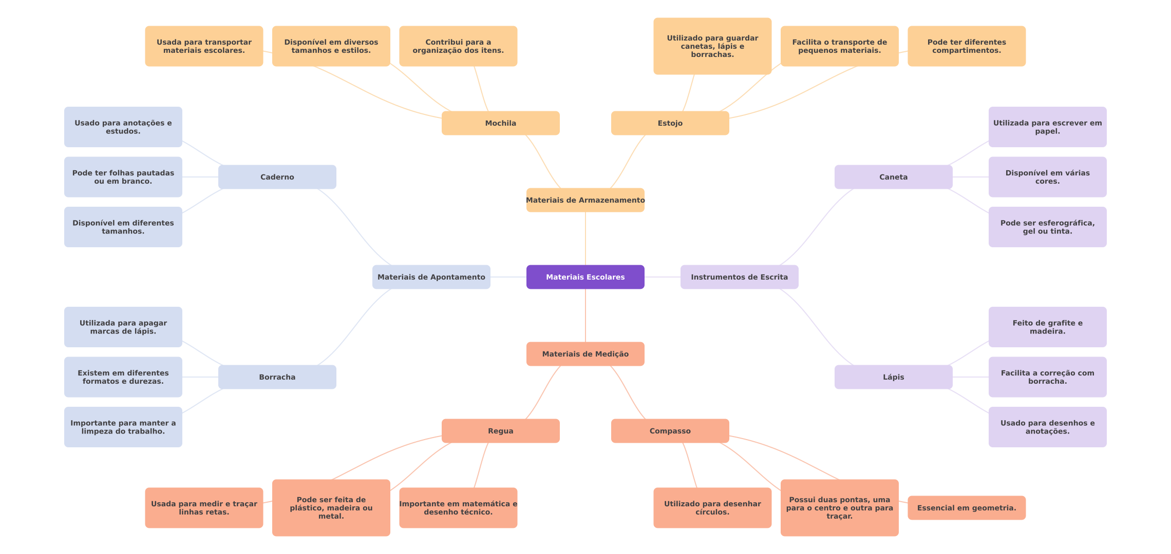 Usada para transportar Disponível em diversos Contribui para a Utilizado para guardar Facilita transporte de Pode ter diferentes materiais escolares. tamanhos e estilos. organização dos itens. canetas, lápis e borrachas. pequenos materiais. compartimentos. Usado para anotações e Mochila Estojo Utilizada para escrever em estudos. papel. Pode ter folhas pautadas Caderno Caneta Disponível em várias ou em branco. cores. Materiais de Armazenamento Disponível em diferentes Pode ser esferográfica, tamanhos. gel ou tinta. Materiais de Apontamento Materiais Escolares Instrumentos de Escrita Utilizada para apagar Feito de grafite e marcas de lápis. madeira. Materiais de Medição Existem em diferentes Borracha formatos e durezas. Lápis Facilita a correção com borracha. Importante para manter a Usado para desenhos e limpeza do trabalho. Regua Compasso anotações. Pode ser feita de Usada para medir e traçar plástico, madeira ou Importante em matemática e Utilizado para desenhar Possui duas pontas, uma linhas retas. desenho técnico. círculos. para centro e outra para Essencial em geometria. metal. traçar.