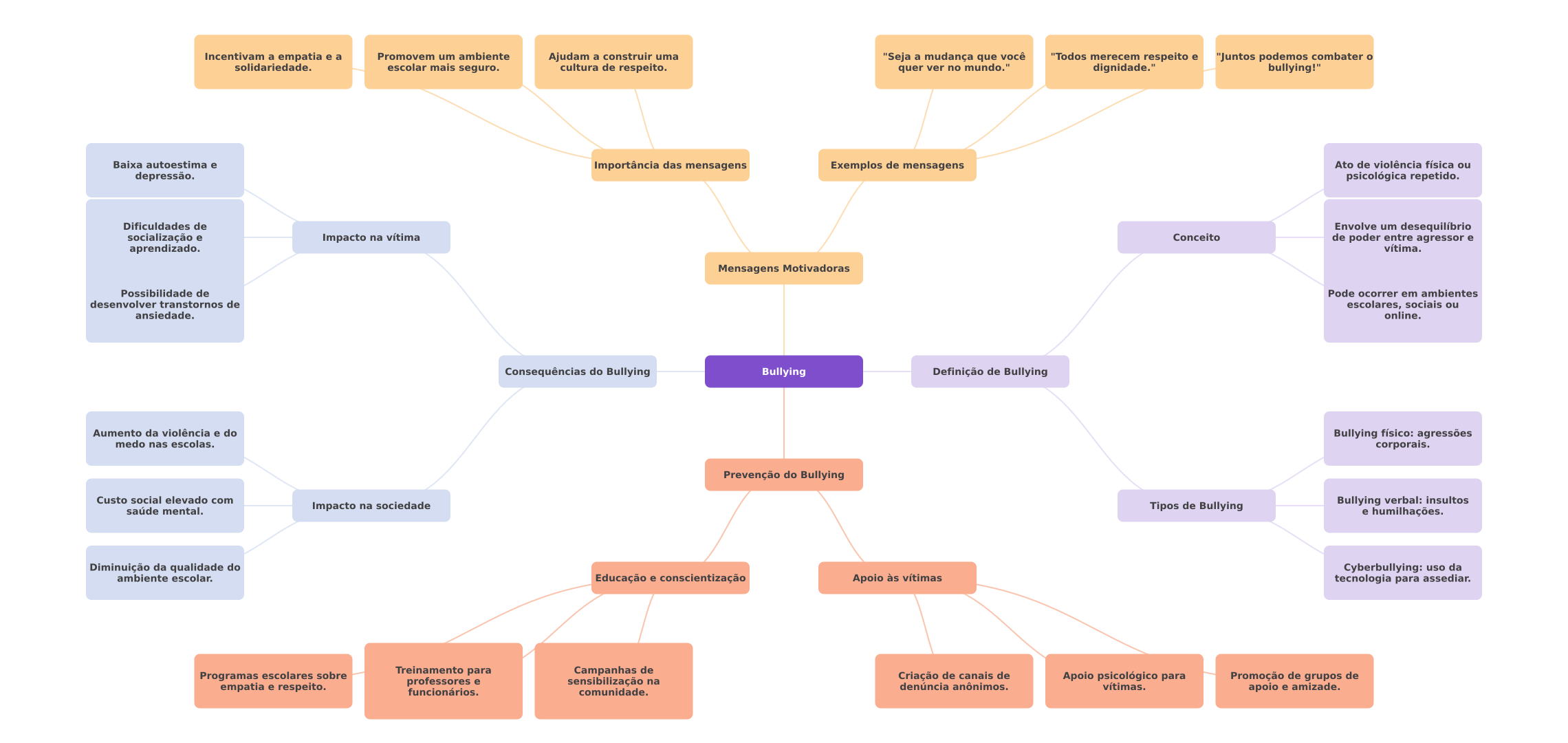 Incentivam a empatia e a Promovem um ambiente Ajudam a construir uma "Seja a mudança que você "Todos merecem respeito e "Juntos podemos combater solidariedade. escolar mais seguro. cultura de respeito. quer ver no mundo." dignidade.' bullying!" Baixa autoestima e Importância das mensagens Exemplos de mensagens Ato de violência física ou depressão. psicológica repetido. Dificuldades de Envolve um desequilíbrio socialização e Impacto na vítima Conceito de poder entre agressor e aprendizado. vítima. Mensagens Motivadoras Possibilidade de Pode ocorrer em ambientes desenvolver transtornos de escolares, sociais ou ansiedade. online. Consequências do Bullying Bullying Definição de Bullying Aumento da violência e do Bullying físico: agressões medo nas escolas. corporais. Prevenção do Bullying Custo social elevado com saúde mental. Impacto na sociedade Tipos de Bullying Bullying verbal: insultos e humilhações. Diminuição da qualidade do Cyberbullying: uso da ambiente escolar. Educação e conscientização Apoio às vítimas tecnologia para assediar. Programas escolares sobre Treinamento para Campanhas de sensibilização na Criação de canais de professores e Apoio psicológico para Promoção de grupos de empatia e respeito. denúncia anônimos. vítimas. funcionários. comunidade. apoio e amizade.