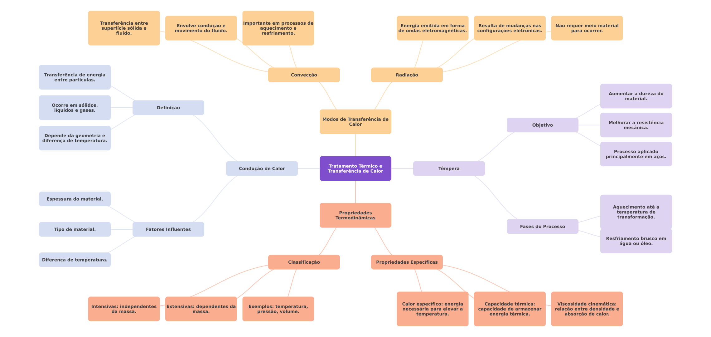 Transferência entre Envolve condução e Importante em processos de superfície sólida e Energia emitida em forma Resulta de mudanças nas Não requer meio material movimento do fluido. aquecimento e fluido. resfriamento. de ondas eletromagnéticas. configurações eletrônicas. para ocorrer. Transferência de energia Convecção Radiação entre partículas. Aumentar a dureza do material. Ocorre em sólidos, líquidos e gases. Definição Modos de Transferência de Calor Melhorar a resistência Objetivo mecânica. Depende da geometria e diferença de temperatura. Processo aplicado principalmente em aços. Tratamento Térmico e Condução de Calor Transferência de Calor Têmpera Espessura do material. Aquecimento até a Propriedades temperatura de Termodinâmicas transformação. Fases do Processo Tipo de material. Fatores Influentes Resfriamento brusco em água ou óleo. Diferença de temperatura. Classificação Propriedades Específicas Extensivas: dependentes da Calor específico: energia Capacidade térmica: Viscosidade cinemática: Intensivas: independentes Exemplos: temperatura, da massa. necessária para elevar a capacidade de armazenar relação entre densidade e massa. pressão, volume. temperatura. energia térmica. absorção de calor.