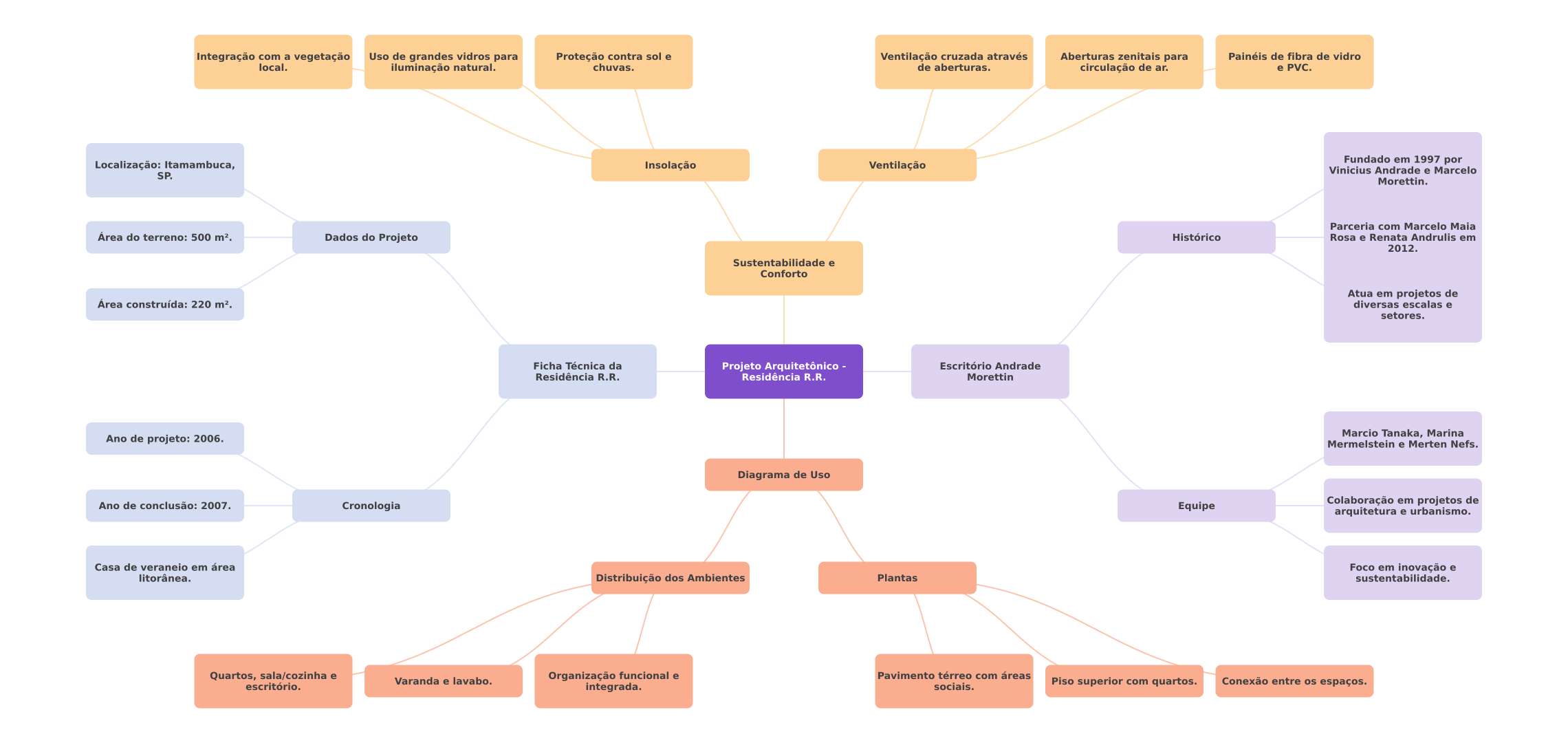 Integração com a vegetação Uso de grandes vidros para Proteção contra sol e Ventilação cruzada através Aberturas zenitais para Painéis de fibra de vidro local. iluminação natural. chuvas. de aberturas. circulação de ar. e PVC. Fundado em 1997 por Localização: Itamambuca, Insolação Ventilação Vinicius Andrade e Marcelo SP. Morettin. Parceria com Marcelo Maia Área do terreno: 500 Dados do Projeto Histórico Rosa e Renata Andrulis em 2012. Sustentabilidade e Conforto Atua em projetos de Área construída: 220 diversas escalas e setores. Ficha Técnica da Projeto Arquitetônico Escritório Andrade Residência R.R. Residência R.R. Morettin Marcio Tanaka, Marina Ano de projeto: 2006. Mermelstein e Merten Nefs. Diagrama de Uso Ano de conclusão: 2007. Cronologia Equipe Colaboração em projetos de arquitetura e urbanismo. Casa de veraneio em área Foco em inovação e litorânea. Distribuição dos Ambientes Plantas sustentabilidade. Quartos, sala/cozinha e Organização funcional e Pavimento térreo com áreas Varanda e lavabo. escritório. integrada. sociais. Piso superior com quartos. Conexão entre os espaços.