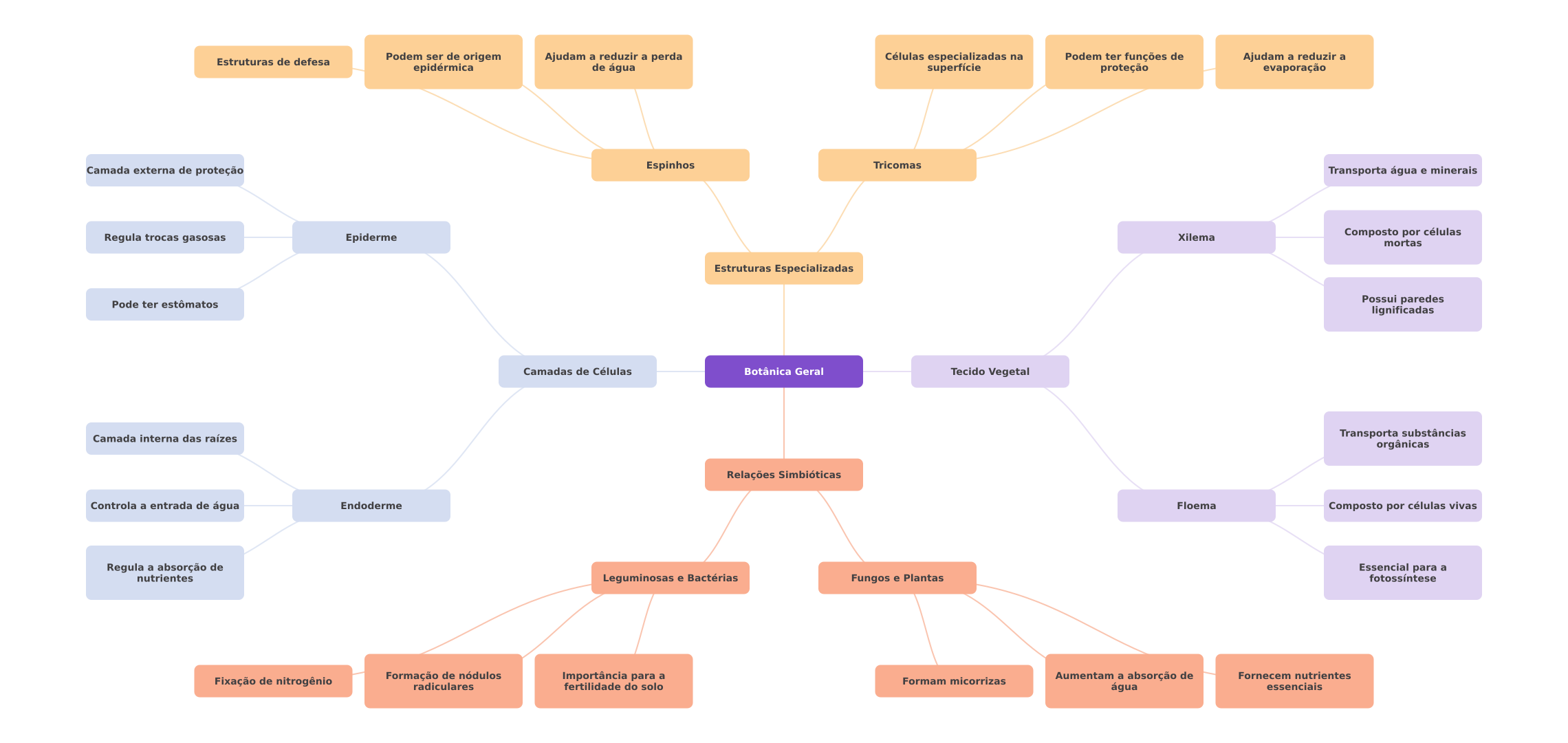 Estruturas de defesa Podem ser de origem Ajudam a reduzir a perda Células especializadas na Podem ter funções de Ajudam a reduzir a epidérmica de água superfície proteção evaporação Camada externa de proteção Espinhos Tricomas Transporta água e minerais Regula trocas gasosas Epiderme Xilema Composto por células mortas Estruturas Especializadas Pode ter estômatos Possui paredes lignificadas Camadas de Células Botânica Geral Tecido Vegetal Camada interna das raízes Transporta substâncias orgânicas Relações Simbióticas Controla a entrada de água Endoderme Floema Composto por células vivas Regula a absorção de Essencial para a nutrientes Leguminosas e Bactérias Fungos e Plantas fotossíntese Fixação de nitrogênio Formação de nódulos Importância para a Formam micorrizas Aumentam a absorção de Fornecem nutrientes radiculares fertilidade do solo água essenciais