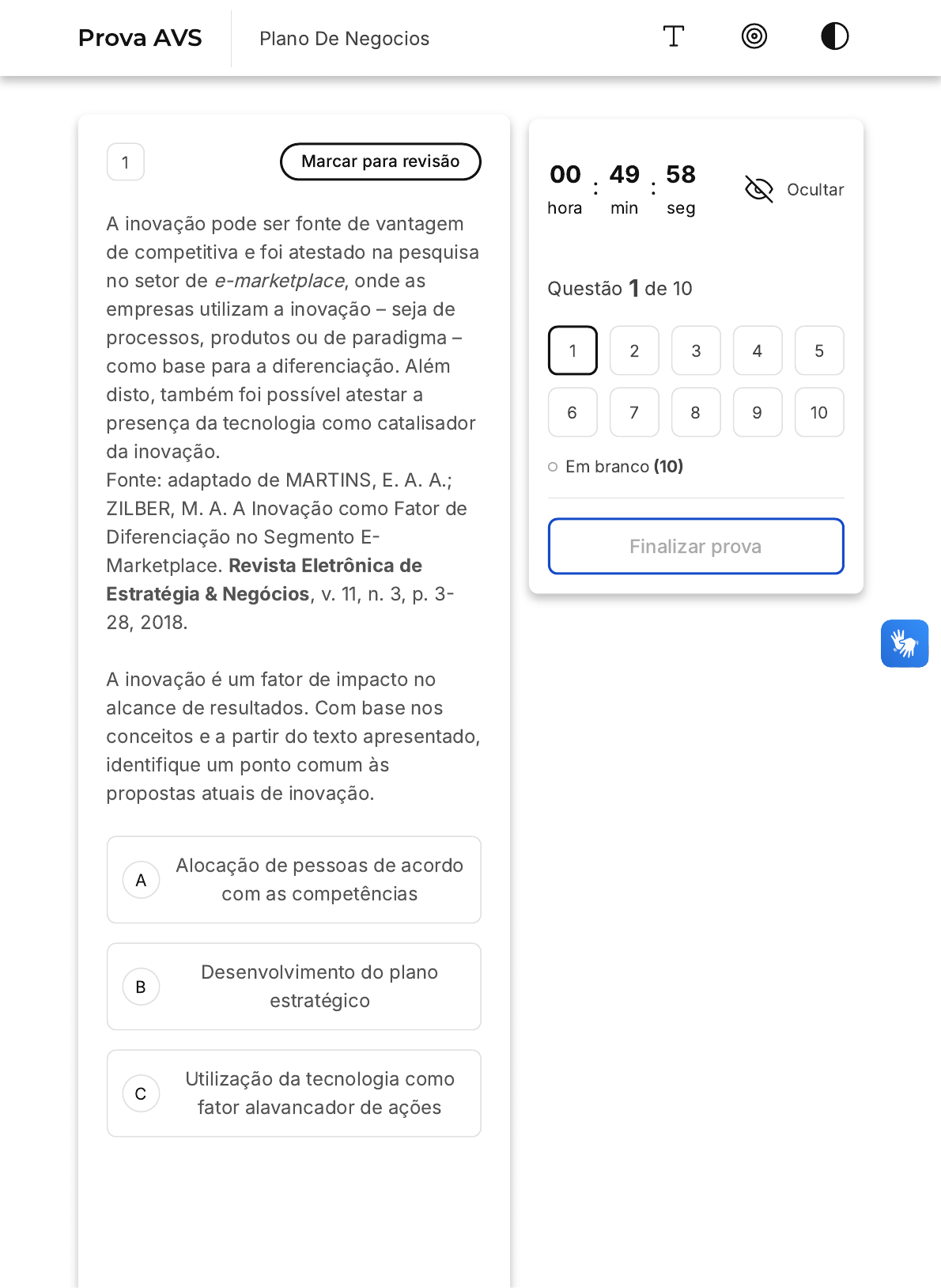 A B C 1 Marcar para revisão A inovação pode ser fonte de vantagem de competitiva e foi atestado na pesquisa no setor de e-marketplace, onde as empresas utilizam a inovação – seja de processos, produtos ou de paradigma – como base para a diferenciação. Além disto, também foi possível atestar a presença da tecnologia como catalisador da inovação. Fonte: adaptado de MARTINS, E. A. A.; ZILBER, M. A. A Inovação como Fator de Diferenciação no Segmento E- Marketplace. Revista Eletrônica de Estratégia & Negócios, v. 11, n. 3, p. 3- 28, 2018. A inovação é um fator de impacto no alcance de resultados. Com base nos conceitos e a partir do texto apresentado, identifique um ponto comum às propostas atuais de inovação. Alocação de pessoas de acordo com as competências Desenvolvimento do plano estratégico Utilização da tecnologia como fator alavancador de ações 00 hora : 49 min : 58 seg Ocultar Questão 1 de 10 Em branco (10) Finalizar prova 1 2 3 4 5 6 7 8 9 10 Prova AVS Plano De Negocios D E A B C D E Adoção de métodos ágeis de gestão Gerenciamento de riscos corporativos 2 Marcar para revisão A experiência do cliente é uma abordagem que trata da percepção do cliente em relação ao atendimento de suas demandas. Qual das alternativas de respostas corresponde a um ponto relevante da experiência do cliente que encontra respaldo nas bases conceituais do marketing? Preferências do consumidor. Engajamento do cliente. Atitude proativa. Percepção cognitiva. Necessidades e expectativas do cliente. 3 Marcar para revisão A pesquisa de mercado é uma ferramenta utilizada por empresas e A B C D E organizações para coletar informações sobre seu público-alvo, concorrência, tendências de mercado e outros fatores que podem influenciar suas operações. Esta pesquisa pode ser conduzida através de várias metodologias, como questionários, entrevistas, observação, entre outros, e seus resultados podem auxiliar a empresa a tomar decisões estratégicas, identificar oportunidades de mercado, melhorar produtos e serviços e entender as necessidades e desejos dos clientes. Com base no texto apresentado, assinale a alternativa mais adequada. A pesquisa de mercado pode ajudar uma empresa a entender as necessidades e desejos de seus clientes. Uma pesquisa de mercado é geralmente conduzida através de observação direta do mercado, sem a necessidade de interação com o público-alvo ou outras fontes de informação. A pesquisa de mercado deve ser realizada por analistas econômicos. A pesquisa de mercado é feita para calcular viabilidade econômica de empreendimentos. A entrevista não faz parte de uma pesquisa de mercado. 4 Marcar para revisão Este estudo objetivou verificar o alinhamento da intensidade de uso de instrumentos do Sistema de Controle Gerencial com o nível da inovação de produtos e processos. Assim, pesquisa descritiva com abordagem quantitativa foi feita a partir de um levantamento com gestores de empresas incubadas. No mapeamento da intensidade de uso dos instrumentos de controle gerencial é notável a preocupação dos gestores com o planejamento estratégico, com destaque para definição de metas estratégicas (não financeiras) e plano de portfólio de produtos/plano sobre produtos futuros. No entanto, o uso dos instrumentos do planejamento financeiro também obteve indicações de uso com valores altos da escala. Portanto, as empresas analisadas acabam por vezes utilizando os instrumentos apontados de forma equitativa para a consecução dos objetivos. Os resultados mostram ainda que as empresas pesquisadas apresentam um nível mais elevado no lançamento de novos produtos para o mercado e no aperfeiçoamento daqueles já existentes, no que tange à inovação de produtos, cujas médias estão muito próximas das assertivas relativas à inovação de processos. Esse cenário pode decorrer do tempo de fundação delas, uma vez que, quando uma companhia está iniciando suas atividades – mesmo naquelas com alto potencial de crescimento e inovação –, a preocupação primeira é na geração de receita, ou seja, vai direcionar esforços para a continuidade de suas operações e, A B C D E consequentemente, crescer. (LOPES, I. F.; BEUREN, I. M.; MARTINS, G. D. Alinhamento entre Uso de Instrumentos do Sistema de Controle Gerencial e Inovação de Produtos e Processos. Revista Organizações em Contexto, v. 14, n. 27, p. 1-27, 2018.) A utilização de incubadoras de empresas contribui para o amadurecimento da gestão. Com base no texto apresentado, indique um instrumento de gestão relevante para as organizações. Preocupação com a gestão de pessoas Mensuração de resultados Planejamento Estratégico Capacitação e formação de pessoas Desenvolvimento de práticas de motivação 5 Marcar para revisão O empreendedorismo pode se manifestar de diversas formas, de acordo com a área de atuação. Qual característica o empreendedorismo social tem em comum com o empreendedorismo sustentável? A B C D E Investimento de organizações internacionais Foco na viabilidade econômica do empreendimento Demandam esforços para atender questões sociais Intensa utilização de grupos sociais nos seus trabalhos Baixos investimentos em infraestrutura 6 Marcar para revisão Informações sobre a qualidade dos produtos, processos produtivos sustentáveis e origem das matérias- primas utilizadas em sua produção podem agregar valor e auxiliar na abertura de mercados mais exigentes, que aceitam pagar mais por produtos ambientalmente corretos e socialmente justos. (adaptado de YANO, I. H.; CASTRO, A.; GRANELLI, M. A.; SILVA, F. C. Fortalecimento de marca empresarial por meio de práticas sustentáveis, marketing digital e tecnologia Blockchain. Revista de Gestão e Secretariado, v. 14, n. 1, p. 802-819, 2023.) A sustentabilidade vem sendo internalizada de diversas formas pelas organizações. Sob esta ótica, qual tem sido a diferença no comporta