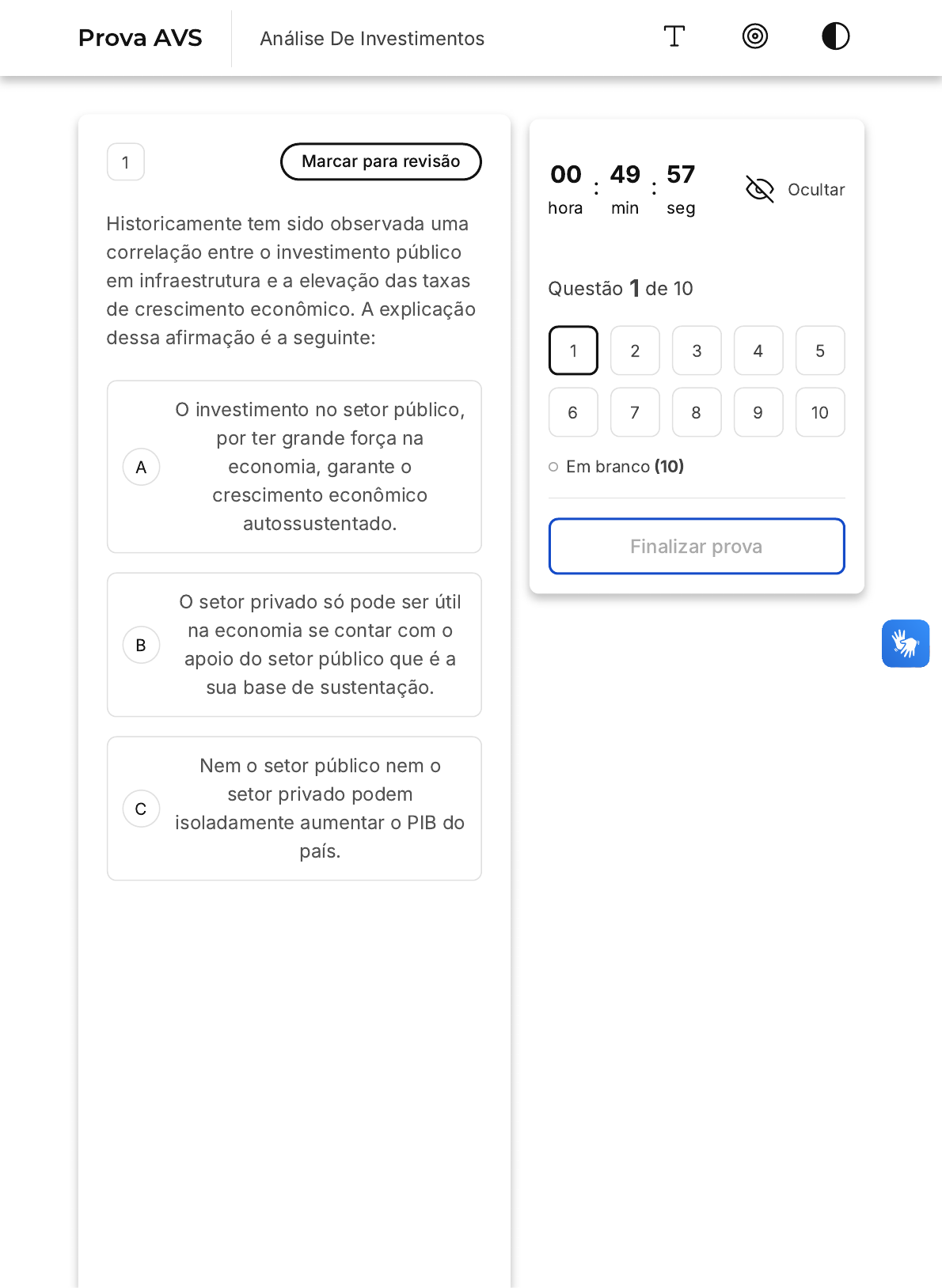 A B C 1 Marcar para revisão Historicamente tem sido observada uma correlação entre o investimento público em infraestrutura e a elevação das taxas de crescimento econômico. A explicação dessa afirmação é a seguinte: O investimento no setor público, por ter grande força na economia, garante o crescimento econômico autossustentado. O setor privado só pode ser útil na economia se contar com o apoio do setor público que é a sua base de sustentação. Nem o setor público nem o setor privado podem isoladamente aumentar o PIB do país. 00 hora : 49 min : 57 seg Ocultar Questão 1 de 10 Em branco (10) Finalizar prova 1 2 3 4 5 6 7 8 9 10 Prova AVS Análise De Investimentos D E A B C O investimento do setor público em infraestrutura cria a base necessária à expansão das atividades do setor privado, responsável pela produção de bens e serviços. O investimento do setor público em infraestrutura gera emprego de mão de obra diminuindo a taxa de desemprego no país. 2 Marcar para revisão A modalidade de contrato take if offered se refere a uma condição contratual específica entre as partes envolvidas em um projeto, estabelecendo certos critérios para aquisição de produtos ou serviços. Qual é o nome que descreve corretamente a característica de contrato onde o comprador é obrigado a adquirir apenas o que a empresa estiver apta a produzir? Contrato take if offered. Contrato build-operate-transfer. Contrato de aliança estratégica. D E A B C D E Contrato de concessão. Contrato de leasing financeiro. 3 Marcar para revisão - Pode-se dizer da SPE (sociedade de propósito específico): Constitui-se, necessariamente, como uma sociedade limitada ou sociedade anônima. É, na verdade, uma roupagem que, a princípio, qualquer tipo de sociedade prevista na legislação brasileira pode utilizar para alcançar determinado objetivo. Não deve ter um objeto social específico e prazo determinado que limite sua existência ao cumprimento do objeto. Não pode ser uma sociedade simples. Não pode ser uma sociedade limitada. 4 Marcar para revisão A B C D E Uma das etapas mais importantes do roteiro para avaliação de empresas é a análise de demonstrativos financeiros, que além de permitir o entendimento do desempenho econômico-financeiro passado, auxilia na elaboração de fluxos futuros. Nesse sentido, a análise de demonstrativos financeiros de empresas de capital fechada é geralmente: Menos complexa em função do tamanho das empresas Mais simples do que no caso das empresas abertas Similar a análise efetuada no caso das empresas abertas. Mais complexa em função de má qualidade da informação Mais fácil quando a empresa opta pelo regime do lucro presumido. 5 Marcar para revisão A abordagem de avaliação relativa é amplamente usada no valuation devido à sua simplicidade e rapidez. Como os ativos são avaliados na metodologia de avaliação relativa? A B C D E A B Considerando o potencial de fluxo de caixa futuro das empresas avaliadas. Com base na análise dos fluxos de caixa descontados das empresas. Através da comparação com o histórico de demonstrativos financeiros. Utilizando índices de empresas comparáveis para a comparação. Avaliando os ativos pela relação dos custos de produção com outras empresas do setor. 6 Marcar para revisão Valuation é o conjunto de técnicas e métodos usados para determinar o valor justo de uma empresa e ações. Uma dessas técnicas consiste na análise comparativa com outras empresas para determinar se as ações estão sub ou sobre avaliadas. Assinale a alternativa que indica o nome desse método de valuation. Avaliação relativa Fluxo de caixa livre do acionista C D E A B C Fluxo de caixa livre da firma Método do fluxo de caixa descontado Análise setorial 7 Marcar para revisão A avaliação relativa é um dos métodos utilizados no valuation. Qual das alternativas abaixo corresponde à descrição correta do uso da avaliação relativa no processo de valuation? Comparação do valor da empresa com o seu fluxo de caixa futuro. Análise dos ativos tangíveis de uma empresa e comparação com o valor de mercado. Avaliação do potencial de crescimento da empresa no mercado financeiro. D E A B C D E Estimativa do valor da empresa com base em projeções de lucro líquido. Comparação de métricas financeiras e operacionais da empresa com outras do mesmo setor para avaliar o valor relativo. 8 Marcar para revisão A PAN é uma empresa varejista e seus sócios gostariam de saber o custo de capital adequado ao risco do negócio. Considerando um beta para PAN de 1,10, um CDS de 2,5%, uma alíquota de IR&CS de 34%, um capital próprio de $ 1.000 mil e $ 500 mil, uma taxa livre de risco de 8% e um prêmio pelo risco de mercado de 5%, podemos dizer que o custo de capital próprio estimado para PAN seria de: 11,33% ao ano. 10,50% ao ano. 12,00% ao ano. 13,50% ao ano. 15,00 ao ano. A B C D E 9 Marcar para revisão As Sociedades de Propósito Específico (SPEs) são estruturas legais frequentemente utilizadas em diversos setores, com diferentes características e finalidades. Qual das seguintes afirmações sobre as SPEs no contexto brasileiro é verdadeira? No Brasil, as SPEs são predominantemente adotadas por grandes corporações para projetos multifuncionais. As SPEs no Brasil têm pouca relevância e são utilizadas apenas em setores específicos. É comum criar uma SPE para cada empreendimento no contexto brasileiro. As SPEs no Brasil isentam os sócios de qualquer responsabilidade por possíveis perdas financeiras. A inspiração das SPEs no Brasil veio do modelo europeu de parcerias público-privadas (PPPs). 10 Marcar para revisão Durante a execução de um empreendimento gerido por uma SPE, um A B C D E fornecedor credor busca responsabilizar os sócios da sociedade após inadimplência contratual. Em sua defesa, os sócios argumentam que a SPE possui autonomia jurídica e que não são responsáveis pelas dí