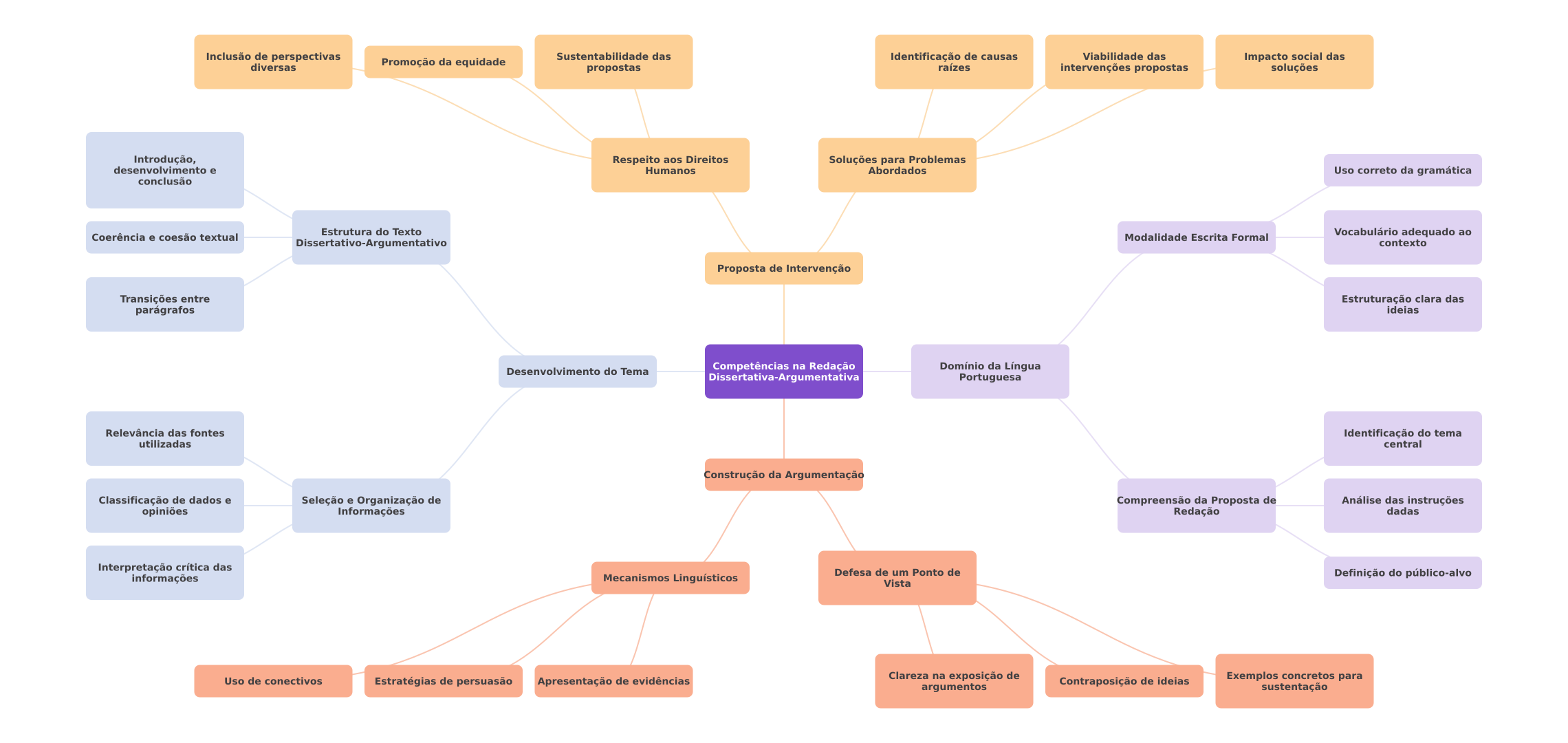 Inclusão de perspectivas Sustentabilidade das Promoção da equidade Identificação de causas Viabilidade das Impacto social das diversas propostas raízes intervenções propostas soluções Introdução, Respeito aos Direitos Soluções para Problemas desenvolvimento e Humanos Abordados Uso correto da gramática conclusão Estrutura do Texto Coerência e coesão textual Modalidade Escrita Formal Vocabulário adequado ao Dissertativo-Argumentativo contexto Proposta de Intervenção Transições entre Estruturação clara das parágrafos ideias Desenvolvimento do Tema Competências na Redação Domínio da Língua Dissertativa-Argumentativa Portuguesa Relevância das fontes Identificação do tema utilizadas central Construção da Argumentação Classificação de dados e Seleção e Organização de Compreensão da Proposta de Análise das instruções opiniões Informações Redação dadas Interpretação crítica das Defesa de um Ponto de informações Mecanismos Linguísticos Definição do público-alvo Vista Uso de conectivos Estratégias de persuasão Apresentação de evidências Clareza na exposição de Contraposição de ideias Exemplos concretos para argumentos sustentação