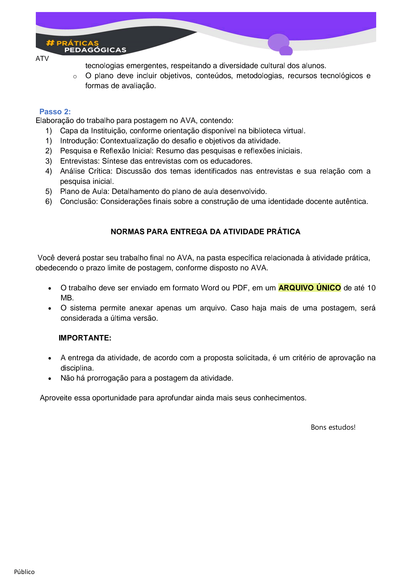 PRÁTICAS PEDAGÓGICAS ATV tecnologias emergentes, respeitando a diversidade cultural dos alunos. O plano deve incluir objetivos, conteúdos, metodologias, recursos tecnológicos e formas de avaliação. Passo 2: Elaboração do trabalho para postagem no AVA, contendo: 1) Capa da Instituição, conforme orientação disponível na biblioteca virtual. 1) Introdução: Contextualização do desafio e objetivos da atividade. 2) Pesquisa e Reflexão Inicial: Resumo das pesquisas e reflexões iniciais. 3) Entrevistas: Síntese das entrevistas com os educadores. 4) Análise Crítica: Discussão dos temas identificados nas entrevistas e sua relação com a pesquisa inicial. 5) Plano de Aula: Detalhamento do plano de aula desenvolvido. 6) Conclusão: Considerações finais sobre a construção de uma identidade docente autêntica. NORMAS PARA ENTREGA DA ATIVIDADE PRÁTICA Você deverá postar seu trabalho final no AVA, na pasta específica relacionada à atividade prática, obedecendo o prazo limite de postagem, conforme disposto no AVA. O trabalho deve ser enviado em formato Word ou PDF, em um ARQUIVO ÚNICO de até 10 MB. O sistema permite anexar apenas um arquivo. Caso haja mais de uma postagem, será considerada a última versão. IMPORTANTE: A entrega da atividade, de acordo com a proposta solicitada, é um critério de aprovação na disciplina. Não há prorrogação para a postagem da atividade. Aproveite essa oportunidade para aprofundar ainda mais seus conhecimentos. Bons estudos! Público