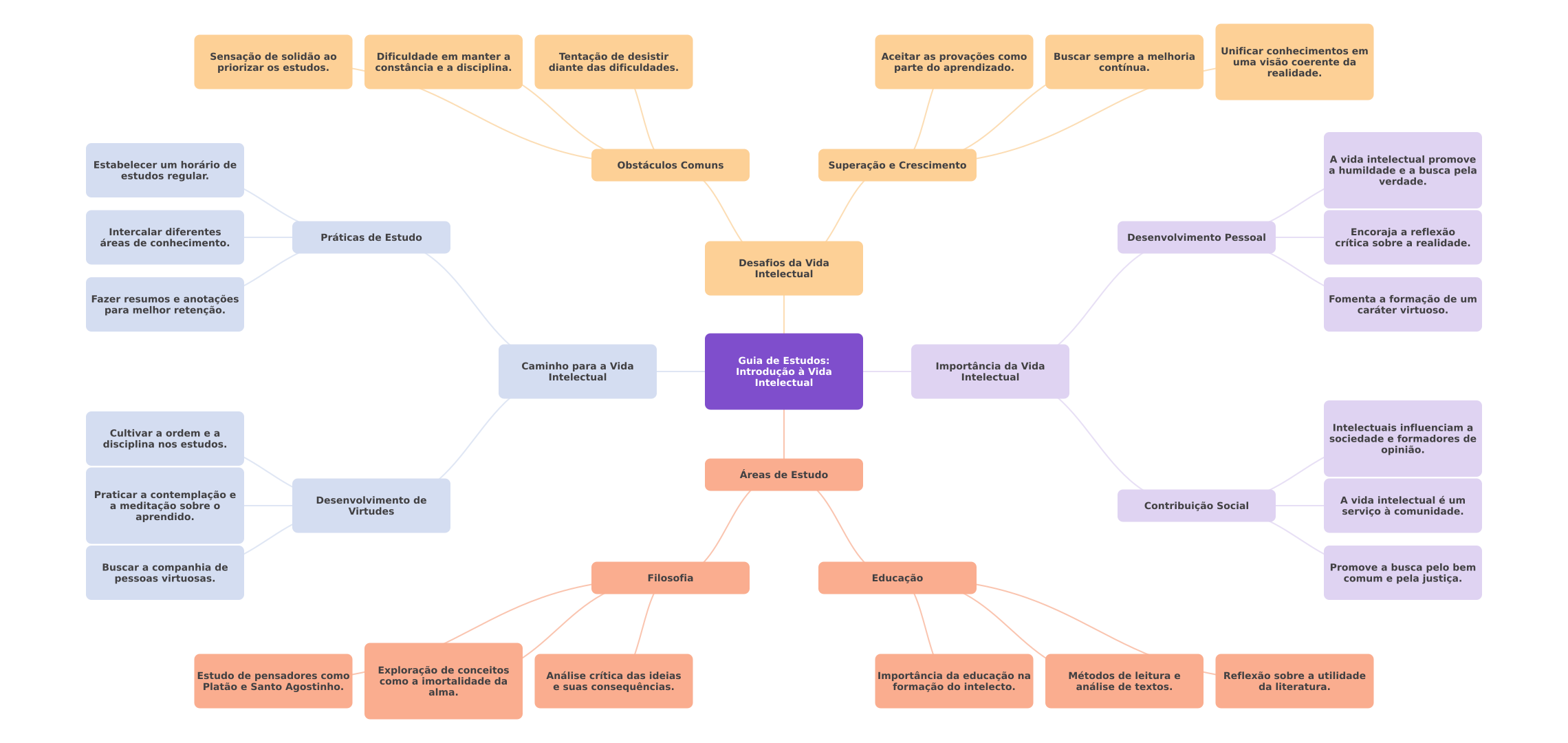 Unificar conhecimentos em Sensação de solidão ao Dificuldade em manter a Tentação de desistir Aceitar as provações como Buscar sempre a melhoria uma visão coerente da priorizar os estudos. constância e a disciplina. diante das dificuldades. parte do aprendizado. contínua. realidade. Estabelecer um horário de Obstáculos Comuns A vida intelectual promove Superação e Crescimento a humildade e a busca pela estudos regular. verdade. Intercalar diferentes Práticas de Estudo Desenvolvimento Pessoal Encoraja a reflexão áreas de conhecimento. crítica sobre a realidade. Desafios da Vida Intelectual Fazer resumos e anotações Fomenta a formação de um para melhor retenção. caráter virtuoso. Guia de Estudos: Caminho para a Vida Introdução à Vida Importância da Vida Intelectual Intelectual Intelectual Intelectuais influenciam a Cultivar a ordem e a sociedade e formadores de disciplina nos estudos. opinião. Áreas de Estudo Praticar a contemplação e Desenvolvimento de A vida intelectual é um a meditação sobre Virtudes Contribuição Social serviço à comunidade. aprendido. Buscar a companhia de Promove a busca pelo bem pessoas virtuosas. Filosofia Educação comum e pela justiça. Exploração de conceitos Estudo de pensadores como Análise crítica das ideias como a imortalidade da Importância da educação na Métodos de leitura e Reflexão sobre a utilidade Platão e Santo Agostinho. alma. e suas consequências. formação do intelecto. análise de textos. da literatura.