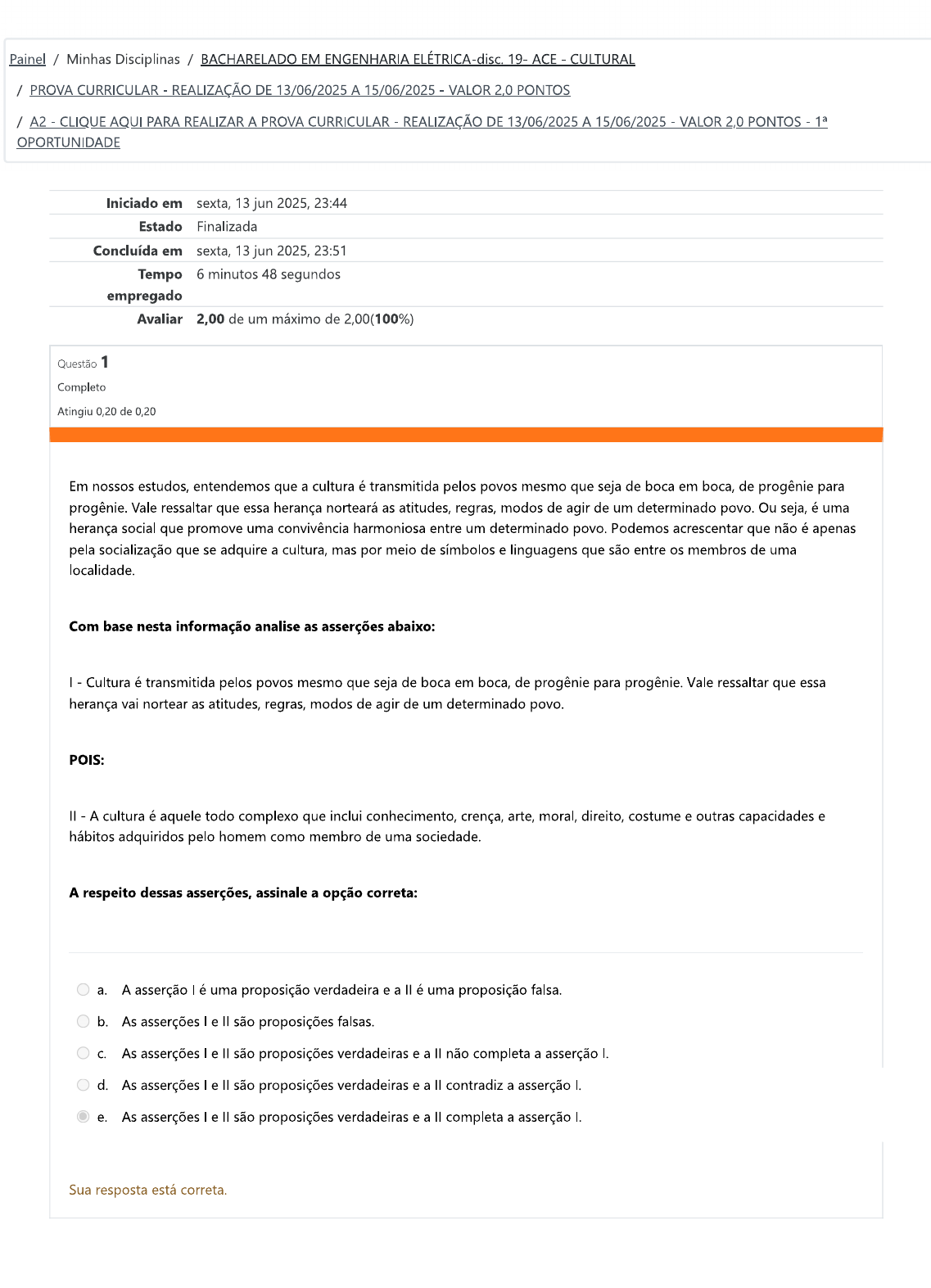 Painel / Minhas Disciplinas / BACHARELADO EM ENGENHARIA ELÉTRICA-disc. 19- ACE CULTURAL / PROVA CURRICULAR REALIZAÇÃO DE 13/06/2025 A 15/06/2025 VALOR 2,0 PONTOS / A2 CLIQUE AQUI PARA REALIZAR A PROVA CURRICULAR REALIZAÇÃO DE 13/06/2025 A 15/06/2025 VALOR 2,0 PONTOS OPORTUNIDADE Iniciado em sexta, 13 jun 2025, 23:44 Estado Finalizada Concluída em sexta, 13 jun 2025, 23:51 Tempo 6 minutos 48 segundos empregado Avaliar 2,00 de um máximo de 2,00(100%) Questão 1 Completo Atingiu 0,20 de 0,20 Em nossos estudos, entendemos que a cultura é transmitida pelos povos mesmo que seja de boca em boca, de progênie para progênie. Vale ressaltar que essa herança norteará as atitudes, regras, modos de agir de um determinado povo. Ou seja, é uma herança social que promove uma convivência harmoniosa entre um determinado povo. Podemos acrescentar que não é apenas pela socialização que se adquire a cultura, mas por meio de símbolos e linguagens que são entre os membros de uma localidade. Com base nesta informação analise as asserções abaixo: I Cultura é transmitida pelos povos mesmo que seja de boca em boca, de progênie para progênie. Vale ressaltar que essa herança vai nortear as atitudes, regras, modos de agir de um determinado povo. POIS: A cultura é aquele todo complexo que inclui conhecimento, crença, arte, moral, direito, costume e outras capacidades e hábitos adquiridos pelo homem como membro de uma sociedade. A respeito dessas asserções, assinale a opção correta: a. A asserção lé uma proposição verdadeira e a é uma proposição falsa. b. As asserções e são proposições falsas. C. As asserções e são proposições verdadeiras e a II não completa a asserção I. d. As asserções e são proposições verdadeiras e a II contradiz a asserção I. e. As asserções e são proposições verdadeiras e a completa a asserção I. Sua resposta está correta.Questão 2 Completo Atingiu 0,20 de 0,20 A cultura pode ser modificada em alguns pontos com o passar do tempo. Talvez você tenha ouvido: "- Na minha época não tinha essa pouca vergonha!", ou visto as mudanças temporais nas fotografias quando observamos as roupas, cortes de cabelo, músicas, gírias, e outros componentes culturais de um determinado povo. Sobre essas mudanças culturais, podemos afirmar sobre modo endógeno ou exógeno: I. modo endógeno pode ser decorrente do próprio sistema cultural, a partir dos membros que participam dessa sociedade. II. modo exógeno se dá por meio de um contato cultural, com outros povos, que acaba interferindo em práticas culturais estabelecidas antes do contato. III. modo exógeno pode ser decorrente do próprio sistema cultural, a partir dos membros que participam dessa sociedade. IV. modo endógeno se dá por meio de um contato cultural, com outros povos, que acaba interferindo em práticas culturais estabelecidas antes do contato. Assinale a alternativa que contenha toda(s) a(s) sentença(s) correta(s): a. As sentenças III e IV estão corretas. b. As sentenças e IV estão corretas. C. As sentenças e estão corretas. d. As sentenças e III estão corretas. e. As sentenças e III estão corretas. Sua resposta está correta.Questão 3 Completo Atingiu 0,20 de 0,20 Além da aculturação, encontramos em nossos estudos a endoculturação que tem como definição básica o aprendizado de uma cultura em que o indivíduo está inserido desde sua infância. Ou seja, é o processo em o indivíduo convive e é condicionado a uma conduta que se estrutura em uma determinada cultura. Podemos exemplificar de maneira clara, que uma criança aprende o que é certo e errado de acordo com a cultura em que vive. Baseado na afirmação acima, assinale a alternativa correta que responda à pergunta: Qual é a definição básica da endoculturação? a. processo de aculturação. b. A rápida assimilação cultural. C. A fusão de culturas diferentes. d. contato frequente entre diferentes culturas. e. aprendizado de uma cultura desde a infância. Sua resposta está correta.Questão 4 Completo Atingiu 0,20 de 0,20 Um ponto que devemos entender em relação a cultura, é a rapidez que podemos conhecê-las e entendê-las na atualidade, pois observamos as mudanças e conhecemos muitas culturas ao redor do mundo. Salientando que é observável a linguagem, músicas, danças, vestimentas e podemos nos deparar com pré-conceitos entre as diferenças culturais. Por exemplo, podemos achar estranho em uma sociedade islâmica uso da burca, enquanto eles acham estranho uso de biquíni. Talvez você ache estranho homem poder se casar com várias mulheres, mas a cultura pode ser poligâmica ou monogâmica. Assim, nasce as diferenças culturais e nasce o etnocentrismo. Pois achamos que o nosso é o correto, superior, melhor, entre outras coisas. Visto que meu certo e errado não é o do outro. Baseado na afirmação acima, assinale a alternativa correta que responda pergunta: que é uma característica comum que surge quando julgamos às diferenças culturais, de acordo com texto apresentado? a. Um acesso universal. b. A uniformidade cultural. C. A ausência de pré-conceitos. d. etnocentrismo. e. A adoção de normas globais. Sua resposta está correta.Questão 5 Completo Atingiu 0,20 de 0,20 A cultura é transmitida de geração em geração, muitas vezes ocorre oralmente, mantendo-se viva na identidade de um povo. É importante destacar que esse legado cultural influencia as atitudes, normas e comportamentos. Ela representa um legado social que fomenta uma convivência harmoniosa dentro de um grupo. Além da socialização, a cultura também é adquirida através de símbolos e linguagem partilhados entre os membros de uma localidade. Com base na afirmação acima, analise a sentenças abaixo e assinale (V) para verdadeiro e (F) para falso: ( ) A cultura é transmitida entre os membros de uma localidade através da socialização. ( ) A cultura é transmitida entre os membros de uma localida
