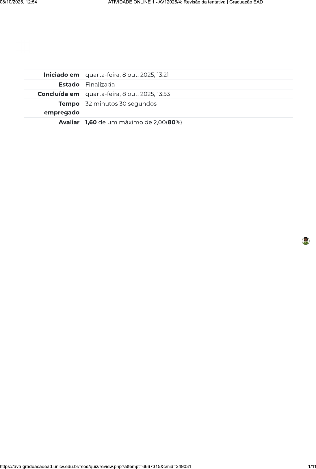 08/10/2025, 12:54 ATIVIDADE ONLINE 1 - AV12025/4: Revisão da tentativa Graduação EAD Iniciado em quarta-feira, 8 out. 2025, 13:21 Estado Finalizada Concluída em quarta-feira, 8 out. 2025, 13:53 Tempo 32 minutos 30 segundos empregado Avaliar 1,60 de um máximo de 2,00(80%) 1/1108/10/2025, 12:54 ATIVIDADE ONLINE 1 AV12025/4: Revisão da tentativa Graduação EAD Questão 1 Correto Atingiu 0,20 de 0,20 Analise as afirmações abaixo e assinale a alternativa correta: I. A Imunidade tributária é a mesma coisa que Isenção tributária. II. A Isenção é permanente e independe de lei ordinária, já que é estabelecida constitucionalmente. III. A Isenção difere-se de Imunidade, uma vez que a Isenção concedida é temporária e deve ser estabelecida por lei. A imunidade é permanente e independe de lei ordinária, já que é estabelecida constitucionalmente. Analise as afirmações abaixo e assinale a alternativa correta: I. A Imunidade tributária é a mesma coisa que Isenção tributária. II. A Isenção é permanente e independe de lei ordinária, já que é estabelecida III. A Isenção difere-se de Imunidade, uma vez que a Isenção concedida é temporária e deve ser estabelecida por lei. A imunidade é permanente e independe de lei ordinária, já que é estabelecida constitucionalmente. Escolha uma opção: a. Apenas a é verdadeira. b. I, e III são verdadeiras. C. Apenas a é verdadeira. d. II e III são verdadeiras apenas. e. le III são verdadeiras apenas. 2/1108/10/2025, 12:54 ATIVIDADE ONLINE 1 - AV12025/4: Revisão da tentativa Graduação EAD Questão 2 Incorreto Atingiu 0,00 de 0,20 Escolha a alternativa que completa a afirmação abaixo: Sistema Tributário é um conjunto de... Escolha uma opção: a. Leis, princípios, normas, e doutrinas que descrevem como um país deve arrecadar, aplicar e distribuir tributos arrecadados em prol da comunidade. b. Leis, tratados e convenções internacionais, decretos e normas complementares e específicas que versem, no todo ou em parte, sobre tributos e as relações jurídicas a eles pertinentes. C. Doutrinas que visam e almejam arrecadar tributos dos cidadãos, em contra partida, a unidade arrecadatória (União, Estados e Municípios), prestam serviços de caráter primordial para mesmos. d. Impostos, multas, taxas e contribuições, podendo ser de competência Municipal, Estadual ou Federal. e. Normas e instituições que têm como finalidade instituir e arrecadar os tributos, conforme a competência dos entes das unidades da Federação, isto é, da União, Estados (Distrito Federal) e Municípios. 3/1108/10/2025, 12:54 ATIVIDADE ONLINE 1 - AV12025/4: Revisão da tentativa Graduação EAD Questão 3 Correto Atingiu 0,20 de 0,20 De acordo com os artigos 148 e 149 da Constituição Federal de 1988, tributos são divididos em cinco espécies, sendo elas: Escolha uma opção: a. Impostos, taxas, multas infratoras, empréstimos compulsórios e contribuições especiais. b. Impostos, taxas, contribuições de favores, empréstimos consignados e contribuições especiais. C. Taxas infratoras, contribuições voluntárias, empréstimos consignados e contribuições especiais. d. Taxas, contribuições sindicais, empréstimos compulsórios e contribuições especiais e. Impostos, taxas, contribuições de melhoria, empréstimos compulsórios e contribuições especiais. 4/1108/10/2025, 12:54 ATIVIDADE ONLINE 1 - AV12025/4: Revisão da tentativa Graduação EAD Questão 4 Correto Atingiu 0,20 de 0,20 As empresas que trabalham com lucro apurado pagam a CSLL em cima do valor auferido do lucro. Deste modo, qual é a alíquota do CSLL? Escolha uma opção: a. A alíquota da CSLL é de 15%; porém, no caso de instituições financeiras e empresas de seguro privados e capitalização, a alíquota é de 9%. b. Todas as questões estão corretas. C. A alíquota da CSLL é de 0,95%; porém, no caso de instituições financeiras e empresas de seguro privados e capitalização, a alíquota é de 15%. d. A alíquota da CSLL é de 10%; porém, no caso de instituições financeiras e empresas de seguro privados e capitalização, a alíquota é de 20%. e. A alíquota da CSLL é de 9%; porém, no caso de instituições financeiras e empresas de seguro privados e capitalização, a alíquota é de 15%. 5/1108/10/2025, 12:54 ATIVIDADE ONLINE 1 - AV12025/4: Revisão da tentativa Graduação EAD Questão 5 Correto Atingiu 0,20 de 0,20 PIS Programa de Integração Social e PASEP Programa de Formação do Patrimônio do Servidor Público - foram instituídos pelas Leis Complementares n° 07 e 08 de 1970, respectivamente, e a Lei 9.715/98 trouxe novas regras a estas contribuições. Quanto a contribuição do PIS/PASEP é correto dizer que: Escolha uma opção: a. será apurada trimestralmente pelas pessoas jurídicas de direito privado (....) com base no faturamento do trimestre. b. será apurada mensalmente pelas pessoas jurídicas de direito privado (....) com base no faturamento do mês. C. será apurada mensalmente pelas pessoas físicas (....) com base nos proventos recebidos do mês. d. será apurada bimestralmente pelas pessoas jurídicas de direito privado (....) com base no faturamento do bimestre. e. será apurada anualmente pelas pessoas jurídicas de direito privado (....) com base no faturamento do ano. 6/1108/10/2025, 12:54 ATIVIDADE ONLINE 1 AV12025/4: Revisão da tentativa Graduação EAD Questão 6 Correto Atingiu 0,20 de 0,20 Complete a afirmação a seguir: Imposto de Renda é mais um dos impostos de competência da , previsto no art. 153, III, da CF/88. Trata-se de imposto com finalidade , pois objetivo da sua instituição é recursos para Estado. Escolha uma opção: a. Municipal; Tributária; Arrecadar. b. União; Fiscal; Arrecadar. C. Distrital; Fiscal; Arrecadar. d. Estadual; Fiscal; Recolher. e. União; Fiscal; Doar. 7/1108/10/2025, 12:54 ATIVIDADE ONLINE 1 - AV12025/4: Revisão da tentativa Graduação EAD Questão 7 Correto At