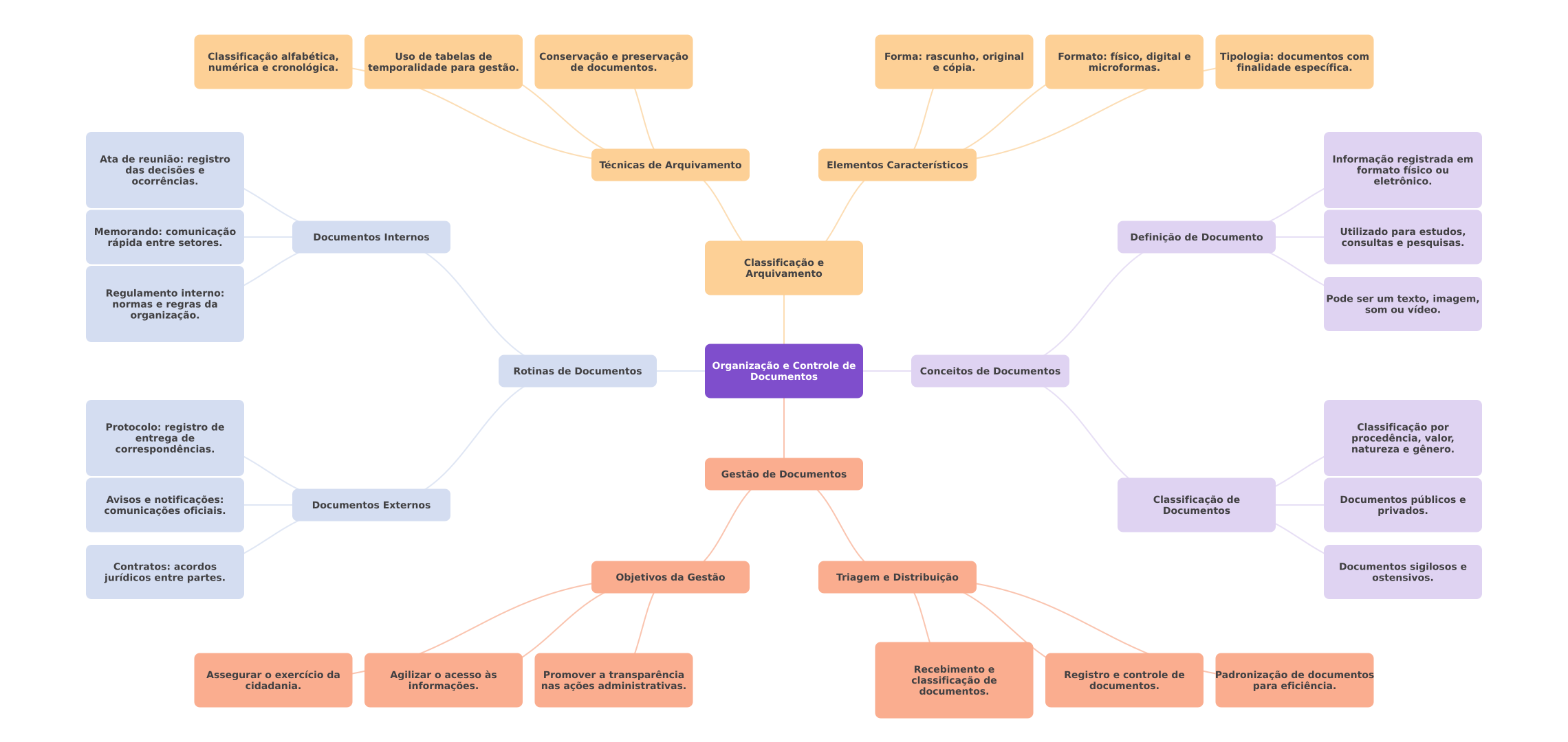 Classificação alfabética, Uso de tabelas de Conservação e preservação Forma: rascunho, original Formato: físico, digital e Tipologia: documentos com numérica e cronológica. temporalidade para gestão. de documentos. e cópia. microformas. finalidade específica. Ata de reunião: registro Informação registrada em Técnicas de Arquivamento Elementos Característicos das decisões e formato físico ou ocorrências. eletrônico. Memorando: comunicação Documentos Internos rápida entre setores. Definição de Documento Utilizado para estudos, consultas e pesquisas. Classificação e Arquivamento Regulamento interno: Pode ser um texto, imagem, normas e regras da som ou vídeo. organização. Rotinas de Documentos Organização e Controle de Conceitos de Documentos Documentos Protocolo: registro de Classificação por entrega de procedência, valor, correspondências. natureza e gênero. Gestão de Documentos Avisos e notificações: Classificação de Documentos Externos Documentos públicos e comunicações oficiais. Documentos privados. Contratos: acordos Documentos sigilosos e jurídicos entre partes. Objetivos da Gestão Triagem e Distribuição ostensivos. Recebimento e Assegurar exercício da Agilizar acesso às Promover a transparência classificação de Registro e controle de Padronização de documentos cidadania. informações. nas ações administrativas. documentos. documentos. para eficiência.