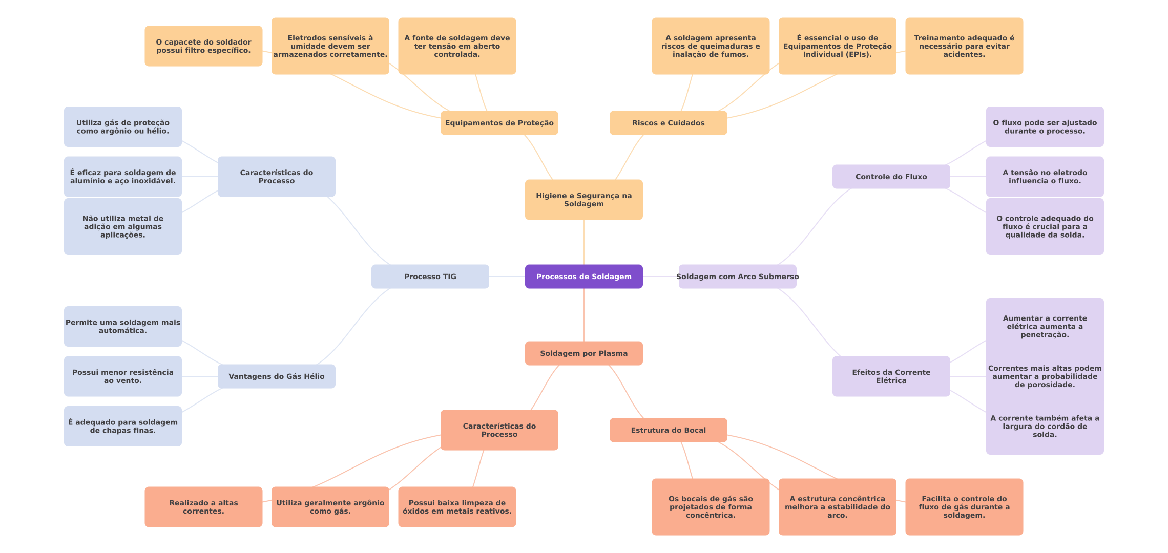 Eletrodos sensíveis à capacete do soldador A fonte de soldagem deve A soldagem apresenta É essencial uso de Treinamento adequado é umidade devem ser ter tensão em aberto possui filtro específico. riscos de queimaduras e Equipamentos de Proteção necessário para evitar armazenados corretamente. controlada. inalação de fumos. Individual (EPIs). acidentes. Utiliza gás de proteção Equipamentos de Proteção Riscos e Cuidados fluxo pode ser ajustado como argônio ou hélio. durante processo. É eficaz para soldagem de Características do A tensão no eletrodo Controle do Fluxo alumínio e aço inoxidável. Processo influencia fluxo. Higiene e Segurança na Soldagem Não utiliza metal de controle adequado do adição em algumas fluxo é crucial para a aplicações. qualidade da solda. Processo TIG Processos de Soldagem com Arco Aumentar a corrente Permite uma soldagem mais elétrica aumenta a automática. penetração. Soldagem por Plasma Possui menor resistência Efeitos da Corrente Correntes mais altas podem ao vento. Vantagens do Gás Hélio Elétrica aumentar a probabilidade de porosidade. A corrente também afeta a É adequado para soldagem Características do de chapas finas. Estrutura do Bocal largura do cordão de Processo solda. Realizado a altas Utiliza geralmente argônio Possui baixa limpeza de Os bocais de gás são A estrutura concêntrica Facilita controle do projetados de forma melhora a estabilidade do correntes. como gás. óxidos em metais reativos. fluxo de gás durante a concêntrica. arco. soldagem.