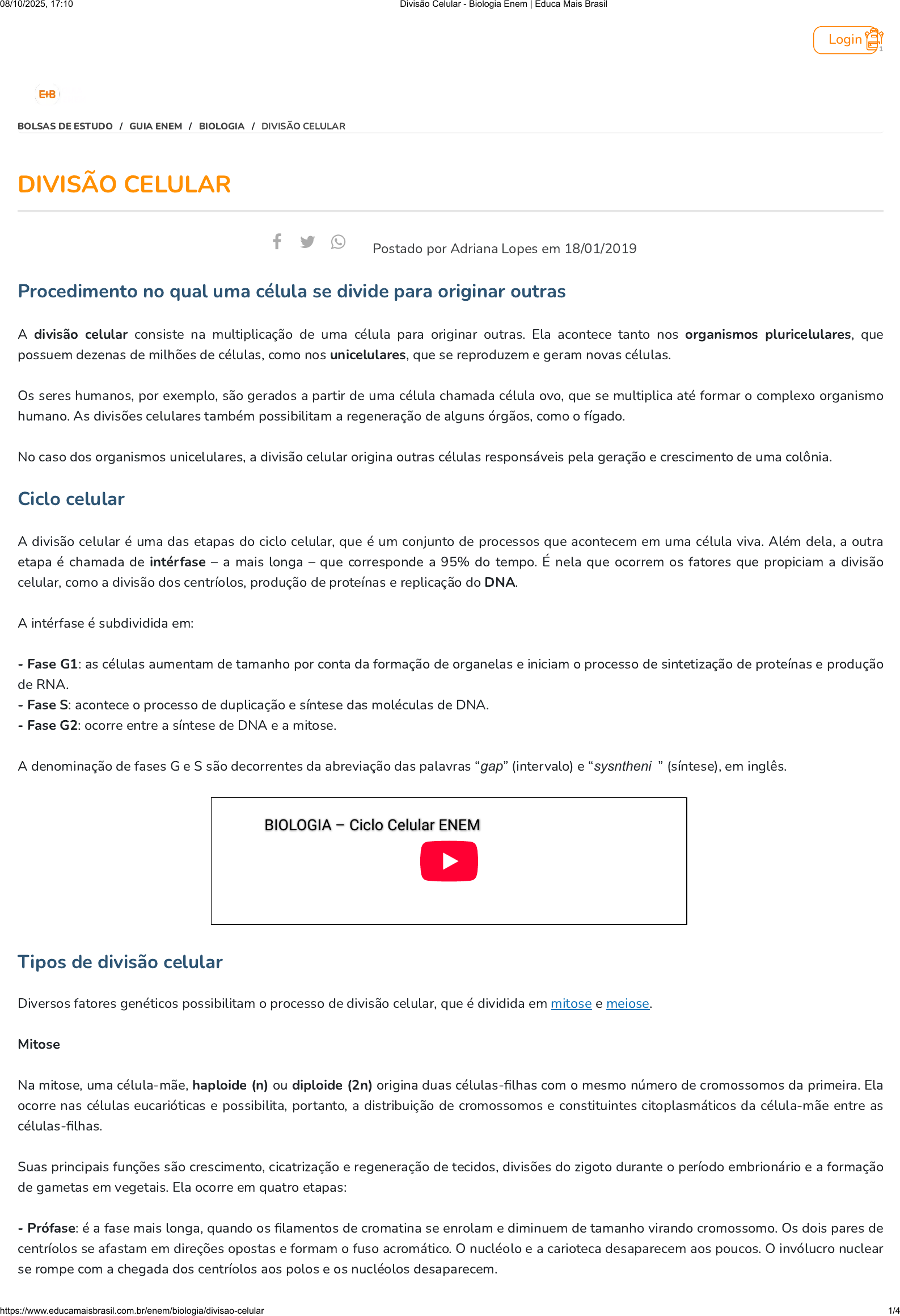 DIVISÃO CELULAR Postado por Adriana Lopes em 18/01/2019 Procedimento no qual uma célula se divide para originar outras A divisão celular consiste na multiplicação de uma célula para originar outras. Ela acontece tanto nos organismos pluricelulares, que possuem dezenas de milhões de células, como nos unicelulares, que se reproduzem e geram novas células. Os seres humanos, por exemplo, são gerados a partir de uma célula chamada célula ovo, que se multiplica até formar o complexo organismo humano. As divisões celulares também possibilitam a regeneração de alguns órgãos, como o fígado. No caso dos organismos unicelulares, a divisão celular origina outras células responsáveis pela geração e crescimento de uma colônia. Ciclo celular A divisão celular é uma das etapas do ciclo celular, que é um conjunto de processos que acontecem em uma célula viva. Além dela, a outra etapa é chamada de intérfase – a mais longa – que corresponde a 95% do tempo. É nela que ocorrem os fatores que propiciam a divisão celular, como a divisão dos centríolos, produção de proteínas e replicação do DNA. A intérfase é subdividida em: - Fase G1: as células aumentam de tamanho por conta da formação de organelas e iniciam o processo de sintetização de proteínas e produção de RNA. - Fase S: acontece o processo de duplicação e síntese das moléculas de DNA. - Fase G2: ocorre entre a síntese de DNA e a mitose. A denominação de fases G e S são decorrentes da abreviação das palavras “gap” (intervalo) e “sysnthenis” (síntese), em inglês. BIOLOGIA – Ciclo Celular ENEMBIOLOGIA – Ciclo Celular ENEM Tipos de divisão celular Diversos fatores genéticos possibilitam o processo de divisão celular, que é dividida em mitose e meiose. Mitose Na mitose, uma célula-mãe, haploide (n) ou diploide (2n) origina duas células-filhas com o mesmo número de cromossomos da primeira. Ela ocorre nas células eucarióticas e possibilita, portanto, a distribuição de cromossomos e constituintes citoplasmáticos da célula-mãe entre as células-filhas. Suas principais funções são crescimento, cicatrização e regeneração de tecidos, divisões do zigoto durante o período embrionário e a formação de gametas em vegetais. Ela ocorre em quatro etapas: - Prófase: é a fase mais longa, quando os filamentos de cromatina se enrolam e diminuem de tamanho virando cromossomo. Os dois pares de centríolos se afastam em direções opostas e formam o fuso acromático. O nucléolo e a carioteca desaparecem aos poucos. O invólucro nuclear se rompe com a chegada dos centríolos aos polos e os nucléolos desaparecem. 1 Login BOLSAS DE ESTUDO / GUIA ENEM / BIOLOGIA / DIVISÃO CELULAR 08/10/2025, 17:10 Divisão Celular - Biologia Enem | Educa Mais Brasil https://www.educamaisbrasil.com.br/enem/biologia/divisao-celular 1/4 https://www.educamaisbrasil.com.br/enem/guia-enem https://www.facebook.com/dialog/share?app_id=170333606374874&display=popup&href=https%3A%2F%2Fwww.educamaisbrasil.com.br/biologia/divisao-celular https://twitter.com/intent/tweet?text=Divis%C3%A3o%20Celular%20-%20Educa%20Mais%20Brasil%0D%0Ahttps%3A//www.educamaisbrasil.com.br/biologia/divisao-celular https://api.whatsapp.com/send?text=Divis%C3%A3o%20Celular%20|%20Educa%20Mais%20Brasil%20https://www.educamaisbrasil.com.br/biologia/divisao-celular https://www.youtube.com/watch?v=2QO0a9CaeYQ https://www.educamaisbrasil.com.br/enem/biologia/mitose https://www.educamaisbrasil.com.br/enem/biologia/meiose https://www.educamaisbrasil.com.br/ https://www.educamaisbrasil.com.br/ https://www.educamaisbrasil.com.br/ https://www.educamaisbrasil.com.br/enem/guia-enem https://www.educamaisbrasil.com.br/enem/biologia - Metáfase: os cromossomos chegam a posição mediana da célula e condensam-se ao máximo de maneira individualizada. Nesse momento, a contagem de cromossomos e a verificação das alterações estruturais é possível. Formam a Placa Equatorial por meio do alinhamento no plano equatorial. Também nessa fase o fuso acromático se desenvolve e algumas fibrilas se conectam aos centrômeros. - Anáfase: os centrômeros começam a se duplicar e as fibras do fuso, conectados aos centrômeros encurtam e puxam os cromossomos para os polos da célula. Depois da clivagem dos centrômeros, os cromatídios se separam e originam dois cromossomos independentes. - Telófase: nessa etapa as fibras do fuso desaparecem e a membrana celular se desenvolve em volta dos cromossomos de cada polo da célula e passam a existir dois números com informação genética igual. Além disso, os cromossomos se descondensam e têm início a citocinese (divisão do citoplasma). A divisão celular consiste na multiplicação de uma célula para dar origem a outras. (Foto: Pixabay) Meiose Diferentemente da mitose, na meiose a célula-mãe diploide (2n), com cromossomos duplos, dá origem a quatro células-filhas com metade do número de cromossomos da primeira a partir de duas divisões sucessivas. Ela tem as funções de formar esporos nos vegetais e gametas em animais e ocorre em oito fases. São elas: - Prófase I: nessa primeira fase os cromossomos tornam-se mais condensados e ocorre o aparelhamento dos cromossomos homólogos. O nucléolo e a carioteca desaparecem e os centríolos migram para os polos da célula para formar o fuso acromático. Esse período é subdividido em: leptóteno, zigóteno, paquíteno, diplóteno e diacinese. - Metáfase I: a membrana celular deixa de existir e forma-se um fuso. Os cromossomos pareados se alinham no plano equatorial e os centrômeros se ligam a fibras que surgem de centríolos opostos. - Anáfase I: nesse momento os emparelhamentos se desfazem e cada cromossomo migra para um polo da célula. Os dois membros de cada bivalente se separam e se distribuem de forma independente um dos outros. Os conjuntos paterno e materno originais se separam em combinações aleatórias. - Telófase I: dois núcleos são