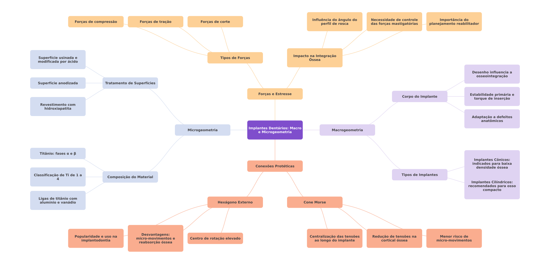 Influência do ângulo do Necessidade de controle Forças de compressão Forças de tração Forças de corte Importância do perfil de rosca das forças mastigatórias planejamento reabilitador Superfície usinada e Tipos de Forças Impacto na Integração modificada por ácido Desenho influencia a osseointegração Superfície anodizada Tratamento de Superfícies Forças e Estresse Corpo do Implante Estabilidade primária e torque de inserção Revestimento com hidroxiapatita Adaptação a defeitos anatômicos Microgeometria Implantes Dentários: Macro e Microgeometria Macrogeometria Titânio: fases Implantes Cônicos: indicados para baixa Conexões Protéticas densidade óssea Classificação de Ti de 1 a Tipos de Implantes 4 Composição do Material Implantes Cilíndricos: recomendados para osso compacto Ligas de titânio com alumínio e vanádio Hexágono Externo Cone Morse Popularidade e uso na Desvantagens: Centralização das tensões Redução de tensões na Menor risco de e implantodontia Centro de rotação elevado reabsorção óssea ao longo do implante cortical óssea micro-movimentos