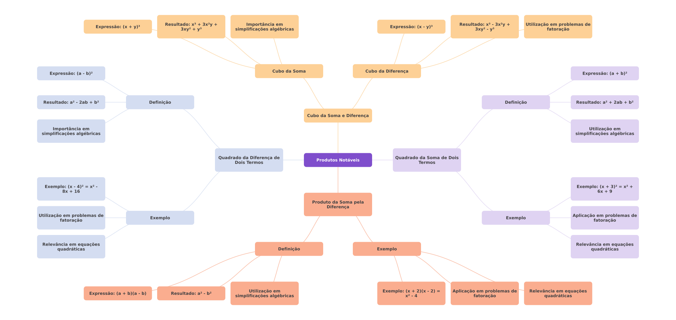 Resultado: + 3x2y + Importância em Expressão: (x + simplificações algébricas Expressão: (x Resultado: + Utilização em problemas de 3xy2 fatoração Cubo da Soma Expressão: (a Cubo da Diferença Expressão: (a + Resultado: 2ab + Definição Definição Resultado: + 2ab + Cubo da Soma e Diferença Importância em Utilização em simplificações algébricas simplificações algébricas Quadrado da Diferença de Quadrado da Soma de Dois Produtos Notáveis Dois Termos Termos Exemplo: (x = - Exemplo: (x + = + 8x 16 6x + 9 Produto da Soma pela Diferença Utilização em problemas de Exemplo Exemplo Aplicação em problemas de fatoração fatoração Relevância em equações Relevância em equações quadráticas Definição Exemplo quadráticas Expressão: (a + b)(a b) Resultado: Utilização em Exemplo: (x + 2)(x 2) = Aplicação em problemas de Relevância em equações simplificações algébricas 4 fatoração quadráticas