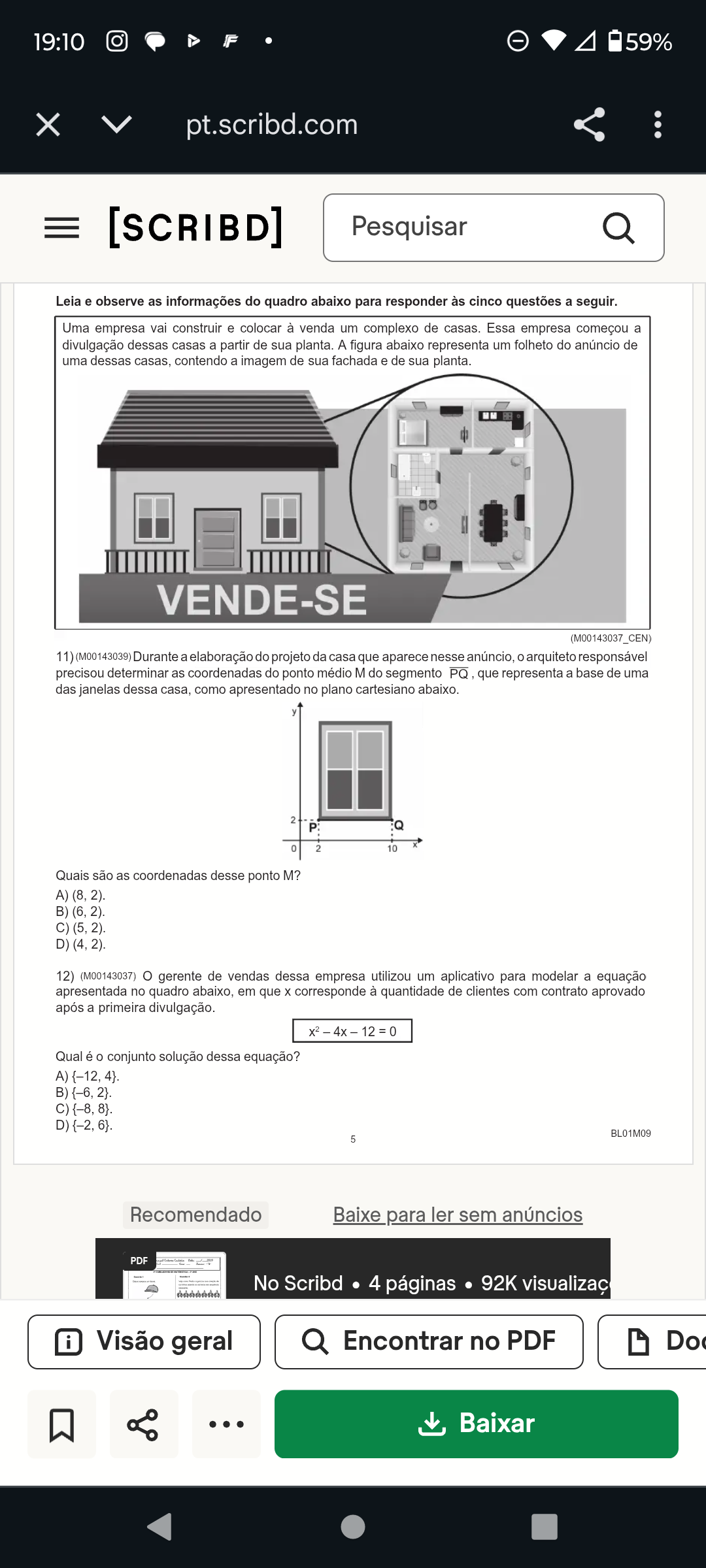 19:10 59% X pt.scribd.com [SCRIBD] Pesquisar Leia e observe as informações do quadro abaixo para responder às cinco questões a seguir. Uma empresa vai construir e colocar à venda um complexo de casas. Essa empresa começou a divulgação dessas casas a partir de sua planta. A figura abaixo representa um folheto do anúncio de uma dessas casas, contendo a imagem de sua fachada e de sua planta. VENDE-SE (M00143037_CEN) 11) (M00143039) Durante a elaboração do projeto da casa que aparece nesse anúncio, arquiteto responsável precisou determinar as coordenadas do ponto médio M do segmento que representa a base de uma das janelas dessa casa, como apresentado no plano cartesiano abaixo. 2 P Q 0 2 10 Quais são as coordenadas desse ponto M? A) (8, 2). B) (6, 2). C) (5, 2). D) (4,2). 12) (M00143037) gerente de vendas dessa empresa utilizou um aplicativo para modelar a equação apresentada no quadro abaixo, em que X corresponde à quantidade de clientes com contrato aprovado após a primeira divulgação. Qual é conjunto solução dessa equação? A) {-12, 4}. B) {-6, 2}. C) {-8, 8}. D) {-2, 6}. BL01M09 5 Recomendado Baixe para ler sem anúncios PDF No Scribd 4 páginas 92K visualizaç i Visão geral Encontrar no PDF Do Baixar