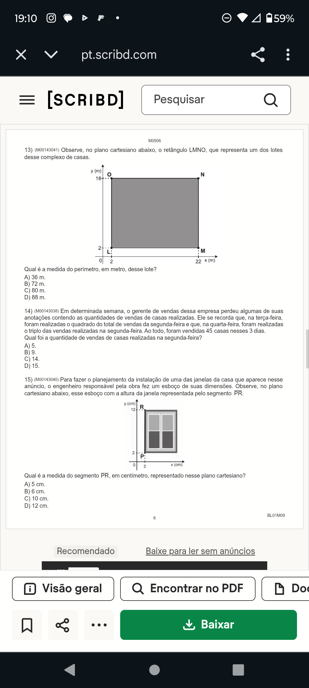 19:10 59% X pt.scribd.com [SCRIBD] Pesquisar M0906 13) (M00143041) Observe, no plano cartesiano abaixo, retângulo LMNO, que representa um dos lotes desse complexo de casas. y (m) o N 18 2 L: M 0 2 22 (m) Qual é a medida do perímetro, em metro, desse lote? A) 36 m. B) 72 m. C) 80 m. D) 88 m. 14) (M00143038) Em determinada semana, gerente de vendas dessa empresa perdeu algumas de suas anotações contendo as quantidades de vendas de casas realizadas. Ele se recorda que, na terça-feira, foram realizadas quadrado do total de vendas da segunda-feira e que, na quarta-feira, foram realizadas triplo das vendas realizadas na segunda-feira. Ao todo, foram vendidas 45 casas nesses 3 dias. Qual foi a quantidade de vendas de casas realizadas na segunda-feira? A) 5. B) 9. C) 14. D) 15. 15) (M00143040) Para fazer planejamento da instalação de uma das janelas da casa que aparece nesse anúncio, engenheiro responsável pela obra fez um esboço de suas dimensões. Observe, no plano cartesiano abaixo, esse esboço com a altura da janela representada pelo segmento PR. y (cm) R 12 2 P 0 2 (cm) Qual é a medida do segmento PR, em centímetro, representado nesse plano cartesiano? A) 5 cm. B) 6 cm. C) 10 cm. D) 12 cm. BL01M09 6 Recomendado Baixe para ler sem anúncios i Visão geral Encontrar no PDF Do Baixar
