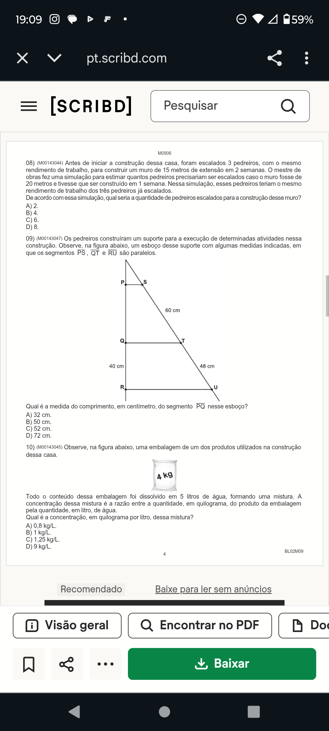 19:09 59% X pt.scribd.com [SCRIBD] Pesquisar M0906 08) (M00143044) Antes de iniciar a construção dessa casa, foram escalados 3 pedreiros, com mesmo rendimento de trabalho, para construir um muro de 15 metros de extensão em 2 semanas. mestre de obras fez uma simulação para estimar quantos pedreiros precisariam ser escalados caso muro fosse de 20 metros e tivesse que ser construído em 1 semana. Nessa simulação, esses pedreiros teriam mesmo rendimento de trabalho dos três pedreiros já escalados. De acordo com essa simulação, qual seria a quantidade de pedreiros escalados para a construção desse muro? A) 2. B) 4. C) 6. D) 8. 09) (M00143047) Os pedreiros construíram um suporte para a execução de determinadas atividades nessa construção. Observe, na figura abaixo, um esboço desse suporte com algumas medidas indicadas, em que segmentos PS, QT e RU são paralelos. P S 60 cm Q T 40 cm 48 cm R U Qual é a medida do comprimento, em centímetro, do segmento PQ nesse esboço? A) 32 cm. B) 50 cm. C) 52 cm. D) 72 cm. 10) (M00143045) Observe, na figura abaixo, uma embalagem de um dos produtos utilizados na construção dessa casa. 4 kg Todo conteúdo dessa embalagem foi dissolvido em 5 litros de água, formando uma mistura. A concentração dessa mistura é a razão entre a quantidade, em quilograma, do produto da embalagem pela quantidade, em litro, de água. Qual é a concentração, em quilograma por litro, dessa mistura? A) 0,8 kg/L. B) 1 kg/L. C) 1,25 kg/L. D) 9 kg/L. BL02M09 4 Recomendado Baixe para ler sem anúncios i Visão geral Encontrar no PDF Do Baixar