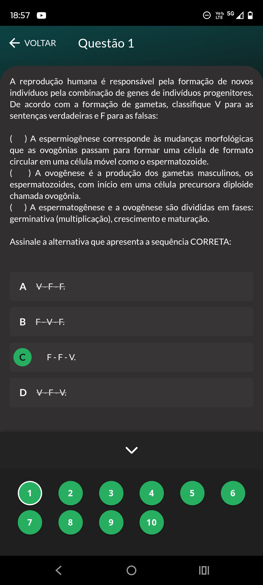 18:57 5G LTE VOLTAR Questão 1 A reprodução humana é responsável pela formação de novos indivíduos pela combinação de genes de indivíduos progenitores. De acordo com a formação de gametas, classifique V para as sentenças verdadeiras e F para as falsas: ( ) A espermiogênese corresponde às mudanças morfológicas que as ovogônias passam para formar uma célula de formato circular em uma célula móvel como espermatozoide. ( ) A ovogênese é a produção dos gametas masculinos, os espermatozoides, com início em uma célula precursora diploide chamada ovogônia. ( ) A espermatogênese e a ovogênese são divididas em fases: germinativa (multiplicação), crescimento e maturação. Assinale a alternativa que apresenta a sequência CORRETA: D V-F-V. 1 2 3 4 5 6 7 8 9 10