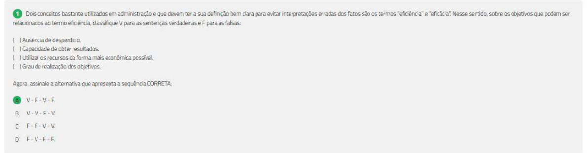 1 Dois conceitos bastante utilizados em administração e que devem ter a sua definição bem para evitar interpretações erradas dos fatos são termos "eficiência" e Nesse sentido, sobre objetivos que podem ser relacionados ao termo eficiência, classifique V para as sentenças verdadeiras e F para as falsas: Ausência de Capacidade de obter resultados. Utilizar recursos da forma mais econômica possível. Grau de realização dos objetivos. Agora, assinale a alternativa que apresenta a sequência V-F-V-F B V-V-F-V. C F-F-V-V. D F-V-F-F