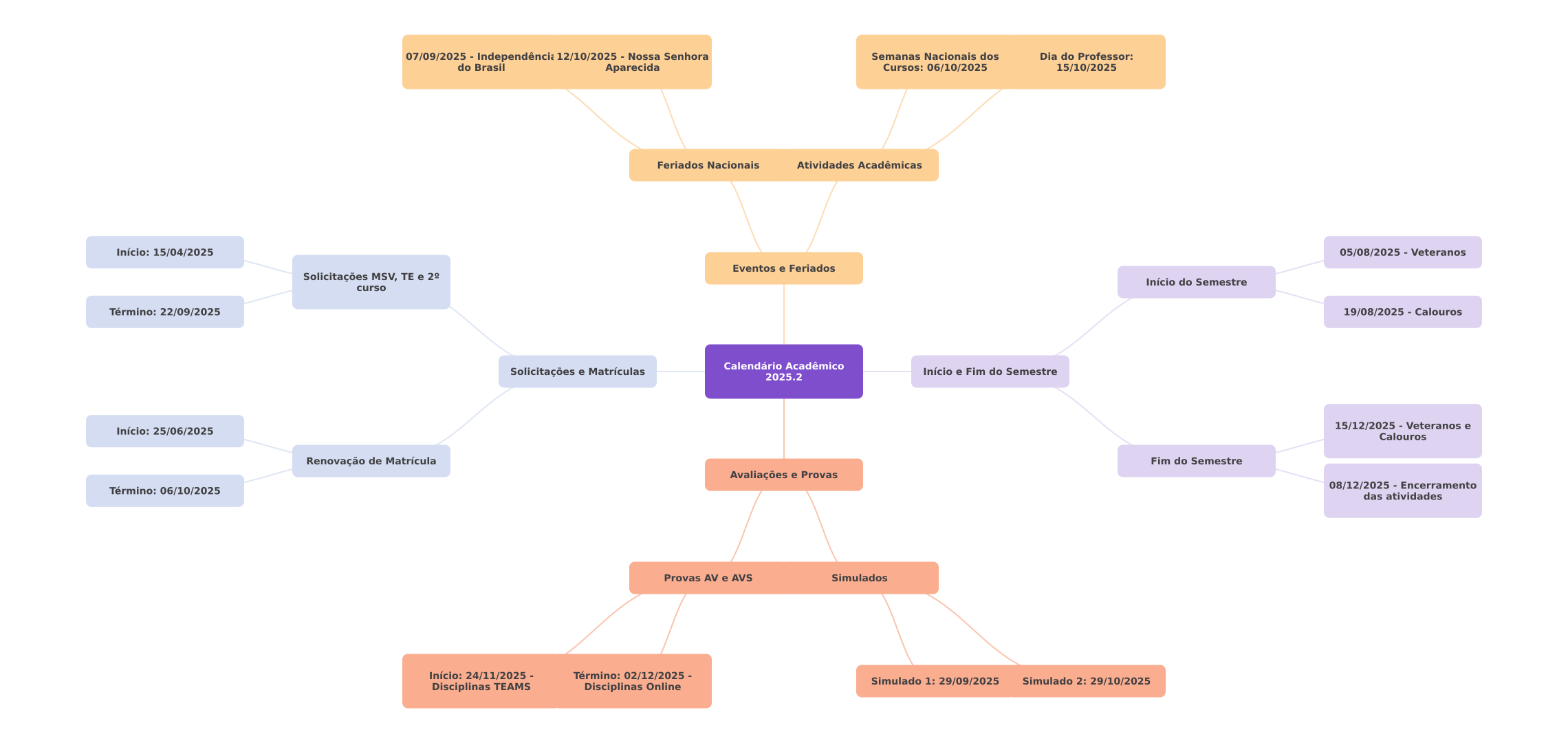 07/09/2025 Independência 12/10/2025 - Nossa Senhora Semanas Nacionais dos Dia do Professor: do Brasil Aparecida Cursos: 06/10/2025 15/10/2025 Feriados Nacionais Atividades Acadêmicas Início: 15/04/2025 05/08/2025 Veteranos Eventos e Feriados Solicitações MSV, TE e Início do Semestre curso Término: 22/09/2025 19/08/2025 Calouros Calendário Acadêmico Solicitações e Matrículas Início e Fim do Semestre 2025.2 15/12/2025 Veteranos e Início: 25/06/2025 Calouros Renovação de Matrícula Fim do Semestre Avaliações e Provas 08/12/2025 Encerramento Término: 06/10/2025 das atividades Provas AV e AVS Simulados Início: 24/11/2025 Término: 02/12/2025 Simulado 1: 29/09/2025 Simulado 2: 29/10/2025 Disciplinas TEAMS Disciplinas Online