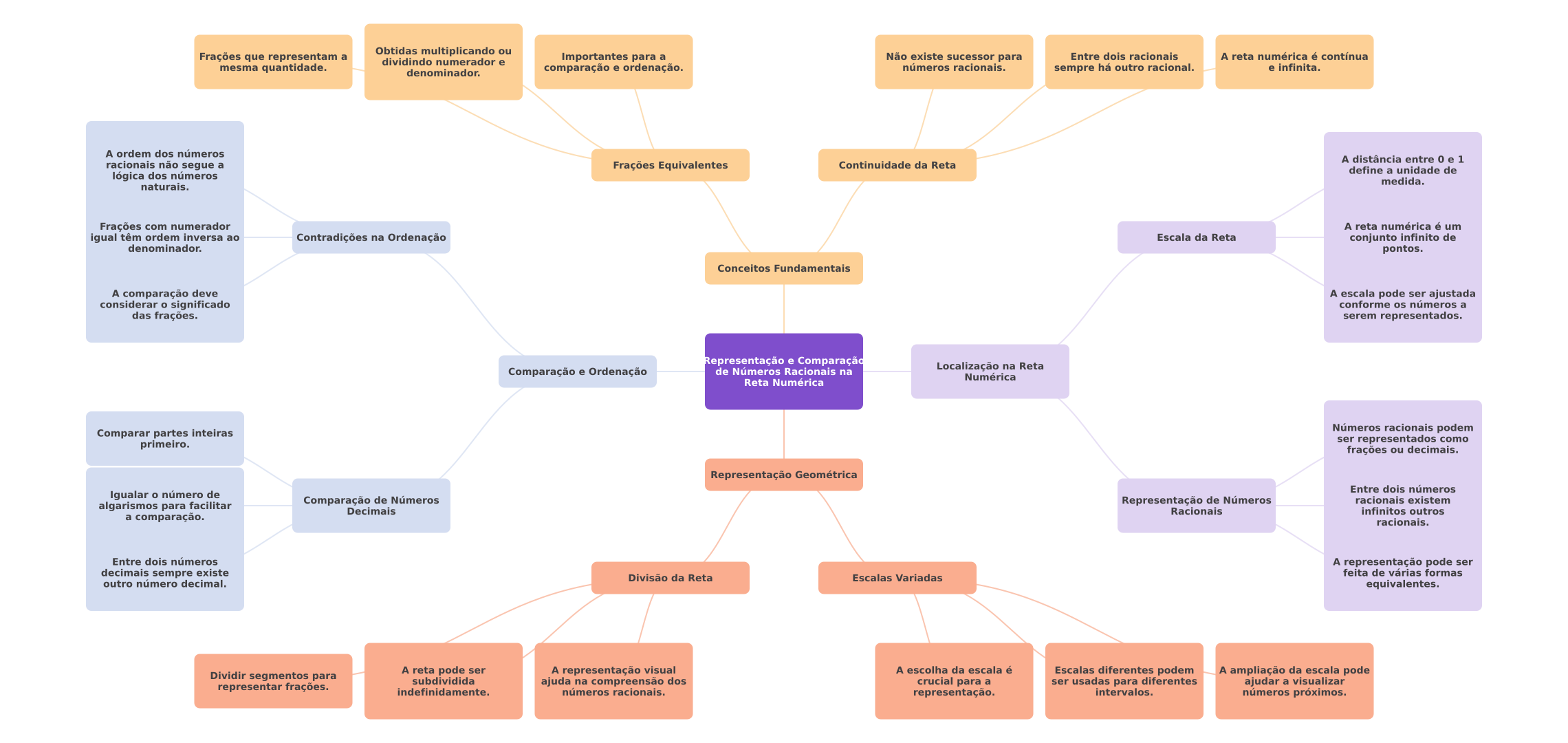 Frações que representam a Obtidas multiplicando ou dividindo numerador e Importantes para a Não existe sucessor para Entre dois racionais A reta numérica é contínua mesma quantidade. comparação e ordenação. números racionais. sempre há outro racional. e infinita. denominador. A ordem dos números A distância entre 0 e 1 racionais não segue a Frações Equivalentes Continuidade da Reta define a unidade de lógica dos números medida. naturais. Frações com numerador A reta numérica é um igual têm ordem inversa ao Contradições na Ordenação Escala da Reta conjunto infinito de denominador. pontos. Conceitos Fundamentais A comparação deve A escala pode ser ajustada considerar significado conforme os números a das frações. serem representados. Representação e Comparação de Números Racionais na Localização na Reta Comparação e Ordenação Numérica Reta Numérica Números racionais podem Comparar partes inteiras primeiro. ser representados como frações ou decimais. Representação Geométrica Entre dois números Igualar número de algarismos para facilitar Comparação de Números Representação de Números racionais existem Decimais Racionais infinitos outros a comparação. racionais. Entre dois números A representação pode ser decimais sempre existe feita de várias formas Divisão da Reta Escalas Variadas outro número decimal. equivalentes. A reta pode ser A representação visual A escolha da escala é Dividir segmentos para Escalas diferentes podem A ampliação da escala pode subdividida representar frações. ajuda na compreensão dos crucial para a ser usadas para diferentes ajudar a visualizar indefinidamente. números racionais. representação. intervalos. números próximos.