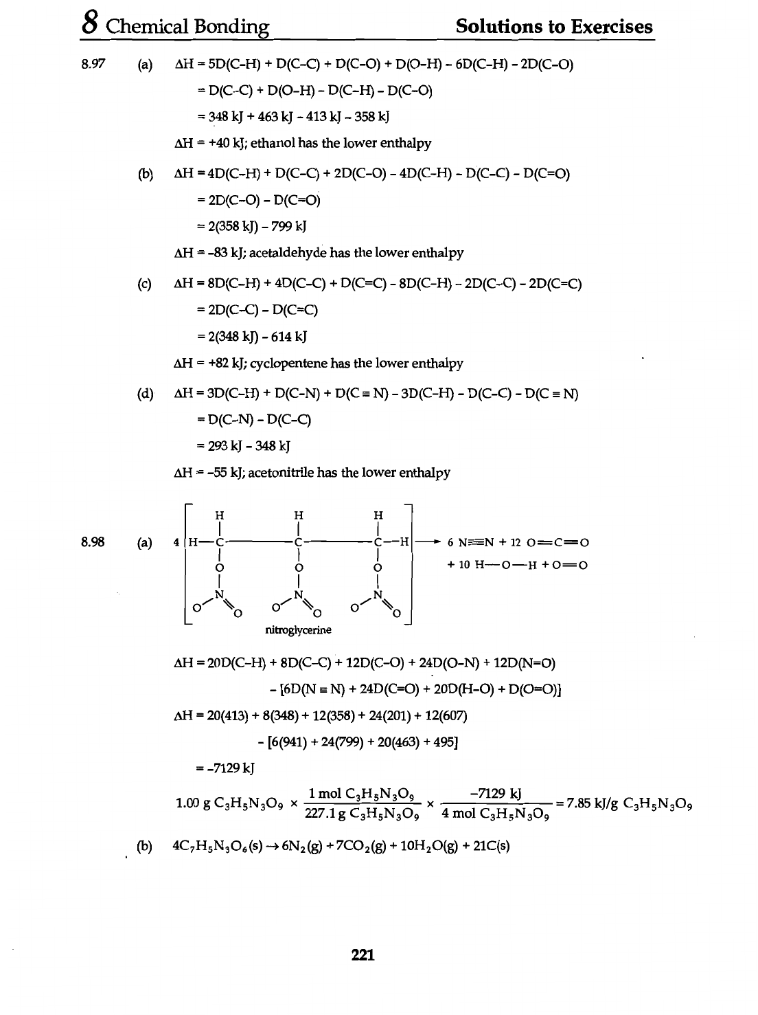 8 Chemical Bonding Solutions to Exercises 8.97 (a) AH = 5D(C-H) + D(C-C) + D(C-O) + D(O-H) - 6D(C-H) - 2D(C-O) = D(C-C) + D(O-H) - D(C-H) - D(C-O) If 348 kJ + 463 kJ - 413 kJ 358 kJ AH = +40 kJ; ethanol has the lower enthalpy (b) AH = 4D(C-H) + D(C-C) + 2D(C-O) - 4D(C-H) - D(C-C) - D(C=O) = 2D(C-O) - D(C=O) = 2(358 kJ) - 799 kJ = acetaldehyde has the lower enthalpy (c) = 8D(C-H) + 4D(C-C) + D(C=C) - 8D(C-H) - 2D(C-C) - 2D(C=C) = 2D(C-C) - D(C=C) = 2(348 kJ) - 614 kJ = +82 kJ; cyclopentene has the lower enthalpy (d) AH = 3D(C-H) + D(C-N) + D(C ≡ N) - 3D(C-H) - D(C-C) - D(C N) = D(C-N) - D(C-C) = 293 kJ - 348 kJ AH = -55 kJ; acetonitrile has the lower enthalpy H H H 8.98 (a) 4 H C 6 + 12 0=C=0 + 10 + N N N nitroglycerine = 20D(C-H) + 8D(C-C) + 12D(C-O) + 24D(O-N) + 12D(N=O) - [6D(N N) + 24D(C=O) + 20D(H-O) + D(O=O)] = 20(413) + 8(348) + 12(358) + 24(201) + 12(607) - [6(941) + 24(799) + 20(463) + 495] = kJ 1.00 g C₃H₅N₃O₉ 227.1 1 mol g C₃H₅N₃O₉ C₃H₅N₃O₉ 4 mol -7129 C₃H₅N₃O₉ kJ = 7.85 kJ/g C₃H₅N₃O₉ (b) 4C₇H₅N₃O₆(s) + + 10H₂O(g) + 21C(s) 221