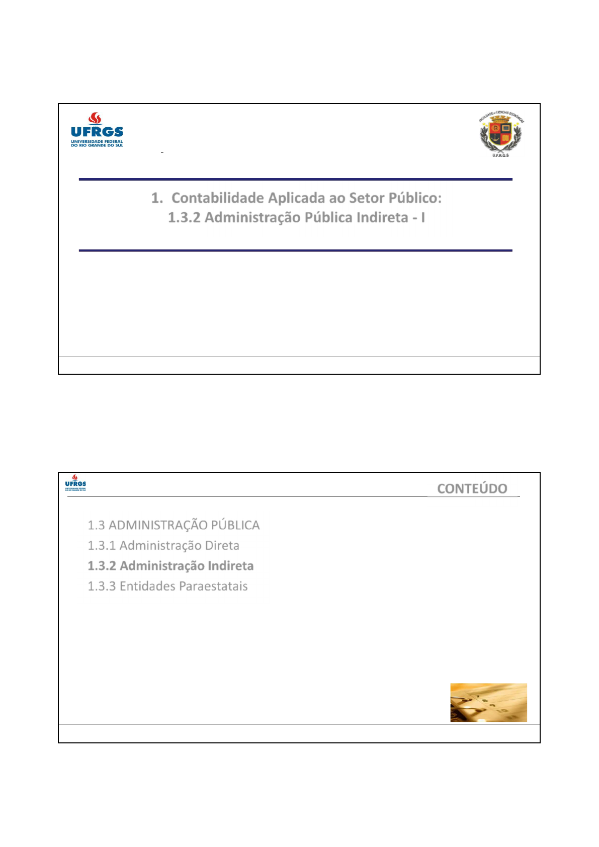 1 Prof. Diego de Oliveira Carlin Contabilidade Governamental I Semana Acadêmica DCCA 2012/1 Universidade Federal do Rio Grande do Sul Faculdade de Ciências Econômicas Departamento de Ciências Contábeis e Atuariais 1. Contabilidade Aplicada ao Setor Público: 1.3.2 Administração Pública Indireta - I Prof. Diego de Oliveira Carlin Universidade Federal do Rio Grande do Sul Faculdade de Ciências Econômicas Departamento de Ciências Contábeis e Atuariais Contabilidade Governamental I Prof. Diego de Oliveira Carlin Contabilidade Governamental I AGENDA 1.3 ADMINISTRAÇÃO PÚBLICA 1.3.1 Administração Direta 1.3.2 Administração Indireta 1.3.3 Entidades Paraestatais CONTEÚDO 2 Prof. Diego de Oliveira Carlin Contabilidade Governamental I AGENDA 1.3 ADMINISTRAÇÃO PÚBLICA 1.3.1 Administração Direta 1.3.2 Administração Indireta 1.3.2.1 Definições e Características 1.3.2.2 Autarquias 1.3.2.3 Fundações Públicas 1.3.2.4 Consórcios Públicos 1.3.2.5 Sociedades de Economia Mista (SEM) 1.3.2.6 Empresas Públicas (EP) 1.3.2.7 Regime Jurídico das Empresas Estatais 1.3.3 Entidades Paraestatais CONTEÚDO Prof. Diego de Oliveira Carlin Contabilidade Governamental I AGENDA CONTEÚDO 1.3 ADMINISTRAÇÃO PÚBLICA 1.3.1 Administração Direta 1.3.2 Administração Indireta 1.3.2.1 Definições e Características 1.3.2.2 Autarquias 1.3.2.3 Fundações Públicas 1.3.2.4 Consórcios Públicos 1.3.2.5 Sociedades de Economia Mista (SEM) 1.3.2.6 Empresas Públicas (EP) 1.3.2.7 Regime Jurídico das Empresas Estatais 1.3.3 Entidades Paraestatais 3 Prof. Diego de Oliveira Carlin Contabilidade Governamental I 1.3.2.1 Definições e Características a) Definição “Administração indireta ou descentralizada é aquela atividade administrativa caracterizada como serviço público ou de interesse público, transferida ou deslocada do Estado, para outra Entidade por ele criada ou cuja criação é por ele autorizada” (KOHAMA, 2009, p.35) “É o conjunto de pessoas jurídicas dotadas de personalidade jurídica de direito público ou privado, criadas ou autorizadas por lei específica para prestar serviços públicos ou exercer atividades econômicas e distintas daquelas que as instituíram, tendo seu fundamento na descentralização administrativa. (DiPietro) A Administração Indireta corresponde às pessoas jurídicas criadas pelos entes federados, vinculadas às respectivas Administrações Diretas, cujo objetivo é exercer a função administrativa de forma descentralizada. (Alexandre, Deus, 2017, cap.2) 1.3.2 ADMINISTRAÇÃO PÚBLICA INDIRETA Prof. Diego de Oliveira Carlin Contabilidade Governamental I 1.3.2.1 Definições e Características b) Características É composta exclusivamente por pessoas administrativas (PJ de direito público ou privado) e não por pessoas políticas (União, Estados/DF e Municípios) Suas Entidades possuem personalidade jurídica própria; Seu regime jurídico pode ser de direito público ou de direito privado, conforme a espécie de entidade; São manifestação da descentralização por serviço, funcional ou técnica (outorga); Integram a chamada “Administração Indireta” do Estado; Dependem de lei em sentido estrito para serem criadas; (princípio da reserva legal) Possuem capacidade de autoadministração (autonomia administrativa, técnica e financeira), mas não têm autonomia política para legislar; 1.3.2 ADMINISTRAÇÃO PÚBLICA INDIRETA Alexandre; Deus (2017, cap. 2) 4 Prof. Diego de Oliveira Carlin Contabilidade Governamental I 1.3.2.1 Definições e Características b) Características Criação: Princípio da Reserva legal (necessita de lei específica para sua criação ou autorização para sua instituição) CF/88, art. 37, XIX – somente por lei específica poderá ser criada autarquia e autorizada a instituição de empresa pública, de sociedade de economia mista e de fundação, cabendo à lei complementar, neste último caso, definir as áreas de sua atuação; Autonomia: Possuem autonomia em relação ao Poder Central, mas não independência absoluta Vinculação: vinculam-se a um órgão do Poder Central (ministérios ou secretarias), mas não são subordinadas Controle: submetem-se ao Controle Externo (dos Tribunais de Contas) e ao Controle Finalístico do Poder Central (Ministérios, Poder Executivo) Tipos de Serviços quanto à Centralização: Regra geral, PJ de Direito Público prestam serviços públicos específicos e as PJ Direito Privado atuam atividades de interesse público e com fins econômicos. As atividades privativas do Estado e os serviços públicos são executados pela Administração Direta. Alexandre; Deus (2017, cap. 2) 1.3.2 ADMINISTRAÇÃO PÚBLICA INDIRETA Prof. Diego de Oliveira Carlin Contabilidade Governamental I 1.3.2.1 Definições e Características c) Entidades DECRETO-LEI 200/67 Art. 4° A Administração Federal compreende: I - A Administração Direta .... II - A Administração Indireta, que compreende as seguintes categorias de entidades, dotadas de personalidade jurídica própria: a) Autarquias; b) Empresas Públicas; c) Sociedades de Economia Mista. d) fundações públicas. e) Consórcios Públicos (incluídos pela 11.107/05) – [Há dúvidas na Doutrina quanto a esta classificação] 1.3.2 ADMINISTRAÇÃO PÚBLICA INDIRETA 5 Prof. Diego de Oliveira Carlin Contabilidade Governamental I 1.3.2.1 Definições e Características c) Entidades ADMINISTRAÇÃO FORMA ESPÉCIES DIRETA Entidades Políticas (União Estados/DF e Municípios) ÓRGÃOS (sem personalidade jurídica própria) Da Presidência Dos Ministérios Dos Poderes Legislativo, Judiciário e MPU Conselhos * Respectivamente nos Estados e Municípios INDIRETA (Entidades Administrativas) ENTIDADES PJ de Direito Público ou Privado Autarquias Fundações Empresas Públicas Sociedades de Economia Mista Consórcios Públicos 1.3.2 ADMINISTRAÇÃO PÚBLICA INDIRETA Adaptado de Paludo (2003) Prof. Diego de Oliveira Carlin Contabilidade Gov