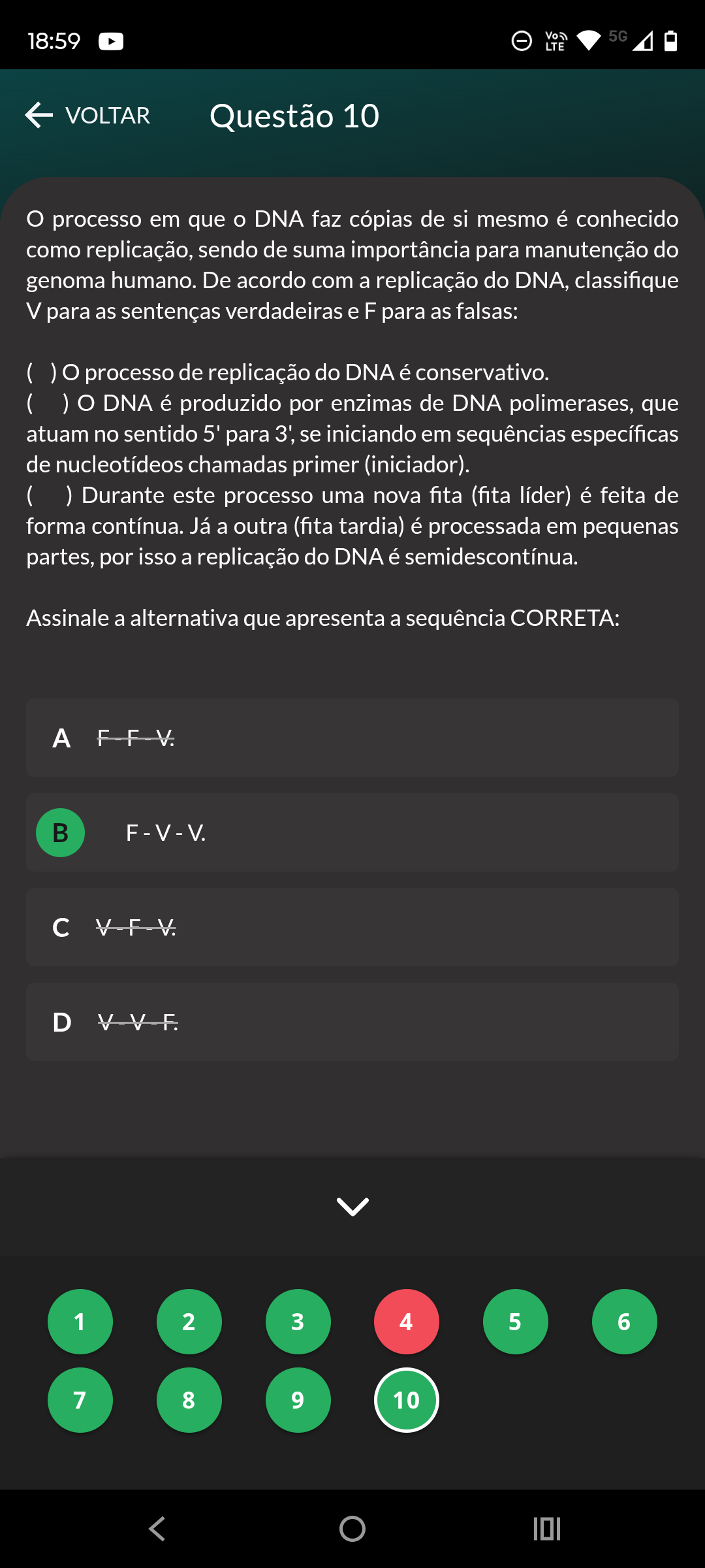 18:59 5G LTE VOLTAR Questão 10 processo em que o DNA faz cópias de si mesmo é conhecido como replicação, sendo de suma importância para manutenção do genoma humano. De acordo com a replicação do DNA, classifique V para as sentenças verdadeiras e F para as falsas: processo de replicação do DNA é conservativo. DNA é produzido por enzimas de DNA polimerases, que atuam no sentido 5' para 3', se iniciando em sequências específicas de nucleotídeos chamadas primer (iniciador). ( ) Durante este processo uma nova fita (fita líder) é feita de forma contínua. Já a outra (fita tardia) é processada em pequenas partes, por isso a replicação do DNA é semidescontínua. Assinale a alternativa que apresenta a sequência CORRETA: c V-F-V. D 1 2 3 4 5 6 7 8 9 10