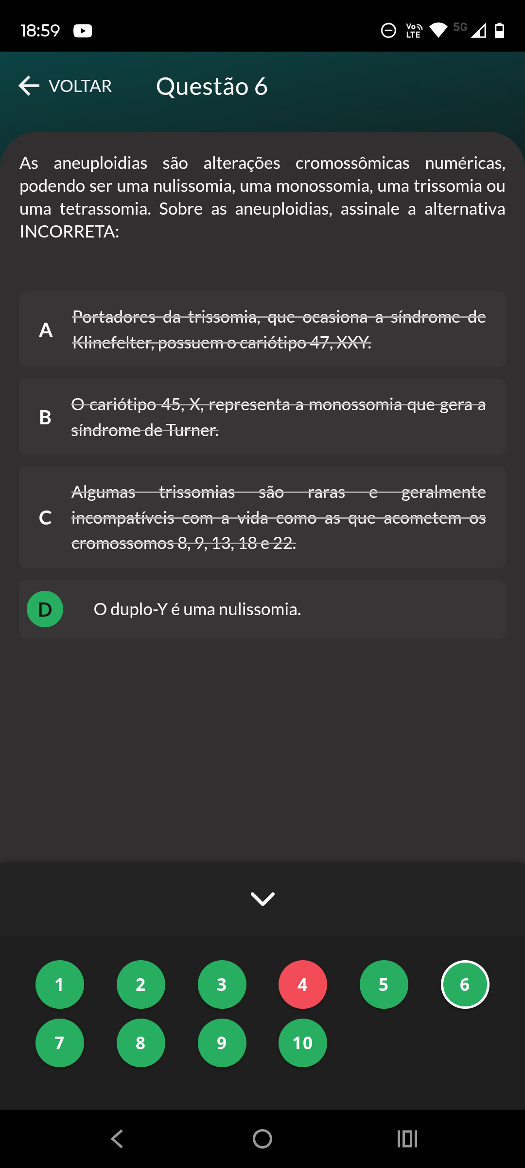18:59 5G - LTE VOLTAR Questão 6 As aneuploidias são alterações cromossômicas numéricas, podendo ser uma nulissomia, uma monossomia, uma trissomia ou uma tetrassomia. Sobre as aneuploidias, assinale a alternativa INCORRETA: Portadores da trissomia, que ocasiona a síndrome de Klinefelter, possuem cariótipo 47, XXY. cariótipo 45, X, representa a monossomia que gera a síndrome de Turner. Algumas trissomias são raras e geralmente c incompatíveis com a vida como as que acometem cromossomos 8, 9, 13, 18 e 22. D duplo-Y é uma nulissomia. 1 2 3 4 5 6 7 8 9 10