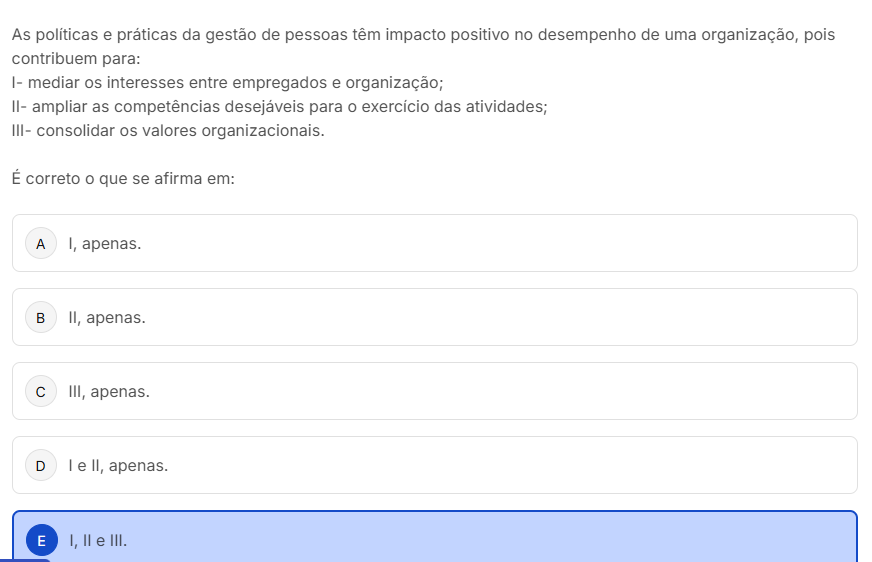 As políticas e práticas da gestão de pessoas têm impacto positivo no desempenho de uma organização, pois contribuem para: I- mediar interesses entre empregados e organização; II- ampliar as competências desejáveis para exercício das atividades; III- consolidar valores organizacionais. É correto O que se afirma em: A I, apenas. B II, apenas. C III, apenas. D I e II, apenas. E I, II e III.