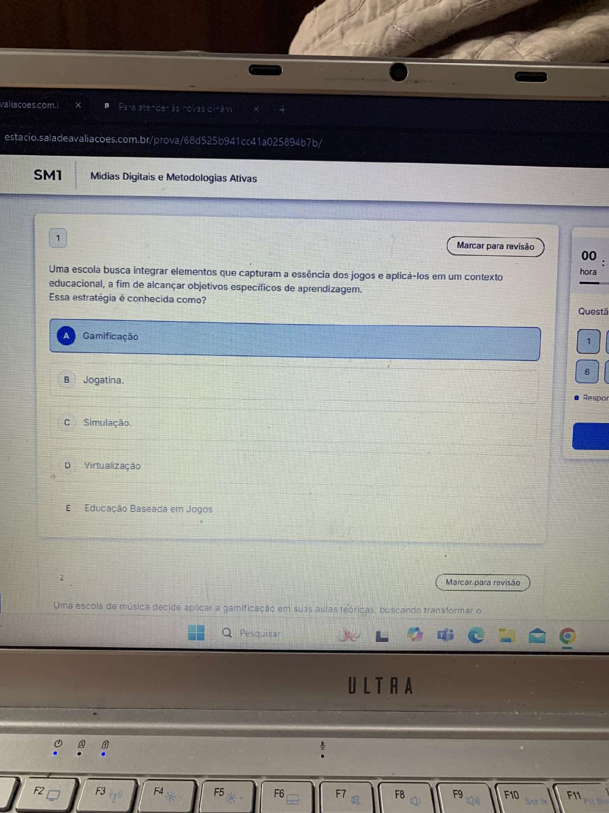 Para às + T estacio.saladeavaliacoes.com.br/prova/68d525b941cc41a025894b7b/ SM1 Midias Digitais e Metodologias Ativas 1 Marcar para revisão 00 Uma escola busca integrar elementos que capturam a essência dos jogos e aplicá-los em um contexto hora educacional, a fim de alcançar objetivos específicos de aprendizagem. Essa estratégia conhecida como? Questã A Gamificação 1 6 B Respor C Simulação. D Virtualização E Educação Baseada em Jogos 2 revisão Uma escola de música decide aplicar a gamificação em suas aulas buscando transformar Pesquisar ULTRA @ F2 F3 F4 F5 F6 F7 F8 F9 F10 F11 Scravaliacoes.com.l Para às novas + Midias Digitais e Metodologias Ativas 2 Marcar para revisão Uma escola de música decide aplicar a gamificação em suas aulas teóricas, buscando transformar 0 aprendizado de teoria musical em uma jornada lúdica e envolvente. Considerando texto, analise as afirmativas abaixo. 00 I. A gamificação não pode ser aplicada ao ensino de teoria musical. hora II. Tornar aprendizado uma jornada lúdica pode aumentar engajamento dos alunos. III. Aulas teóricas não se beneficiam de estratégias de gamificação. Questão Assinale a opção que apresenta somente as alternativas corretas. 1 A Somente a afirmativa está correta 6 B Somente a afirmativa III está correta Respond C Somente as afirmativas e estão corretas D Somente as afirmativas e estão corretas E As afirmativas e III estão corretas 3 Marcar para revisão Pesquisar ULTRA F2 F3 F4 F5 F6 F7 F8 F9 F10 F11Para atender às novas SM1 Midias Digitais e Metodologias Ativas 3 Marcar para revisão Carlos, diretor de uma escola primária, percebeu que alunos tinham dificuldade em se concentrar durante as 00 42 aulas online. Ele está considerando a gamificação como uma estratégia para melhorar a situação. hora min Qual considerar? dos seguintes elementos não é típico em um ambiente de aprendizagem gamificado, que Carlos poderia Questão 3 d A Pontos 1 2 6 7 B Quadros de lideres. Respondidas Desinteresse Finali D Emblemas. E 4 revisão Após implementar a gamificação em sua Prof: João notou uma mudanca no engalamento dos alunos. Pesquisar ULTRA F2 F3 F4 F5 F6 F7 F8 F9 F10 F11 F1X Para atender às novas + tacio.saladeavaliacoes.com.br/prova/68d525b941cc41a025894b7b/ SM1 Midias Digitais e Metodologias Ativas T 4 Marcar para revisão 00 42 46 Após implementar a gamificação em sua escola, Prof. João notou uma mudança no engajamento dos alunos. hora min seg Ele observou que as técnicas de gamificação estimulavam os alunos a serem mais ativos na sala de aula, oferecendo desafios e feedbacks constantes. Considerando texto, analise as afirmativas abaixo. Questão 4 de 10 I. A gamificação visa distrair os alunos do conteúdo educacional. II. Um dos objetivos da gamificação é oferecer opções variadas, desafios e oportunidades de 1 2 3 III. feedback é um elemento dispensável nas técnicas de gamificação. Avalie as alternativas. 6 7 8 Respondidas (10) A Apenas a afirmativa está correta Finalizar B Apenas a afirmativa III está correta C Apenas as afirmativas I e estão corretas D Apenas as afirmativas e estão corretas E Todas afirmativas estão corretas Pesquisar ULTRAPara atender às novas + SM1 Midias Digitais e Metodologias Ativas T 5 Marcar para revisão Um professor de matemática busca implementar a gamificação para lidar com a resistência de seus alunos frente à matéria, utilizando desafios matemáticos como missões a serem resolvidas. 00 42 42 Considerando texto, analise as afirmativas hora min seg I. A resistência dos alunos à matemática pode ser minimizada com estratégias lúdicas. II. Desafios matemáticos não se encaixam como missões em uma estratégia de gamificação. III. A gamificação não envolve elementos como Questão 5 de 10 Assinale a opção que apresenta somente as alternativas corretas 1 2 3 A Somente a afirmativa I está correta. 6 7 8 Respondidas (10) B Somente a afirmativa está correta. Finalizar C Somente a afirmativa III está correta, D Somente as afirmativas I e estão corretas E As afirmativas e estão corretas 6 Marcar para revisão Pesquisar ULTRAPara atender às novas dinâmi X + tacio.saladeavaliacoes.com.br/prova/68d525b941cc41a025894b7b/ SM1 Midias Digitais e Metodologias Ativas T 6 00 42 38 Marcar para revisão hora min seg Sabe-se que a aprendizagem significativa não se coaduna com a ideia de conhecimento linear e seriado. Para desenvolver oportunidades de uma aprendizagem significativa, cabe ao professor: Questão 6 de 10 Manter foco do trabalho disciplinar, graduando ensino que é oferecido aos alunos de maneira 1 2 3 A correspondente à sua capacidade de aprendizagem. 6 7 8 Concentrar ensino nos aspectos cognitivos dos envolvidos no processo, evitando 0 tratamento B Respondidas (10) curricular de referências pessoais, e afetivas oriundas dos alunos. Finalizar Manter processo de comunicação e avaliação, objetivando garantir as aprendizagens previstas para C cada etapa, numa perspectiva ascendente e atenta aos pré-requisitos. Definir processos de gestão do conhecimento pelos alunos para garantir a aprendizagem dos D elementos fundamentais do curriculo nos tempos adequados. Orientar suas ações no sentido de que estudante participe de tarefas e atividades que 0 façam se E aproximar cada vez mais dos conteúdos que a escola para ensinar. Pesquisar ULTRA 1Para atender às novas dinâmi + SM1 Midias Digitais e Metodologias Ativas T 7 Marcar para revisão Em uma aula de Biologia sobre células, um professor decide aplicar a aprendizagem imersiva. Para isso, ele 00 42 35 utiliza um aplicativo de realidade aumentada que projeta endoplasmático e ribossomos em 3D. hora min seg Qual é principal benefício didático da utilização desta tecnologia pelo professor na sua aula? Questão 7 de 10 A Facilitar a memorização dos componentes celulares. 1 2 3 B Permitir a visualização estática dos processos celulares. 6 7 8 Respondidas (1