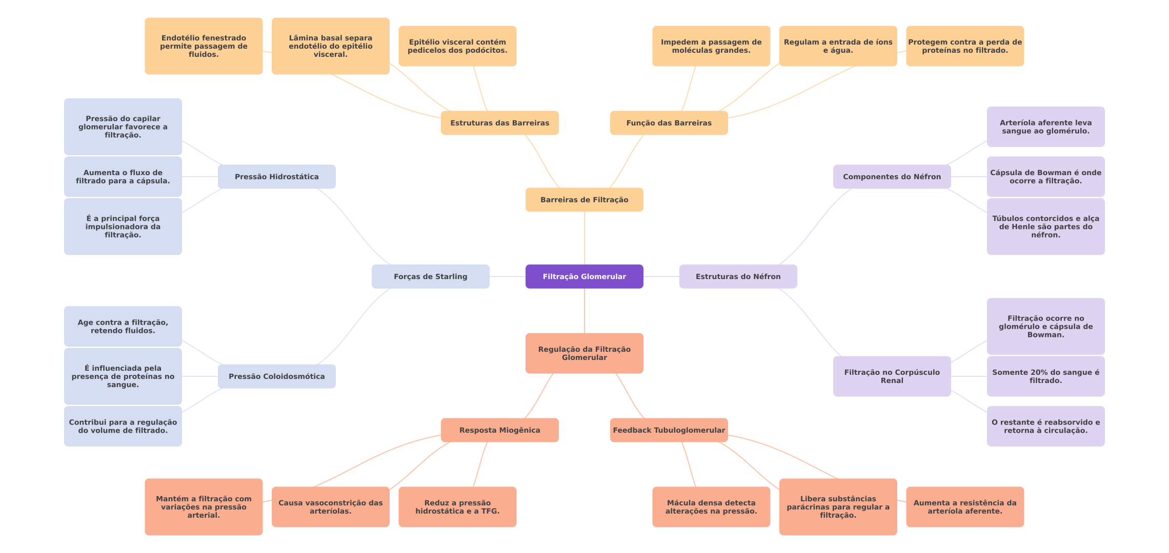 Endotélio fenestrado Lâmina basal separa endotélio do epitélio Epitélio visceral contém permite passagem de Impedem a passagem de Regulam a entrada de íons Protegem contra a perda de fluidos. visceral. pedicelos dos podócitos. moléculas grandes. e água. proteínas no filtrado. Pressão do capilar Estruturas das Barreiras glomerular favorece a Função das Barreiras Arteríola aferente leva filtração. sangue ao glomérulo. Aumenta fluxo de Pressão Hidrostática Componentes do Néfron Cápsula de Bowman é onde filtrado para a cápsula. ocorre a filtração. Barreiras de Filtração É a principal força Túbulos contorcidos e alça impulsionadora da de Henle são partes do filtração. néfron. Forças de Starling Filtração Glomerular Estruturas do Néfron Age contra a filtração, Filtração ocorre no retendo fluidos. glomérulo e cápsula de Bowman. Regulação da Filtração Glomerular É influenciada pela presença de proteínas no Pressão Coloidosmótica Filtração no Corpúsculo Somente 20% do sangue é Renal filtrado. sangue. Contribui para a regulação restante é reabsorvido e do volume de filtrado. Resposta Miogênica Feedback Tubuloglomerular retorna à circulação. Mantém a filtração com Libera substâncias Causa vasoconstrição das Reduz a pressão Mácula densa detecta Aumenta a resistência da variações na pressão arteríolas. hidrostática e a TFG. alterações na pressão. parácrinas para regular a arteríola aferente. arterial. filtração.
