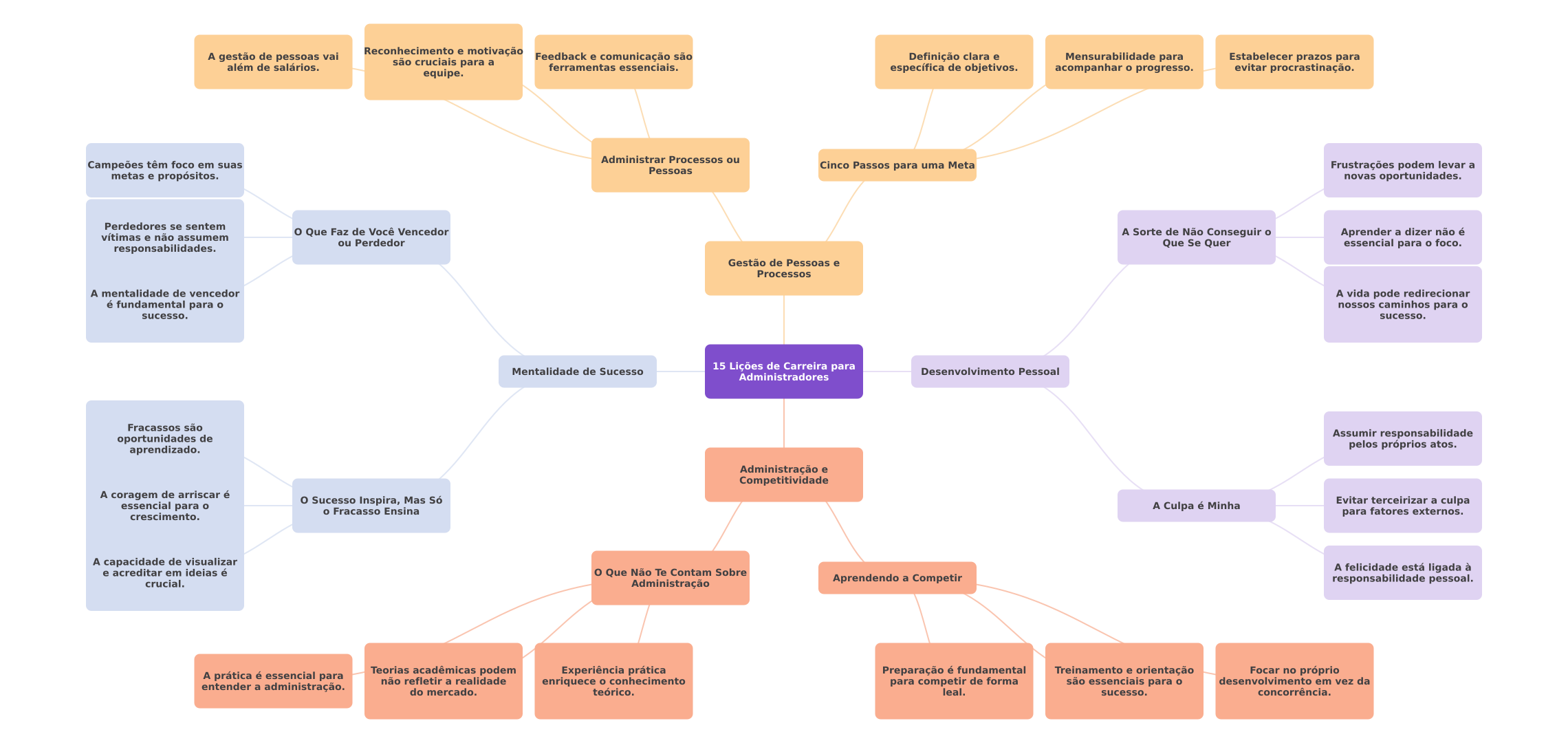 A gestão de pessoas vai Reconhecimento e motivação são cruciais para a Feedback e comunicação são Definição clara e Mensurabilidade para Estabelecer prazos para além de salários. ferramentas essenciais. específica de objetivos. equipe. acompanhar progresso. evitar procrastinação. Administrar Processos ou Campeões têm foco em suas Pessoas Cinco Passos para uma Meta Frustrações podem levar a metas e propósitos. novas oportunidades. Perdedores se sentem vítimas e não assumem Que Faz de Você Vencedor A Sorte de Não Conseguir Aprender a dizer não é ou Perdedor Que Se Quer responsabilidades. essencial para foco. Gestão de Pessoas e Processos A mentalidade de vencedor A vida pode redirecionar é fundamental para nossos caminhos para sucesso. sucesso. Mentalidade de Sucesso 15 Lições de Carreira para Pessoal Administradores Fracassos são oportunidades de Assumir responsabilidade aprendizado. pelos próprios atos. Administração e Competitividade A coragem de arriscar é Sucesso Inspira, Mas Só essencial para Fracasso Ensina A Culpa é Minha Evitar terceirizar a culpa crescimento. para fatores externos. A capacidade de visualizar e acreditar em ideias é Que Não Te Contam Sobre A felicidade está ligada à crucial. Administração Aprendendo a Competir responsabilidade pessoal. A prática é essencial para Teorias acadêmicas podem Experiência prática Preparação é fundamental Treinamento e orientação Focar no próprio não refletir a realidade entender a administração. enriquece conhecimento para competir de forma são essenciais para desenvolvimento em vez da do mercado. teórico. leal. sucesso. concorrência.