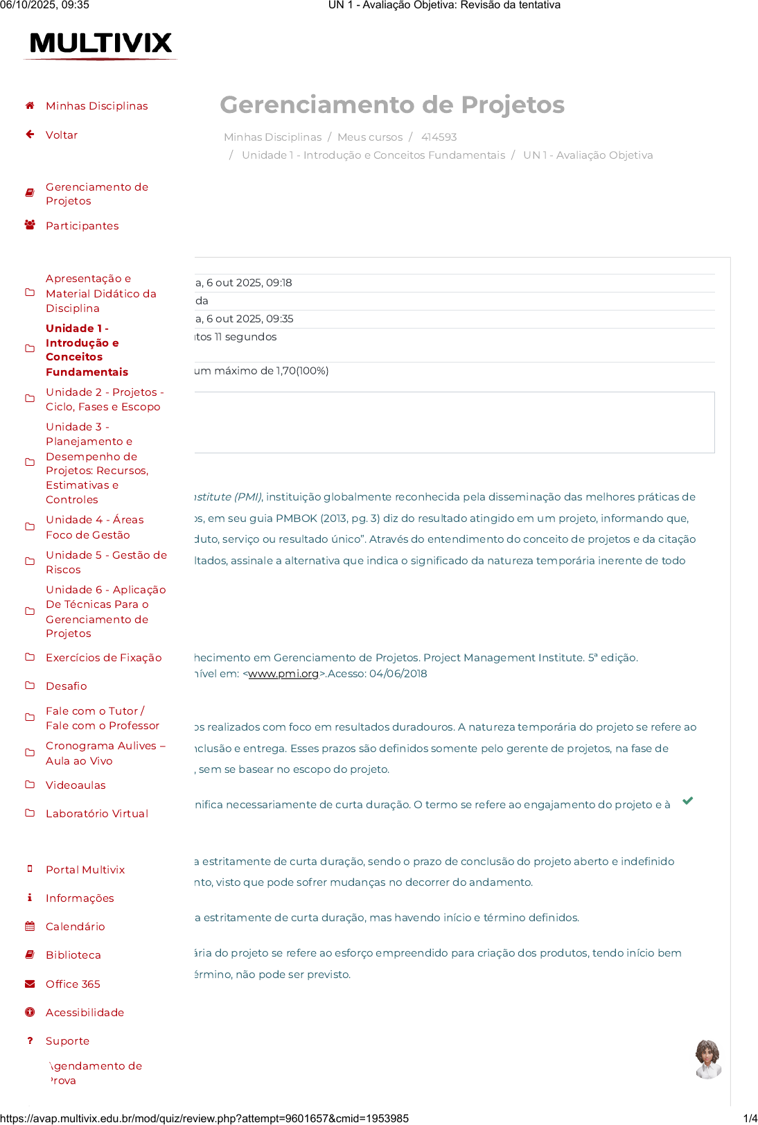 Minhas Disciplinas / Meus cursos / 414593 / Unidade 1 - Introdução e Conceitos Fundamentais / UN 1 - Avaliação Objetiva Gerenciamento de Projetos Iniciado em segunda, 6 out 2025, 09:18 Estado Finalizada Concluída em segunda, 6 out 2025, 09:35 Tempo empregado 17 minutos 11 segundos Avaliar 1,70 de um máximo de 1,70(100%) Questão 1 Correto Atingiu 0,34 de 0,34 O Project Management Institute (PMI), instituição globalmente reconhecida pela disseminação das melhores práticas de gerenciamento de projetos, em seu guia PMBOK (2013, pg. 3) diz do resultado atingido em um projeto, informando que, “cada projeto cria um produto, serviço ou resultado único”. Através do entendimento do conceito de projetos e da citação do PMI referente aos resultados, assinale a alternativa que indica o significado da natureza temporária inerente de todo projeto. Referência: PMBOK. Um Guia do Conhecimento em Gerenciamento de Projetos. Project Management Institute. 5ª edição. Pennsylvania: 2013. Disponível em: .Acesso: 04/06/2018 Escolha uma opção: a. Não existem projetos realizados com foco em resultados duradouros. A natureza temporária do projeto se refere ao prazo médio de conclusão e entrega. Esses prazos são definidos somente pelo gerente de projetos, na fase de controle do projeto, sem se basear no escopo do projeto. b. Temporário não significa necessariamente de curta duração. O termo se refere ao engajamento do projeto e à sua longevidade. c. Temporário significa estritamente de curta duração, sendo o prazo de conclusão do projeto aberto e indefinido desde o planejamento, visto que pode sofrer mudanças no decorrer do andamento. d. Temporário significa estritamente de curta duração, mas havendo início e término definidos. e. A natureza temporária do projeto se refere ao esforço empreendido para criação dos produtos, tendo início bem definido, mas seu término, não pode ser previsto. Minhas Disciplinas Voltar Gerenciamento de Projetos Participantes Apresentação e Material Didático da Disciplina Unidade 1 - Introdução e Conceitos Fundamentais Unidade 2 - Projetos - Ciclo, Fases e Escopo Unidade 3 - Planejamento e Desempenho de Projetos: Recursos, Estimativas e Controles Unidade 4 - Áreas Foco de Gestão Unidade 5 - Gestão de Riscos Unidade 6 - Aplicação De Técnicas Para o Gerenciamento de Projetos Exercícios de Fixação Desafio Fale com o Tutor / Fale com o Professor Cronograma Aulives – Aula ao Vivo Videoaulas Laboratório Virtual Portal Multivix Informações Calendário Biblioteca Office 365 Acessibilidade Suporte Agendamento de Prova 06/10/2025, 09:35 UN 1 - Avaliação Objetiva: Revisão da tentativa https://avap.multivix.edu.br/mod/quiz/review.php?attempt=9601657&cmid=1953985 1/4 https://avap.multivix.edu.br/my/ https://avap.multivix.edu.br/course/view.php?id=35941 https://avap.multivix.edu.br/course/view.php?id=35941§ion=2 https://avap.multivix.edu.br/mod/quiz/view.php?id=1953985 http://www.pmi.org/ https://avap.multivix.edu.br/my/ https://avap.multivix.edu.br/course/view.php?id=35941 https://avap.multivix.edu.br/user/index.php?id=35941 https://avap.multivix.edu.br/course/view.php?id=35941§ion=1 https://avap.multivix.edu.br/course/view.php?id=35941§ion=2 https://avap.multivix.edu.br/course/view.php?id=35941§ion=3 https://avap.multivix.edu.br/course/view.php?id=35941§ion=4 https://avap.multivix.edu.br/course/view.php?id=35941§ion=5 https://avap.multivix.edu.br/course/view.php?id=35941§ion=6 https://avap.multivix.edu.br/course/view.php?id=35941§ion=7 https://avap.multivix.edu.br/course/view.php?id=35941§ion=8 https://avap.multivix.edu.br/course/view.php?id=35941§ion=9 https://avap.multivix.edu.br/course/view.php?id=35941§ion=10 https://avap.multivix.edu.br/course/view.php?id=35941§ion=11 https://avap.multivix.edu.br/course/view.php?id=35941§ion=12 https://avap.multivix.edu.br/course/view.php?id=35941§ion=13 https://avap.multivix.edu.br/hooks/portal/ https://avap.multivix.edu.br/mod/page/view.php?id=1252%2F%22%20target%3D%22_blank https://avap.multivix.edu.br/calendar/view.php/ https://avap.multivix.edu.br/local/staticpage/view.php?page=biblioteca https://multivix.edu.br/office-365/ https://multivix.edu.br/acessibilidade/ https://avap.multivix.edu.br/mod/page/view.php?id=7%2F%22%20target%3D%22_blank https://docs.google.com/forms/d/e/1FAIpQLSfyH1O0KRhpI8B0cFqDv3aXT41lziF0mULzRNTBk2x0miNkNA/viewform https://avap.multivix.edu.br/ https://avap.multivix.edu.br/ https://avap.multivix.edu.br/ https://avap.multivix.edu.br/ https://avap.multivix.edu.br/ Questão 2 Correto Atingiu 0,34 de 0,34 Questão 3 Correto Atingiu 0,34 de 0,34 Sobre as estruturas organizacionais, MOLINARI (2010) informa que “existem três tipos de organização de projetos (...)” Assinale a alternativa que indica quais são os tipos de estruturas das empresas. Referência: MOLINARI, Leonardo. Gestão de Projetos - Teoria, Técnicas e Práticas. São Paulo: Saraiva, 2010. Escolha uma opção: a. Funcional fraca; Funcional equilibrada; Funcional forte. b. Funcional; Matriz; Conceitual. c. Forte; Equilibrada; Fraca. d. Matriz; Projetizada; Conceitual. e. Funcional; Matriz; Projetizada. MOLINARI (2010) descreve as características a serem observadas na composição das equipes de projeto. Assinale a alternativa que indica como podem ser compostas as equipes de projetos. Referência: MOLINARI, Leonardo. Gestão de Projetos - Teoria, Técnicas e Práticas. São Paulo: Saraiva, 2010. Escolha uma opção: a. As equipes de projetos são compostas por membros em tempo parcial ou tempo integral. b. As equipes de projetos são compostas exclusivamente por membros internos de um mesmo departamento c. As equipes de projetos são compostas sempre por membros internos da organização. d. As equipes de projetos são definidas sem levar em consideração o tempo de dedicação. e. Por ser mais rígida, nas empresas com estrutura organizacional funcional, as equipes de projetos 