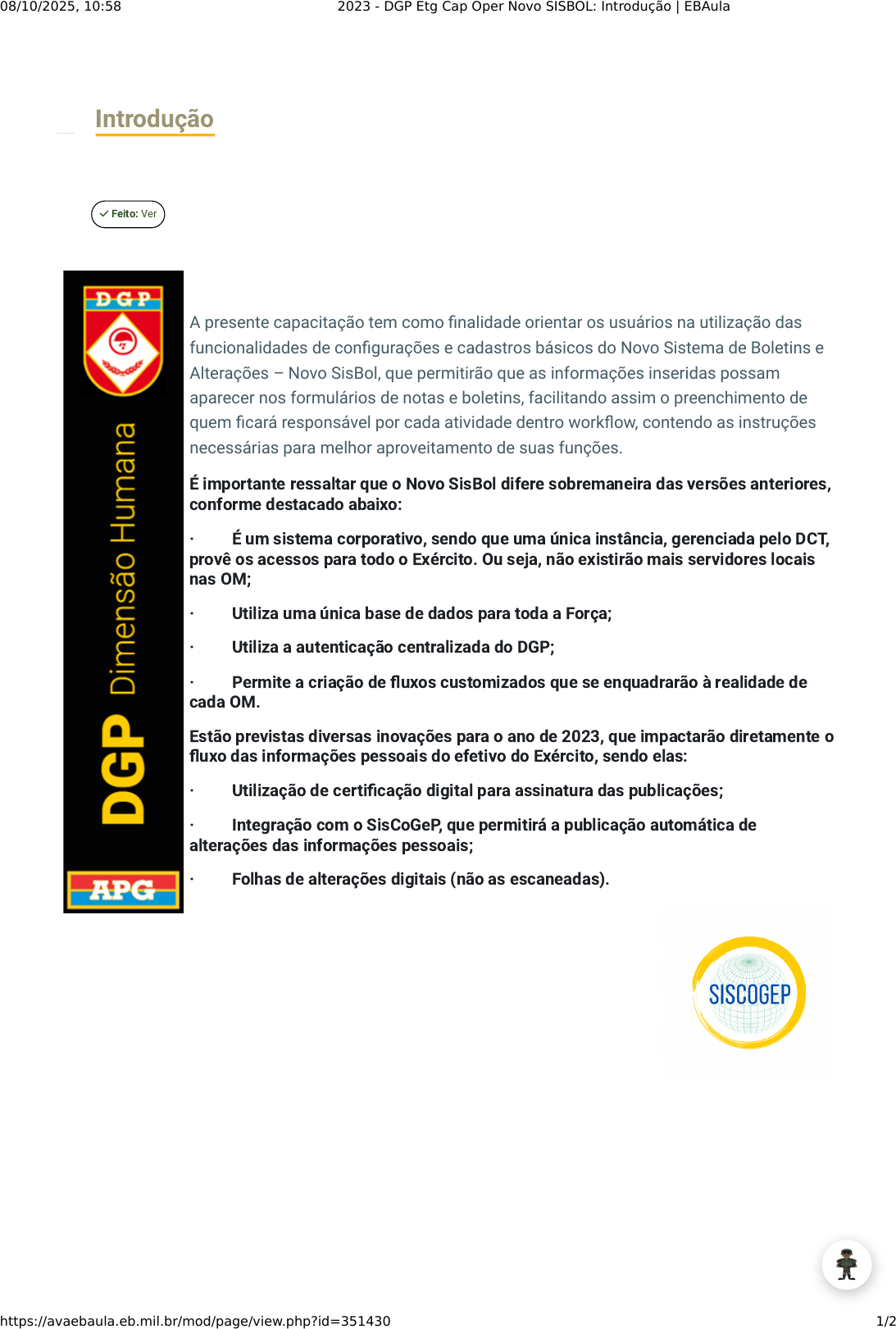 A presente capacitação tem como finalidade orientar os usuários na utilização das funcionalidades de configurações e cadastros básicos do Novo Sistema de Boletins e Alterações – Novo SisBol, que permitirão que as informações inseridas possam aparecer nos formulários de notas e boletins, facilitando assim o preenchimento de quem ficará responsável por cada atividade dentro workflow, contendo as instruções necessárias para melhor aproveitamento de suas funções. É importante ressaltar que o Novo SisBol difere sobremaneira das versões anteriores, conforme destacado abaixo: · É um sistema corporativo, sendo que uma única instância, gerenciada pelo DCT, provê os acessos para todo o Exército. Ou seja, não existirão mais servidores locais nas OM; · Utiliza uma única base de dados para toda a Força; · Utiliza a autenticação centralizada do DGP; · Permite a criação de fluxos customizados que se enquadrarão à realidade de cada OM. Estão previstas diversas inovações para o ano de 2023, que impactarão diretamente o fluxo das informações pessoais do efetivo do Exército, sendo elas: · Utilização de certificação digital para assinatura das publicações; · Integração com o SisCoGeP, que permitirá a publicação automática de alterações das informações pessoais; · Folhas de alterações digitais (não as escaneadas). Introdução ✓ Feito: Ver 08/10/2025, 10:58 2023 - DGP Etg Cap Oper Novo SISBOL: Introdução | EBAula https://avaebaula.eb.mil.br/mod/page/view.php?id=351430 1/2 Consulta de informações referentes aos Militares da OM do usuário logado. A consulta poderá ser realizada pelos parâmetros: Posto graduação, Nome, Identidade, CPF. 1. Acesse a opção de Menu "Militares"; 2. Informe os parâmetros para consulta de militares: Posto graduação, Nome, Identidade, CPF; 3. Acione a opção de pesquisa. Militares ✓ Feito: Ver 08/10/2025, 10:59 2023 - DGP Etg Cap Oper Novo SISBOL: Militares | EBAula https://avaebaula.eb.mil.br/mod/page/view.php?id=353473&forceview=1 1/2 Consulta dos postos graduação cadastrados no banco de dados corporativo. Serão apresentados os dados: Código, Nome e Sigla referentes ao posto graduação. 1. Acesse a opção de menu Posto Graduação. Posto graduação ✓ Feito: Ver 08/10/2025, 11:00 2023 - DGP Etg Cap Oper Novo SISBOL: Posto graduação | EBAula https://avaebaula.eb.mil.br/mod/page/view.php?id=353474&forceview=1 1/2 Consulta as qualificações militares cadastradas no banco de dados corporativo. 1. Acesse a opção de Menu "Qualificação Militar". Qualificação Militar ✓ Feito: Ver 08/10/2025, 11:01 2023 - DGP Etg Cap Oper Novo SISBOL: Qualificação Militar | EBAula https://avaebaula.eb.mil.br/mod/page/view.php?id=353475&forceview=1 1/2 Página principal do curso Módulo VII - Consultas Visão Geral - Novo Sisbol 2023 - DGP - ECONSISBOL - Estágio de Capacitação de Operadores Novo SISBOL Marcar como feito VISÃO GERAL - NOVO SISBOL O fluxo abaixo visa fornecer uma visão geral do Novo Sisbol e tem o objetivo de facilitar o entendimento e orientar os usuários no passo a passo para utilização das funcionalidades de configurações e cadastros básicos do Sistema de Boletins e Alterações – SISBOL, que permitirão que as informações inseridas possam aparecer nos formulários de notas e boletins, facilitando assim o preenchimento de quem ficará responsável por cada atividade dentro do workflow. 08/10/2025, 11:04 Seção: Visão Geral - Novo Sisbol | 2023 - DGP - ECONSISBOL - Estágio de Capacitação de Operadores Novo … https://avaebaula.eb.mil.br/course/view.php?id=10418§ion=1 1/3 https://avaebaula.eb.mil.br/course/view.php?id=10418 https://avaebaula.eb.mil.br/course/view.php?id=10418§ion=8 https://avaebaula.eb.mil.br/course/view.php?id=10418§ion=1 08/10/2025, 11:04 Seção: Visão Geral - Novo Sisbol | 2023 - DGP - ECONSISBOL - Estágio de Capacitação de Operadores Novo … https://avaebaula.eb.mil.br/course/view.php?id=10418§ion=1 2/3 Página principal do curso Visão Geral - Novo Sisbol Módulo VII - Consultas Módulo I - Configuração de Workflow 2023 - DGP - ECONSISBOL - Estágio de Capacitação de Operadores Novo SISBOL ✓ Concluído Um workflow é um processo de negócio para a aprovação de notas e boletins. No contexto do SISBOL, um workflow é estritamente uma série linear de passos de aprovação que culminam em uma aprovação final. Para configuração do workflow é necessário o cadastro de: 08/10/2025, 11:07 Seção: Módulo I - Configuração de Workflow | 2023 - DGP - ECONSISBOL - Estágio de Capacitação de Opera… https://avaebaula.eb.mil.br/course/view.php?id=10418§ion=2 1/3 https://avaebaula.eb.mil.br/course/view.php?id=10418 https://avaebaula.eb.mil.br/course/view.php?id=10418§ion=1 https://avaebaula.eb.mil.br/course/view.php?id=10418§ion=8 https://avaebaula.eb.mil.br/course/view.php?id=10418§ion=2 Visão Geral - Novo Sisbol Seguir para... Módulo VII - Consultas Seção Parte do Boletim Seção do Boletim Tipo de Boletim Categoria Função Cadastrar Seção Pendente Cadastrar Parte do Boletim Pendente Cadastrar Seção do Boletim Pendente Cadastrar Tipo de Boletim Pendente Cadastrar Categoria Pendente Cadastrar Função Pendente Mostrar mais Disponível se: A atividade Cadastrar Seção esteja marcada como concluída ... TAREFA: Configuração de Workflow 08/10/2025, 11:07 Seção: Módulo I - Configuração de Workflow | 2023 - DGP - ECONSISBOL - Estágio de Capacitação de Opera… https://avaebaula.eb.mil.br/course/view.php?id=10418§ion=2 2/3 https://avaebaula.eb.mil.br/course/view.php?id=10418§ion=1 https://avaebaula.eb.mil.br/course/view.php?id=10418§ion=8 https://avaebaula.eb.mil.br/mod/page/view.php?id=351433 https://avaebaula.eb.mil.br/mod/page/view.php?id=351437 https://avaebaula.eb.mil.br/mod/page/view.php?id=351439 https://avaebaula.eb.mil.br/mod/page/view.php?id=351464 https://avaebaula.eb.mil.br/mod/page/view.php?i