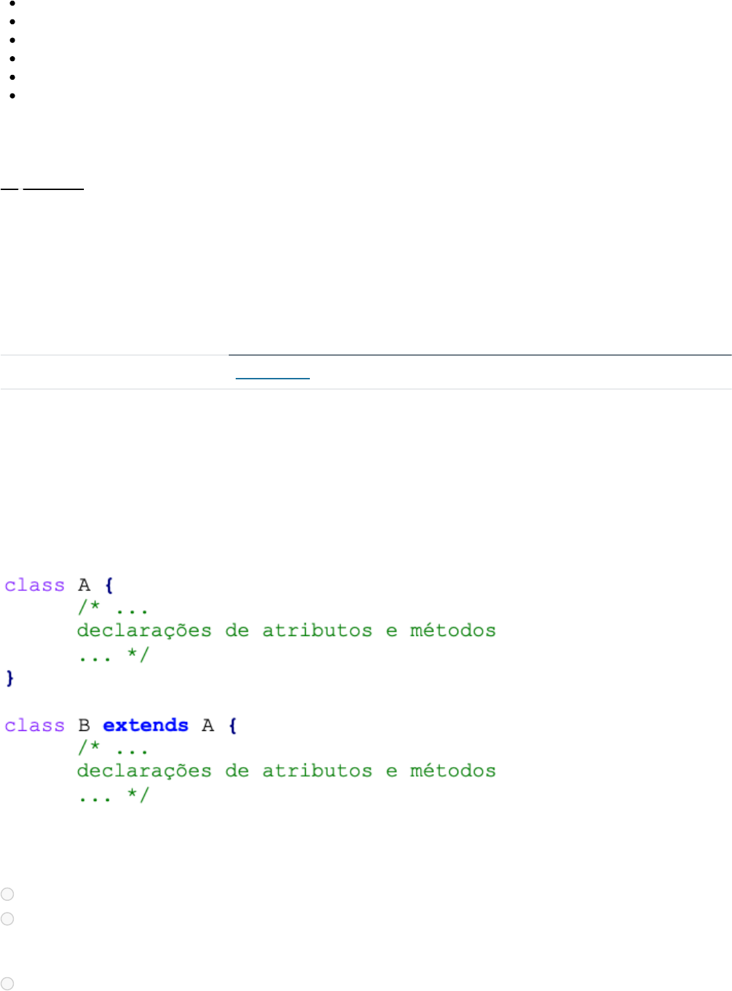 Atividade 3 Entrega 6 jun em 23:59 Pontos 1 Perguntas 5 Disponível 17 fev em 23:59 - 6 jun em 23:59 Limite de tempo Nenhum Tentativas permitidas 2 Instruções Este teste foi travado 6 jun em 23:59. Histórico de tentativas Tentativa Tempo Pontuação MAIS RECENTE Tentativa 1 19 minutos 0,8 de 1 Pontuação desta tentativa: 0,8 de 1 Enviado 2 jun em 10:02 Esta tentativa levou 19 minutos. Pergunta 1 0,2 / 0,2 pts Métodos da classe A possuem acesso a todos os atributos da classe B. Objetos da classe A possuem todos os atributos e métodos da classe B, podendo possuir também outros métodos e atributos. Métodos da classe B com o mesmo nome de métodos da classe A serão idênticos aos da classe A. Correto! Importante: Caso você esteja realizando a atividade através do aplicativo "Canvas Student", é necessário que você clique em "FAZER O QUESTIONÁRIO", no final da página. Analise os trechos de código abaixo: O que podemos afirmar sobre a relação entre as classes A e B? 11/06/25, 08:48 Atividade 3: NATALIE BIANCHI CORRADINI (Ela/a) https://famonline.instructure.com/courses/44695/assignments/283878/submissions/131295 1/5 https://famonline.instructure.com/courses/44695/quizzes/214181/history?version=1 Objetos da classe B possuem todos os atributos e métodos da classe A, podendo possuir também outros métodos e atributos. Alternativa correta. A classe B é herdeira de classe A. Com isso, todos os atributos e métodos de A automaticamente passam a existir para B. O oposto não necessariamente ocorre: a classe B pode implementar novos atributos e métodos, e eles não existirão para A. Além disso, a classe B pode sobrepor os métodos da classe B, ou seja, reescrever a funcionalidade de um método mantendo o mesmo nome. Por fim, o acesso de uma classe aos atributos da outra depende dos modificadores de acesso utilizados: a classe A só terá acesso a atributos públicos da classe B. A classe B, por ser herdeira de A, terá acesso a seus atributos públicos e também aos protegidos, mas não aos privados (mesmo possuindo esses atributos por herança). Métodos da classe B possuem acesso a todos os atributos da classe A. Pergunta 2 0,2 / 0,2 pts A classe-filho automaticamente herda os atributos e as funcionalidades da classe-pai. A este efeito dá-se o nome de abstração. A classe-filho automaticamente herda os atributos e as funcionalidades da classe-pai. A este efeito dá-se o nome de acoplamento. Correto! A classe-filho automaticamente herda os atributos e as funcionalidades da classe-pai. A este efeito dá-se o nome de herança. A alternativa está correta. A classe-filho automaticamente herda os atributos e as funcionalidades da classe-pai. A este efeito dá-se o nome de herança. A classe-filho automaticamente herda os atributos e as funcionalidades da classe-pai. A este efeito dá-se o nome de encapsulamento. A classe-filho automaticamente herda os atributos e as funcionalidades da classe-pai. A este efeito dá-se o nome de polimorfismo. Pergunta 3 0,2 / 0,2 pts Leia o texto a seguir: “Uma classe pode assumir alguns comportamentos. Por exemplo, uma classe pode ser definida a partir de outra classe já existente. Nesse caso a classe definida a partir de uma classe existente é chamada de classe-filho (ou subclasse), enquanto a classe existente é denominada classe-pai. É possível determinar famílias de classes através de um conceito de hierarquia de classes.“ Fonte: MANZANO, J. A. N. G. Java 7: programação de computadores: guia prática de introdução, orientação e desenvolvimento. São Paulo: Érica, 2011. Considerando as informações apresentadas, assinale a opção correta: Ao desenvolver um sistema para controlar hidrômetros e relógios utilizados para registrar o consumo de água, é preciso observar que estes dois instrumentos possuem características e 11/06/25, 08:48 Atividade 3: NATALIE BIANCHI CORRADINI (Ela/a) https://famonline.instructure.com/courses/44695/assignments/283878/submissions/131295 2/5 Composição e agregação. Abstração e composição. Correto! Herança e polimorfismo. A alternativa está correta. Herança e polimorfismo são os conceitos de orientação a objetos implementados pelo desenvolvedor apresentado no texto. Herança é o processo de criação de uma nova classe, estendendo uma classe existente. A classe filha herda seus atributos e métodos e, caso precise especificar seu comportamento, ela pode redefinir um ou mais métodos herdados através do mecanismo de polimorfismo. Herança e visibilidade. Agregação e polimorfismo. Pergunta 4 0,2 / 0,2 pts Na hierarquia de classes, pode-se inferir que a subclasse é uma generalização de superclasse. A herança é implementada quando existe um relacionamento de polimorfismo entre as classes. Correto! A herança permite criar novas classes a partir de classes já existentes, aproveitando-se das características existentes na classe a ser estendida. Alternativa correta. A herança é a criação de uma nova classe, que herda características de uma classe existente. A herança é um princípio da O.O. que permite a economia de tempo durante o desenvolvimento, através da reutilização de estruturas que já foram testadas, depuradas e com alta qualidade, o que aumenta a probabilidade de maior eficiência na sua manutenção. A herança permite que estruturas comuns sejam compartilhadas entre diversos objetos, com redundância e abstração. A herança permite que classes derivadas de uma mesma subclasse podem invocar métodos com identificações diferentes, mas comportamentos iguais. comportamento tanto comuns quanto específicos. Neste contexto, o desenvolvedor utilizou alguns conceitos fundamentais da orientação a objetos referentes à estrutura das classes para reutilização de código e outros relacionados ao chamamento de métodos com mesma assinatura, considerando as especificidades da operação dos hidrômetros. Assinale a alternativa com os conceitos de orientação a