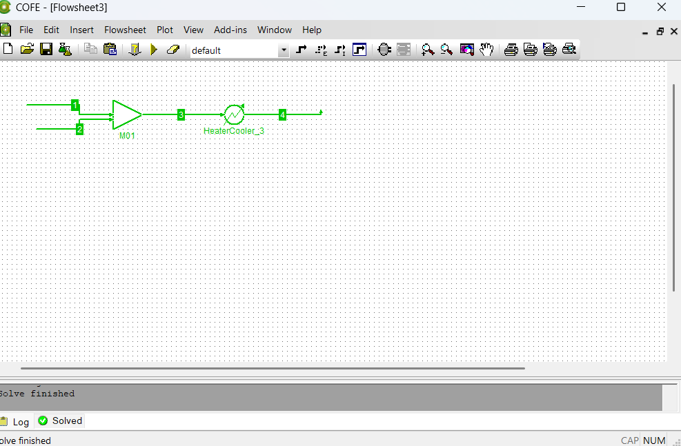 COFE [Flowsheet3] - X File Edit Insert Flowsheet Plot View Add-ins Window Help - X default E I M01 HeaterCooler_3 Solve finished Log Solved finished CAP NUM