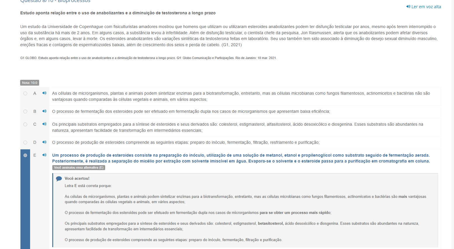 Ler em voz alta Estudo aponta relação entre uso de anabolizantes e a diminuição de testosterona a longo prazo Um estudo da Universidade de Copenhague com fisiculturistas amadores mostrou que homens que utilizam ou utilizaram esteroides anabolizantes podem ter disfunção testicular por anos, mesmo após terem interrompido 0 uso da substância há mais de 2 anos. Em alguns casos, a substância levou à infertilidade. Além de disfunção testicular, cientista chefe da pesquisa, Jon Rasmussen, alerta que anabolizantes podem afetar diversos órgãos e, em alguns casos, levar à morte. Os esteroides anabolizantes são variações sintéticas da testosterona feitas em laboratório. Seu uso também tem sido associado à diminuição do desejo sexual diminuído masculino, ereções fracas e contagens de espermatozoides baixas, além de crescimento dos seios e perda de cabelo. (G1, 2021) G1 Estudo aponta relação entre uso de anabolizantes e a diminuição de testosterona a longo prazo. G1: Globo Comunicação e Participações. Rio de Janeiro: 10 mar. 2021. Nota: 10.0 A As células de microrganismos, plantas e animais podem sintetizar enzimas para a biotransformação, entretanto, mas as células microbianas como fungos filamentosos, actinomicetos e bactérias não são vantajosas quando comparadas às células vegetais e animais, em vários aspectos; B processo de fermentação dos esteroides pode ser efetuado em fermentação dupla nos casos de microrganismos que apresentam baixa eficiência; C Os principais substratos empregados para a de esteroides e seus derivados são: colesterol, estigmasterol, alfasitosterol, ácido desoxicólico e diosgenina. Esses substratos são abundantes na natureza, apresentam facilidade de transformação em intermediários essenciais; D processo de produção de esteroides compreende as seguintes etapas: preparo do inóculo, fermentação, filtração, resfriamento e purificação; E Um processo de produção de esteroides consiste na preparação do inóculo, utilização de uma solução de metanol, etanol e propilenoglicol como substrato seguido de fermentação aerada. Posteriormente, é realizada a separação do micélio por extração com solvente em água. Evapora-se solvente e esteroide passa para a purificação em cromatografia em coluna. Você assinalou essa alternativa (E) Você acertou! Letra E está correta porque: As células de microrganismos, plantas e animais podem sintetizar enzimas para a biotransformação, entretanto, mas as células microbianas como fungos filamentosos, actinomicetos e bactérias são mais vantajosas quando comparadas às células vegetais e animais, em vários aspectos; processo de fermentação dos esteroides pode ser efetuado em fermentação dupla nos casos de microrganismos para se obter um processo mais rápido; Os principais substratos empregados para a sintese de esteroides e seus derivados são: colesterol, estigmasterol, betasitosterol, ácido desoxicólico e diosgenina. Esses substratos são abundantes na natureza, apresentam facilidade de transformação em intermediários essenciais; 0 processo de produção de esteroides compreende as seguintes etapas: preparo do inóculo, fermentação, filtração e purificação.
