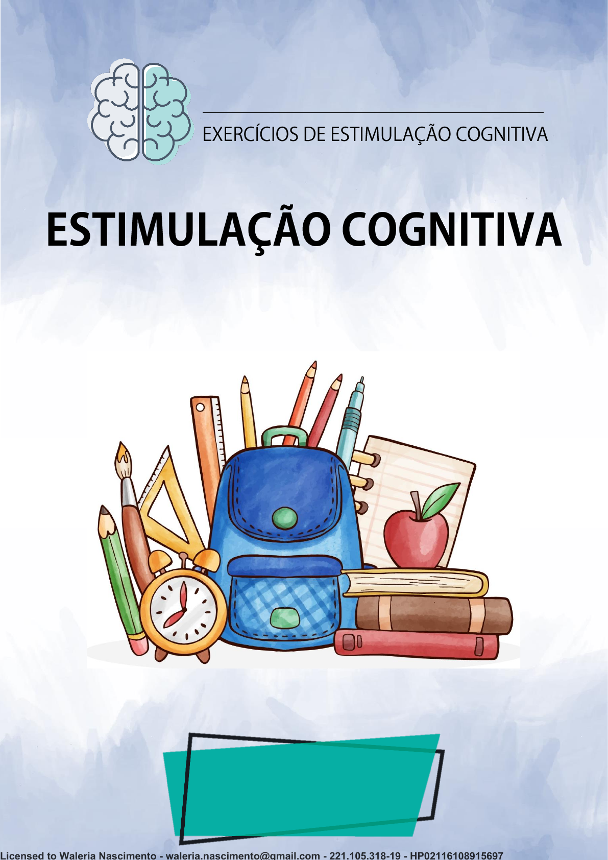 VOLUME 01 PARA CRIANÇAS COM DIFICULDADE DE APRENDIZAGEM COGNITIVAMENTE Licensed to Waleria Nascimento - waleria.nascimento@gmail.com - 221.105.318-19 - HP02116108915697 www.ecognitivamente.com.br COGNITIVAMENTE VOLUME 01 A estimulação cognitiva infantil inclui todas as atividades que desenvolvem, melhoram e estimulam as funções cognitivas em crianças, entre elas estão a memória, atenção, percepção, linguagem e funções executivas. Todas estas habilidades funcionam de forma conjunta, mas cada uma delas desempenha um papel importante no desenvolvimento intelectual. Criamos um material de desafio gradativo para potencializar o cérebro integralmente. Neste volume você irá encontrar 40 exercícios práticos para estimular a memória. Licensed to Waleria Nascimento - waleria.nascimento@gmail.com - 221.105.318-19 - HP02116108915697 COGNITIVAMENTE 3 www.ecognitivamente.com.br PREFÁCIO O e-book que você tem em mãos faz parte de um conjunto de exercícios de Estimulação Cognitiva infantil que foram desenvolvidos para profissionais e familiares, para que tenham de fácil acesso um recurso útil para o tratamento de crianças com dificuldades de aprendizagem e que possuem necessidades educacionais especiais. Os 40 exercícios deste caderno possuem graus de exigência diferentes. É importante ressaltar que este recurso é apenas uma parte de um de um tratamento que deve ser oferecido para melhorar os processos de aprendizagem e o desempenho escolar na infância. Espero que este material possa contribuir para melhorar vidas e potencializar a autonomia, promovendo transformações que irão fazer as pessoas mais felizes e realizadas através da estimulação e reabilitação cognitiva. ÁLIDA ANDRADE Álida Andrade é Terapeuta Ocupacional formada pela Universidade Federal de Minas Gerais (UFMG). Especialista em Saúde Mental. Pós-graduada em Neuropsicopedagogia Clínica e em Neuropsicologia com Ênfase em Reabilitação Cognitiva. Atua com reabilitação e estimulação cognitiva de crianças, adultos e idosos. Também é consultora em inclusão escolar. @ecognitivamente Licensed to Waleria Nascimento - waleria.nascimento@gmail.com - 221.105.318-19 - HP02116108915697 https://www.facebook.com/ecognitivamente/ https://www.instagram.com/ecognitivamente/ COGNITIVAMENTE 4 www.ecognitivamente.com.br ÍNDICE HABILIDADES COGNITIVAS NO APRENDIZADO ................................................ 05 ESTIMULAÇÃO COGNITIVA INFANTIL ................................................................ 08 MEMÓRIA ............................................................................................................. 09 INSTRUÇÕES E RECOMENDAÇÕES .................................................................... 11 ATIVIDADES .......................................................................................................... 14 RESPOSTAS ........................................................................................................... 60 REFERÊNCIAS BIBLIOGRÁFICAS ......................................................................... 65 DIREITOS AUTORAIS ............................................................................................ 66 Licensed to Waleria Nascimento - waleria.nascimento@gmail.com - 221.105.318-19 - HP02116108915697 COGNITIVAMENTE 5 www.ecognitivamente.com.br HABILIDADES COGNITIVAS NO APRENDIZADO A aprendizagem envolve uma série de fatores e experiências ligadas às habilidades cognitivas. Pois, ensinar é mais que transmitir conteúdos e aprender também não é um processo linear, pois depende de características emocionais e sociais desenvolvidas ao longo da vida. A cognição é o processo usado pelo cérebro para reconhecer e organizar informações por meio da atenção, memória, imaginação, associação, raciocínio etc. É importante que as habilidades cognitivas das crianças sejam estimuladas pois são grandes responsáveis pelo desempenho nos estudos. Uma baixa habilidade cognitiva faz com que o processamento de informações seja mais difícil e lento. Esta é a razão pela qual o treinamento cerebral é tão importante. AS PRINCIPAIS HABILIDADES COGNITIVAS Embora exista várias habilidades cognitivas, podemos destacar seis que são fundamentais para a aprendizagem: Percepção: é a capacidade cognitiva básica de ser capaz de capturar estímulos ou sinais do ambiente através de nossos sentidos e, assim, transmiti-los ao nosso cérebro para poder representá-lo e interpretá-lo mentalmente. É uma capacidade essencial para poder ativar o restante das funções cognitivas. Licensed to Waleria Nascimento - waleria.nascimento@gmail.com - 221.105.318-19 - HP02116108915697 COGNITIVAMENTE 6 www.ecognitivamente.com.br Atenção: após a percepção, a atenção é a próxima capacidade cognitiva na entrada de informações para o nosso cérebro. A capacidade de atenção consiste na habilidade do cérebro filtrar o que realmente é importante e excluir as distrações. Com as distrações e estímulos externos, muitas pessoas podem apresentar dificuldade para fazer com que a mente se mantenha focada nas tarefas do dia a dia. A percepção e atenção ocorrendo de forma correta, conseguimos ter sucesso no restante dos processos cognitivos em relação às informações obtidas. Memória: toda vez que a informação chega ao nosso cérebro a memória entra em jogo. A codificação (como preparamos as informações para armazenamento posterior), armazenamento (retenção de dados) e recuperação (lembrando as informações quando necessário) é essencial para o aprendizado. Linguagem: a linguagem é a capacidade que temos para expressar pensamentos e sentimentos através das palavras. É a ferramenta que usamos para nos comunicar, organizar e transmitir as informações que temos sobre nós mesmos e o mundo. Linguagem e pensamento se desenvolvem em paralelo e estão intimamente relacionados, influenciando- se mutuamente. Raci