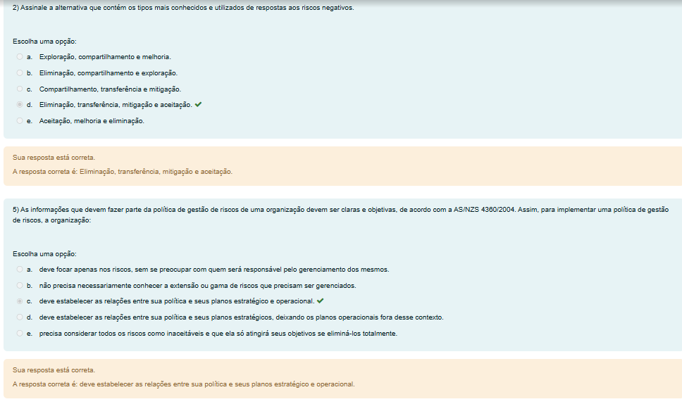 2) Assinale a alternativa que os tipos mais conhecidos e utilizados de respostas aos riscos negativos. Escolha uma opção: a. Exploração, compartilhamento e b. Eliminação, compartilhamento e exploração. Compartilhamento, transferência e mitigação. d. Eliminação, mitigação e aceitação. e. Aceitação, melhoria e eliminação. Sua resposta está correta. A resposta correta é: Eliminação, transferência, mitigação e aceitação. 5) As informações que devem fazer parte da política de gestão de riscos de uma organização devem ser claras e objetivas, de acordo com a AS/NZS 4360/2004. Assim, para implementar uma política de gestão de riscos, a organização: Escolha uma opção: a. deve focar apenas nos riscos, sem se preocupar com quem será responsável pelo gerenciamento dos b. não precisa necessariamente conhecer a extensão ou gama de riscos que precisam ser gerenciados. c. deve estabelecer as relações entre sua política e seus planos estratégico e operacional. d. deve estabelecer as relações entre sua política e seus planos deixando os planos operacionais fora desse e. precisa considerar todos os riscos como inaceitáveis e que ela só atingirá seus objetivos se eliminá-los Sua resposta está correta. A resposta correta é: deve estabelecer as relações entre sua e seus planos estratégico e operacional.