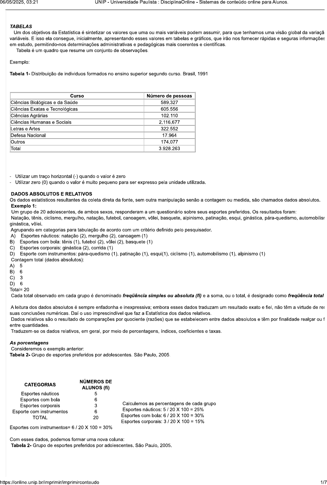 06/05/2025, 03:21 UNIP Universidade Paulista DisciplinaOnline Sistemas de conteúdo online para Alunos. TABELAS Um dos objetivos da Estatística é sintetizar os valores que uma ou mais variáveis podem assumir, para que tenhamos uma visão global da variaçã variáveis. E isso ela consegue, inicialmente, apresentando esses valores em tabelas e gráficos, que irão nos fornecer rápidas e seguras informações em estudo, permitindo-nos determinações administrativas e pedagógicas mais coerentes e científicas. Tabela é um quadro que resume um conjunto de observações. Exemplo: Tabela 1- - Distribuição de individuos formados no ensino superior segundo curso. Brasil, 1991 Curso Número de pessoas Ciências Biológicas e da Saúde 589.327 Ciências Exatas e Tecnológicas 605.556 Ciências Agrárias 102.110 Ciências Humanas e Sociais 2.116.677 Letras e Artes 322.552 Defesa Nacional 17.964 Outros 174.077 Total 3.928.263 Utilizar um traço horizontal (-) quando o valor é zero Utilizar zero (0) quando o valor é muito pequeno para ser expresso pela unidade utilizada. DADOS ABSOLUTOS E RELATIVOS Os dados estatísticos resultantes da coleta direta da fonte, sem outra manipulação senão a contagem ou medida, são chamados dados absolutos. Exemplo 1: Um grupo de 20 adolescentes, de ambos sexos, responderam a um questionário sobre seus esportes preferidos. Os resultados foram: Natação, tênis, ciclismo, mergulho, natação, futebol, canoagem, vôlei, basquete, alpinismo, patinação, esqui, ginástica, pára-quedismo, automobilisr ginástica, vôlei. Agrupando em categorias para tabulação de acordo com um critério definido pelo pesquisador. A) Esportes náuticos: natação (2), mergulho (2), canoagem (1) B) Esportes com bola: tênis (1), futebol (2), vôlei (2), basquete (1) C) Esportes corporais: ginástica (2), corrida (1) D) Esporte com instrumentos: pára-quedismo (1), patinação (1), esqui(1), ciclismo (1), automobilismo (1), alpinismo (1) Contagem total (dados absolutos): A) 5 B) 6 C) 3 D) 6 Total= 20 Cada total observado em cada grupo é denominado freqüência simples ou absoluta (fi) e a soma, ou total, é designado como freqüência total A leitura dos dados absolutos é sempre enfadonha e inexpressiva; embora esses dados traduzam um resultado exato e fiel, não têm a virtude de res suas conclusões numéricas. Daí o uso imprescindível que faz a Estatística dos dados relativos. Dados relativos são o resultado de comparações por quociente (razões) que se estabelecem entre dados absolutos e têm por finalidade realçar ou f entre quantidades. Traduzem-se os dados relativos, em geral, por meio de percentagens, índices, coeficientes e taxas. As porcentagens Consideremos o exemplo anterior: Tabela 2- Grupo de esportes preferidos por adolescentes. São Paulo, 2005. NÚMEROS DE CATEGORIAS ALUNOS (fi) Esportes náuticos 5 Esportes com bola 6 Esportes corporais 3 Calculemos as percentagens de cada grupo Esporte com instrumentos 6 Esportes náuticos: 5 20 X 100 25% TOTAL 20 Esportes com bola: Esportes corporais: Esportes com instrumentos= 6 / 100 = 30% Com esses dados, podemos formar uma nova coluna: Tabela 2- Grupo de esportes preferidos por adolescentes. São Paulo, 2005. 1/706/05/2025, 03:21 UNIP Universidade Paulista DisciplinaOnline Sistemas de conteúdo online para Alunos. NÚMEROS DE PORCENTAGEM DE CATEGORIAS ALUNOS (fi) ALUNOS (f%) Esportes náuticos 5 30 Esportes com bola 6 25 Esportes corporais 3 15 Esporte com instrumentos 6 30 TOTAL 20 100 emprego da porcentagem é de grande valia quando é nosso intuito destacar a participação da parte no todo. Exemplo 2: Foi questionada a idade de 20 adolescentes com os seguintes resultados: Para apresentar estes dados em tabelas devemos agrupá-los. Cada grupo será denominado de classe ou categoria. A amplitude do intervalo da cla pelo pesquisador. Neste caso, iremos usar a amplitude de 2 anos: Tabela 3- Distribuição de adolescentes segundo faixa etária. São Paulo, 2005. Faixa etária n % 12 14 3 15 14 16 5 25 16 18 5 25 18 20 7 35 TOTAL 20 100 Sendo que n = frequencia absoluta e % = frequencia relativa Intervalo de classe: o sinal indica que o valor menor do intervalo esta incluso porém o maior não esta incluso, no primeiro intervalo de classe (12 indica que neste intervalo estão os individuos com idade até 13,99999... anos, porém não o valor de 14. Freqüência acumulada É obtida repetindo-se o primeiro valor de frequencia (absoluta ou relativa) e somando-se os demais: PORCENTAGEM NÚMEROS DE PORCENTAGEM DE Faixa etária ACUMULADA DE ALUNOS (fi) ALUNOS (f%) ALUNOS (fa%) 12 |-- 14 3 15 15 14 16 5 25 40 (15 + 25) 16 |-- 18 5 25 65 (40 + 25) 18 20 7 35 100 (65 + 35) TOTAL 20 100 100 A porcentagem acumulada pode ser feita a partir da frequência absoluta ou relativa. Referenciais CRESPO, Estatística fácil. 19. ed. São Paulo: Saraiva, 2009. VIEIRA, S. Introdução à Bioestatística. 4. ed. São Paulo: Elsevier, 2008 Link: https://books.google.com.br/books?hl=pt- Exercício 1: As porcentagens da tabela abaixo são respectivamente: de alunos% A 175 2/706/05/2025, 03:21 UNIP Universidade Paulista : DisciplinaOnline Sistemas de conteúdo online para Alunos. 222 202 TOTAL 599 100 A) A- 38%; B-17%; C-45% B) A-29%; B-37%; C-34% C) A-25%; C-54% D) A-18%; B-29%; C-55% E) A-12%; B-29%; C-59% Exercício 2: Distribuição de freqüência é um método de se agrupar dados em classes a fim de mensurar os resultados de cada classe. Um dos bastante utilizada é a relativa, que pode ser representada por: A) Dados absolutos B) Porcentagens C) Intervalos de classe D) Categorias de variáveis E) Soma das frequencias absolutas Exercício 3: Com a distribuição de frequencias apresentadas em tabelas ou gráficos podemos resumir e visualizar um conjunto de dados sem p conta os valores individuais. Considerando a natureza da variável, é correto afirmar que é possivel calcular as frequencias (simples acumulada) para os seguintes t
