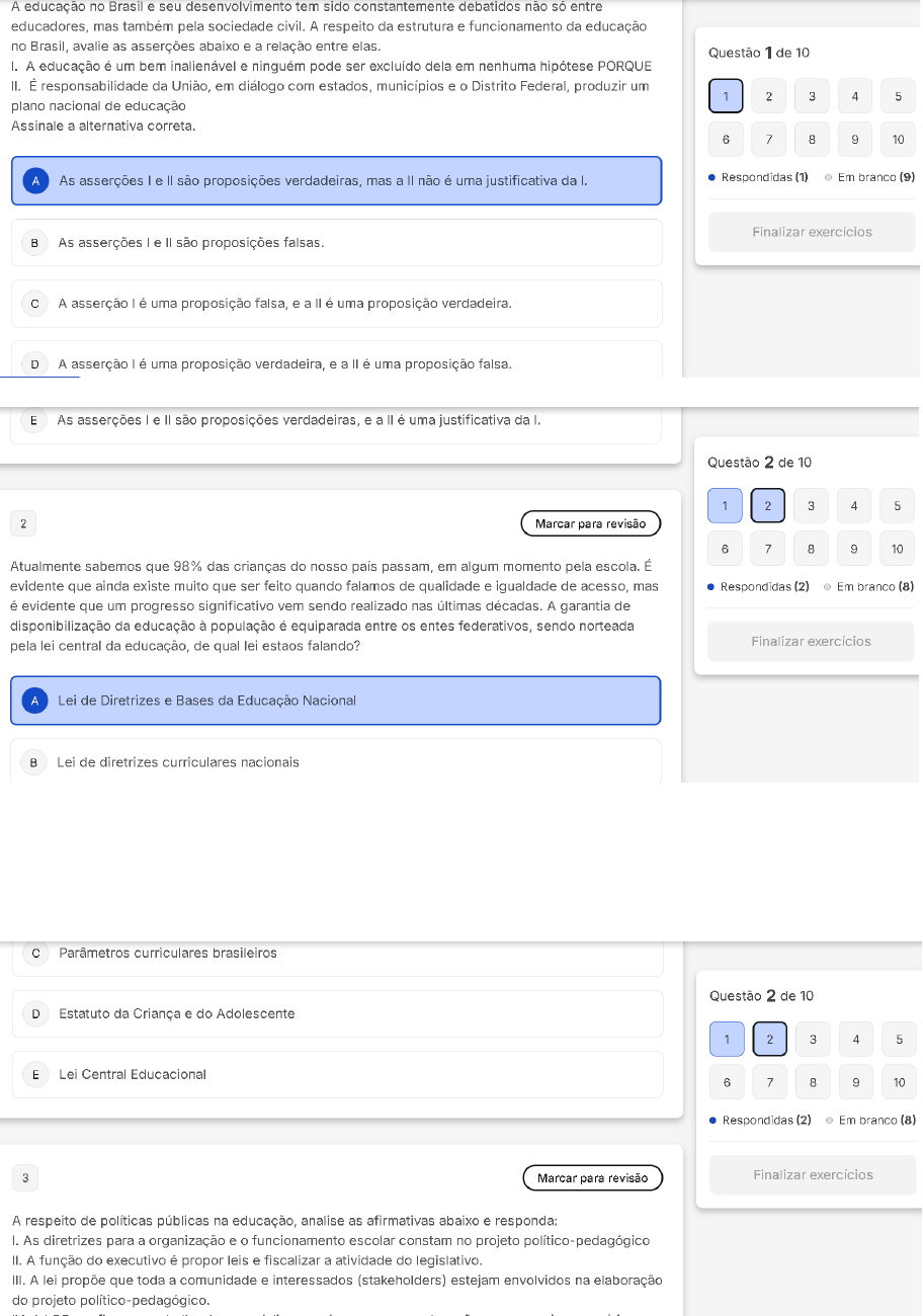 EXERCICIO Tema 4 - Estrutura e Funcionamento da Educação no Brasil- 10,0 ACERTOS 1 A educação no Brasil e seu desenvolvimento tem sido constantemente debatidos não só entre educadores, mas também pela sociedade civil. A respeito da estrutura e funcionamento da educação no Brasil, avalie as asserções abaixo e a relação entre elas. I- A educação é um bem inalienável e ninguém pode ser excluído dela em nenhuma hipótese PORQUE II- É responsabilidade da união, em diálogo com estados, municípios e o distrito federal, produzir um plano nacional de educação. Assinale a alternativa correta: LETRA: A 2 Atualmente sabemos que 98% das crianças do nosso país passam, em algum momento pela escola. É evidente que ainda existe muito que ser feito quando falamos de qualidade e igualdade de acesso, mas é evidente que um progresso significativo vem sendo realizado nas últimas décadas. A garantia de disponibilização da educação à população é equiparada entre os entes federativos, sendo norteada pela lei central da educação, de qual lei estamos falando? LETRA: A 3 A respeito de políticas públicas na educação, analise as afirmativas abaixo e responda: I- As diretrizes para a organização e o funcionamento escolar contam no projeto-pedagógico. II- A função do executivo é propor leis e fiscalizar a atividade do legislativo. III- A lei propõe que toda a comunidade e interessados (stakeholders) estejam envolvidos na elaboração do projeto político-pedagógico. IV- A LDB configura o trabalho de especialistas, pois, para que a educação aconteça, é necessário que aqueles que realmente compreendem o processo educacional tomem as decisões. LETRA: A 4 A LDB 9.394/96 foi escrita para disciplinar a educação no Brasil e isso só foi possível porque o Art.205 da constituição Brasileira apresentou espaço para isso. Já sobre a BNCC, podemos afirmar que: LETRA: C 5 Em um país com as dimensões continentais que o Brasil tem e com desigualdades econômicas e sociais que possuímos é lógico pensar que a constituição de uma base curricular única seria uma atividade extremamente complexa. A reforma do Ensino Médio, ocorrida em 2017, criou qual opção para os alunos? LETRA: A 6 Tomar decisões é um processo complexo que não envolve apenas a lógica, mas também a inteligência emocional. Imagine-se em uma situação em que precisa decidir rapidamente em um contexto de alta pressão, como em um ambiente de trabalho intenso. Sua mente ativa mecanismos como a liberação de ____________ para manter o foco, além de ativar respostas de ___________ para lidar com o estresse imediato. Se não houver um manejo emocional adequado, é possível que você sinta ___________ que interfira na sua capacidade de tomar decisões racionais. LETRA: B 7 A lei nº 13.796 de 3 de janeiro de 2019 alterou a lei de diretrizes e bases da educação para fixar, em virtude de escusa de consciência, prestações alternativas à aplicação de provas e à frequência a aulas realizadas em dia de guarda religiosa. As prestações alternativas referidas na lei: LETRA: E 8 Nossa democracia, em termos históricos, ainda é bastante recente. Havia passado 11 anos do fim da dita dura civil militar e apenas 7 desde a primeira eleição direta para presidente da república quando, em 1996, se publicou a primeira versão da lei de Diretrizes e Bases da educação (LDB). Por essa razão, este primeiro texto ainda apresenta forte influência de qual tipo de pensamento? LETRA: A 9 A mentalidade de crescimento é uma forma de encarar desafios que incentiva a superação e o aprendizado contínuo. Qual das opções abaixo melhor descreve uma característica dessa mentalidade? LETRA: C 10 Para resolver problemas complexos e mediar conflitos, é necessário desenvolver habilidades socioemocionais que vão além da lógica e da razão. Entender as emoções envolvidas, praticar a escuta ativa e considerar a diversidade de perspectivas são fundamentais para encontrar soluções eficazes que beneficiam todas as partes envolvidas. · Afirmativas I: A escuta ativa é uma habilidade essencial para a mediação de conflitos, pois permite que o mediador compreenda completamente as preocupações e emoções das partes envolvidas promovendo soluções mais construtivas. · Afirmativas II: Ignorar a influência das emoções nas decisões pode levar a um processo de resolução de problemas mais objetivo e eficaz, evitando que sentimentos pessoais prejudiquem a análise lógica. · Afirmativas III: A colaboração e o reconhecimento das diferenças de perspectivas são elementos fundamentais na gestão de conflitos, pois criam um ambiente onde as partes se sentem valorizadas e propensas a buscar soluções conjuntas. LETRA: B image6.png image7.png image8.png image9.png image10.png image11.png image12.png image13.png image1.png image2.png image3.png image4.png image5.png