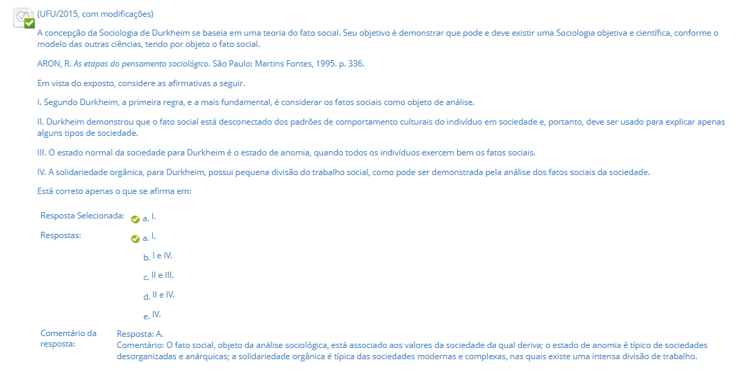 (UFU/2015, com modificações) A concepção da Sociologia de Durkheim se baseia em uma teoria do fato social. Seu objetivo é demonstrar que pode e deve existir uma Sociologia objetiva e científica, conforme modelo das outras ciências, tendo por objeto fato social. ARON, R. As etapas do pensamento sociológico. São Paulo: Martins Fontes, 1995. p. 336. Em vista do exposto, considere as afirmativas a seguir. Segundo Durkheim, a primeira regra, e a mais fundamental, é considerar os fatos sociais como objeto de II. Durkheim demonstrou que fato social está desconectado dos padrões de comportamento culturais do indivíduo em sociedade e, portanto, deve ser usado para explicar apenas alguns tipos de sociedade. III. estado normal da sociedade para Durkheim é estado de anomia, quando todos os indivíduos exercem bem fatos sociais. IV. A solidariedade orgânica, para Durkheim, possui pequena divisão do trabalho social, como pode ser demonstrada pela análise dos fatos sociais da sociedade. Está correto apenas O que se afirma em: Resposta Selecionada: a. Respostas: a. b. IV. III. d. IV. e. IV. Comentário da Resposta: A. resposta: Comentário: fato social, objeto da análise sociológica, está associado aos valores da sociedade da qual deriva; estado de anomia é típico de sociedades desorganizadas e anárquicas; a solidariedade orgânica é típica das sociedades modernas e complexas, nas quais existe uma intensa divisão de trabalho.
