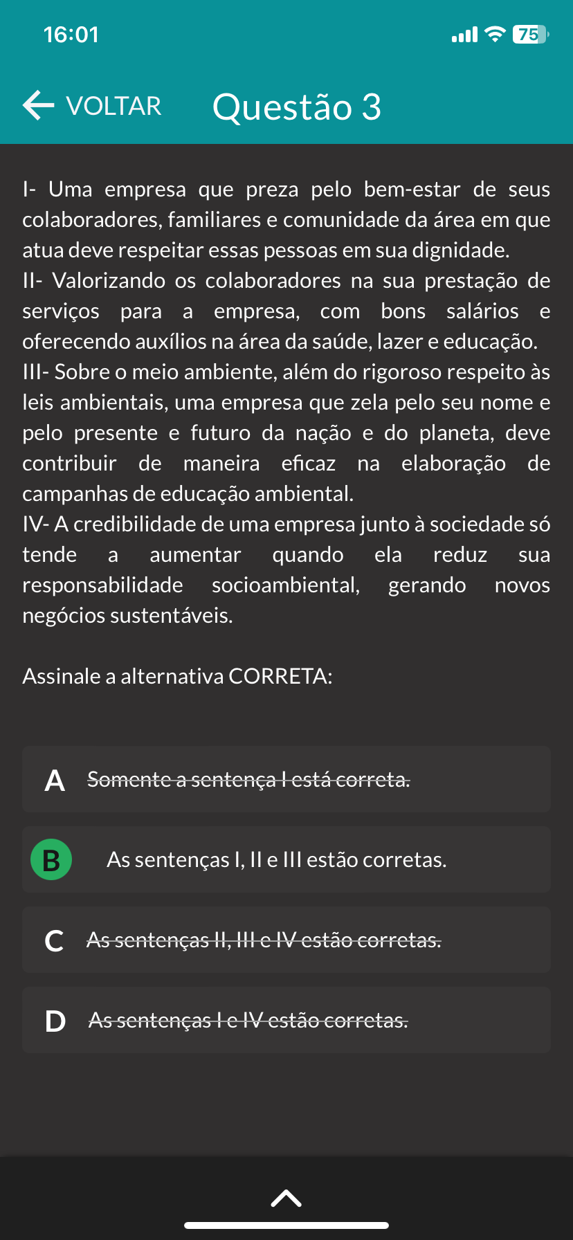 16:01 75 VOLTAR Questão 3 I- Uma empresa que preza pelo bem-estar de seus colaboradores, familiares e comunidade da área em que atua deve respeitar essas pessoas em sua dignidade. II- Valorizando os colaboradores na sua prestação de serviços para a empresa, com bons salários e oferecendo auxílios na área da saúde, lazer e educação. III- Sobre o meio ambiente, além do rigoroso respeito às leis ambientais, uma empresa que zela pelo seu nome e pelo presente e futuro da nação e do planeta, deve contribuir de maneira eficaz na elaboração de campanhas de educação ambiental. IV- A credibilidade de uma empresa junto à sociedade só tende a aumentar quando ela reduz sua responsabilidade socioambiental, gerando novos negócios sustentáveis. Assinale a alternativa CORRETA: A Somente a sentença está correta. B As sentenças I, e III estão corretas. c As sentenças II, e IV estão corretas. D As sentenças le IV estão corretas.