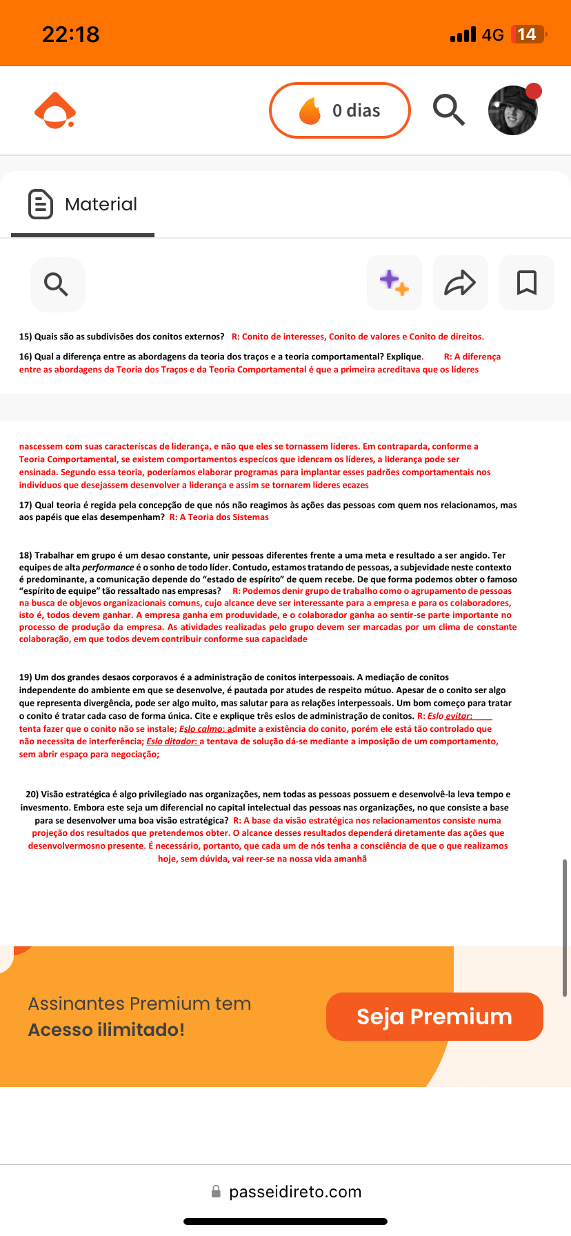 22:18 4G 14 0 dias Material 15) Quais são as subdivisões dos conitos externos? R: Conito de interesses, Conito de valores e Conito de direitos. 16) Qual a diferença entre as abordagens da teoria dos traços e a teoria comportamental? Explique. R: A diferença entre as abordagens da Teoria dos Traços e da Teoria Comportamental é que a primeira acreditava que os líderes nascessem com suas caracteríscas de liderança, e não que eles se tornassem líderes. Em contraparda, conforme a Teoria Comportamental, se existem comportamentos especícos que idencam os líderes, a liderança pode ser ensinada. Segundo essa teoria, poderíamos elaborar programas para implantar esses padrões comportamentais nos indivíduos que desejassem desenvolver a liderança e assim se tornarem líderes ecazes 17) Qual teoria é regida pela concepção de que nós não reagimos às ações das pessoas com quem nos relacionamos, mas aos papéis que elas desempenham? R: A Teoria dos Sistemas 18) Trabalhar em grupo é um desao constante, unir pessoas diferentes frente a uma meta e resultado a ser angido. Ter equipes de alta performance é sonho de todo lider. Contudo, estamos tratando de pessoas, a subjevidade neste contexto é predominante, a comunicação depende do "estado de espírito" de quem recebe. De que forma podemos obter famoso de equipe" tão ressaltado nas empresas? R: Podemos denir grupo de trabalho como agrupamento de pessoas na busca de objevos organizacionais comuns, cujo alcance deve ser interessante para a empresa e para os colaboradores, isto é, todos devem ganhar. A empresa ganha em produvidade, e colaborador ganha ao sentir-se parte importante no processo de produção da empresa. As atividades realizadas pelo grupo devem ser marcadas por um clima de constante colaboração, em que todos devem contribuir conforme sua capacidade 19) Um dos grandes desaos corporavos é a administração de conitos interpessoais. A mediação de conitos independente do ambiente em que se desenvolve, é pautada por atudes de respeito mútuo. Apesar de conito ser algo que representa divergência, pode ser algo muito, mas salutar para as relações interpessoais. Um bom começo para tratar conito é tratar cada caso de forma única. Cite e explique três eslos de administração de conitos. R: Eslo evitar: tenta fazer que conito não se instale; calmo: admite a existência do conito, porém ele está tão controlado que não necessita de interferência; Eslo ditador: tentava de solução dá-se mediante a imposição de um comportamento, sem abrir espaço para negociação; 20) Visão estratégica é algo privilegiado nas organizações, nem todas as pessoas possuem e desenvolvê-la leva tempo e invesmento. Embora este seja um diferencial no capital intelectual das pessoas nas organizações, no que consiste a base para se desenvolver uma boa visão estratégica? R: A base da visão estratégica nos relacionamentos consiste numa projeção dos resultados que pretendemos obter. alcance desses resultados dependerá diretamente das ações que desenvolvermosno presente. É necessário, portanto, que cada um de nós tenha a consciência de que que realizamos hoje, sem dúvida, vai reer-se na nossa vida amanhã Assinantes Premium tem Acesso ilimitado! Seja Premium passeidireto.com